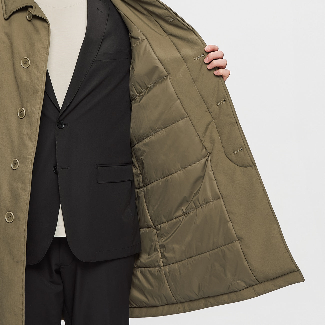 The padding volume is adjusted to create a slight A-line shape, which prevents bunching over a jacket and provides a sophisticated casual look.