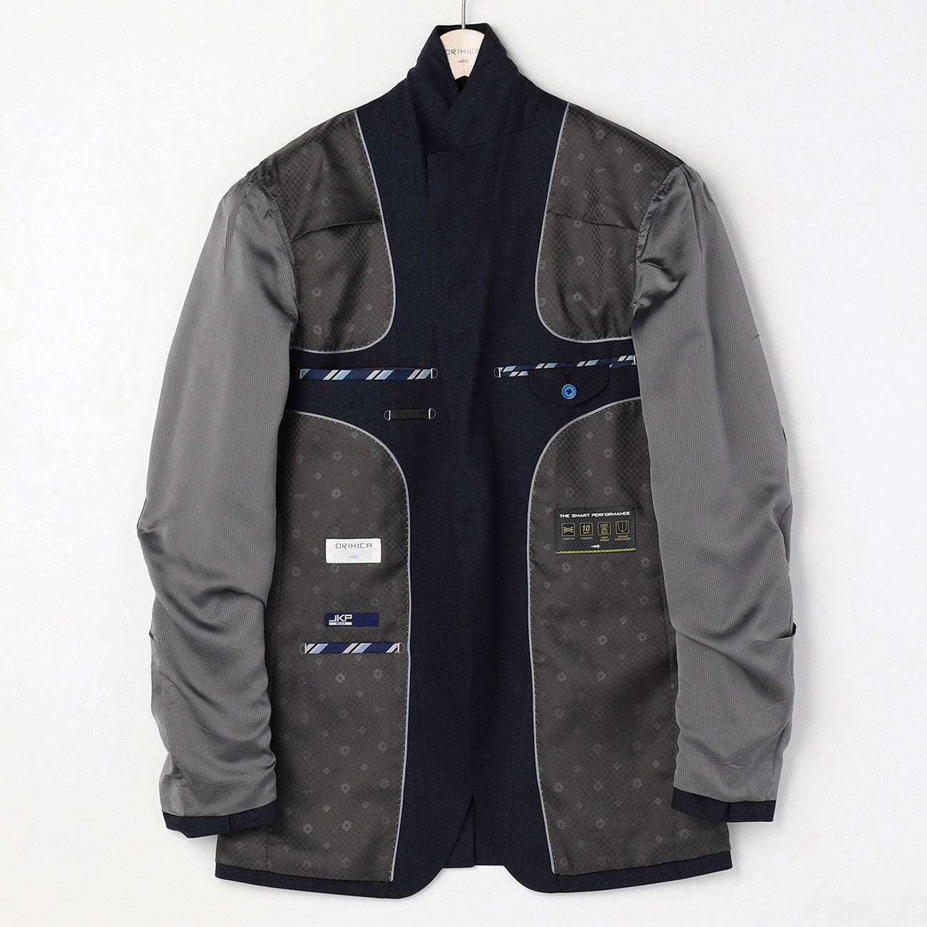 - Jacket: 2-button closure, center vent, non-functional buttons, half-lined. Pants: flat front.