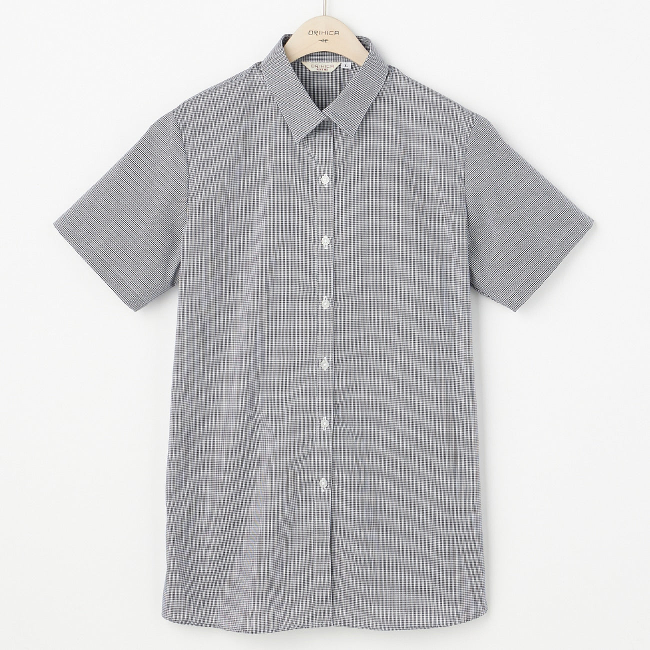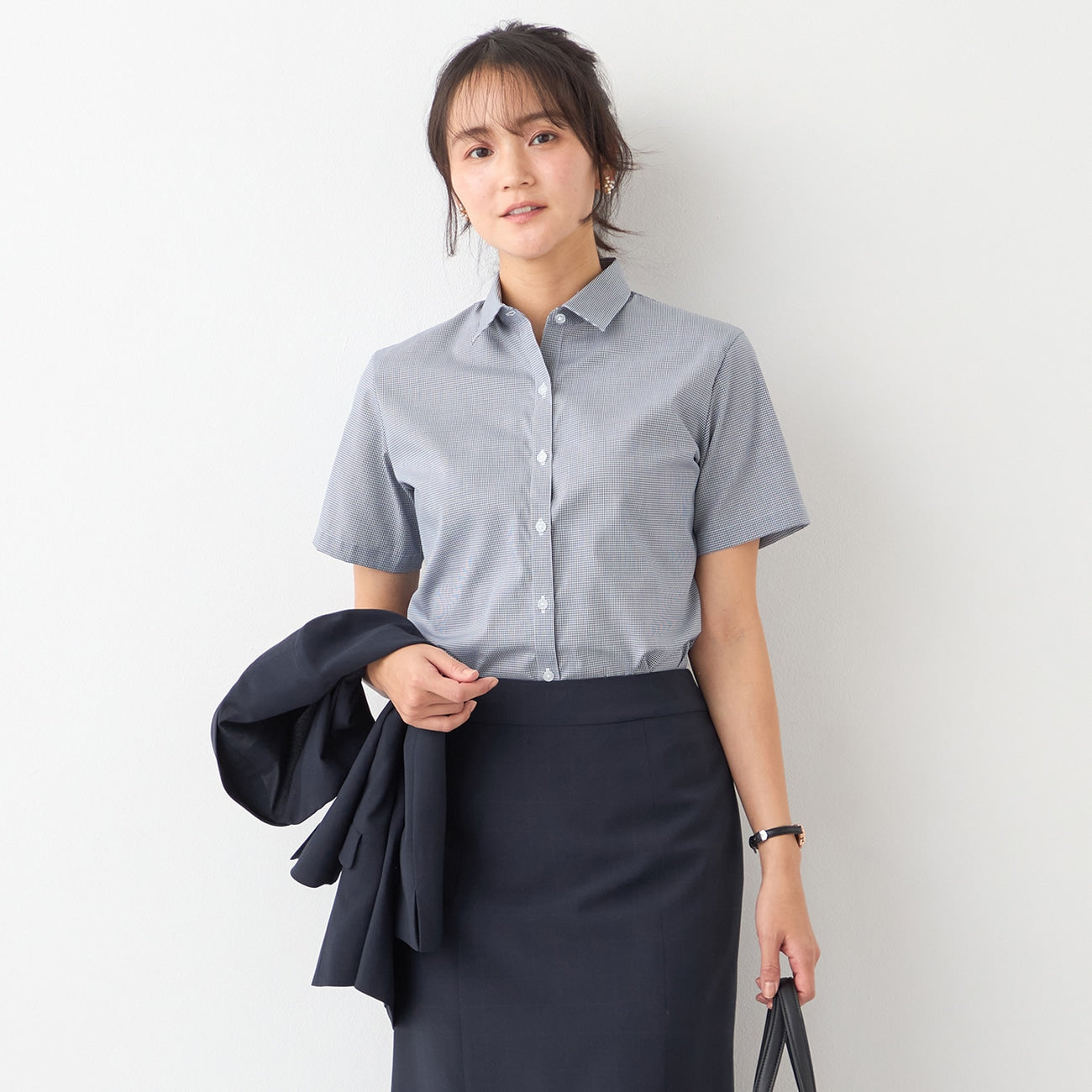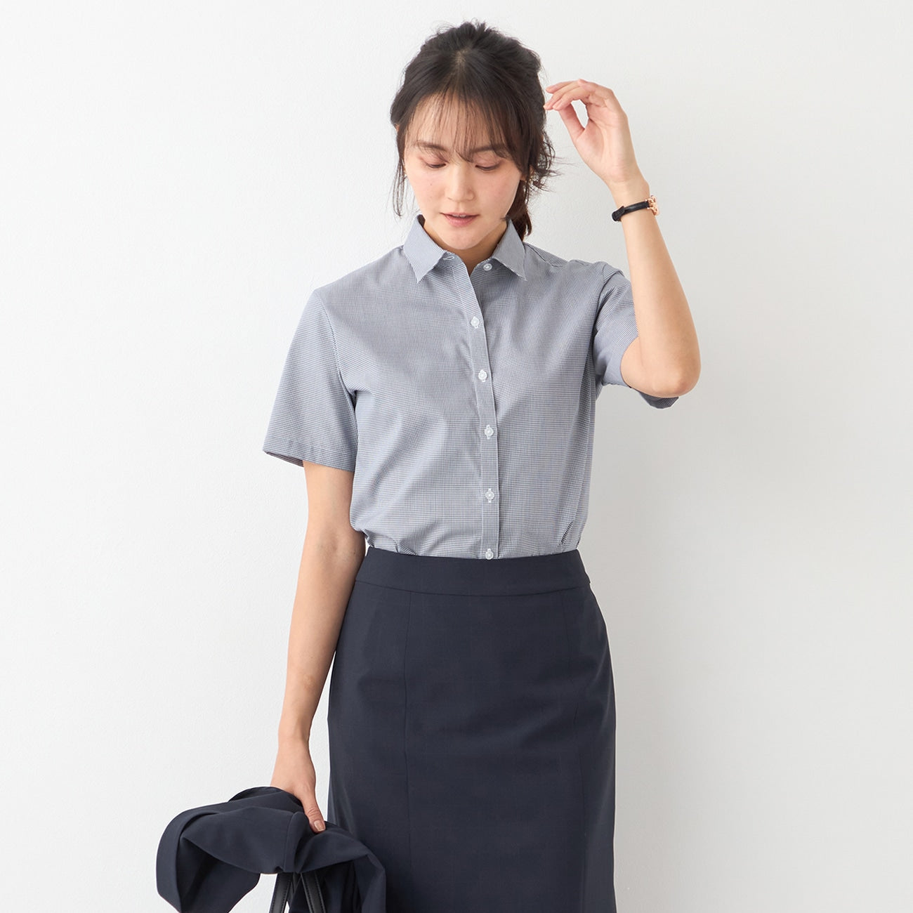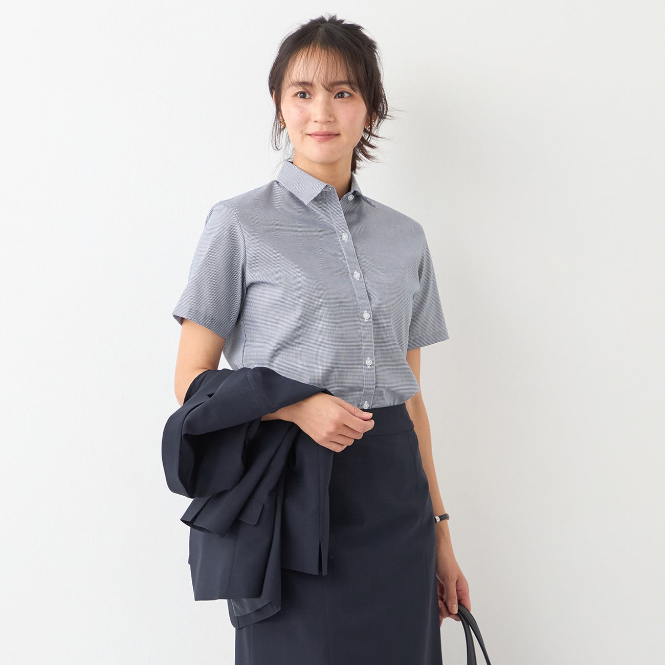 Women's Super Non-Iron Cotton Check Short Sleeve Point Collar Shirt - Navy