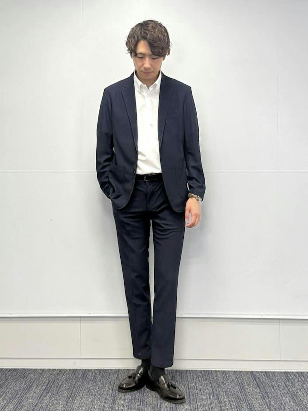 Two buttons, chest pocket, waist pockets, left inner pocket