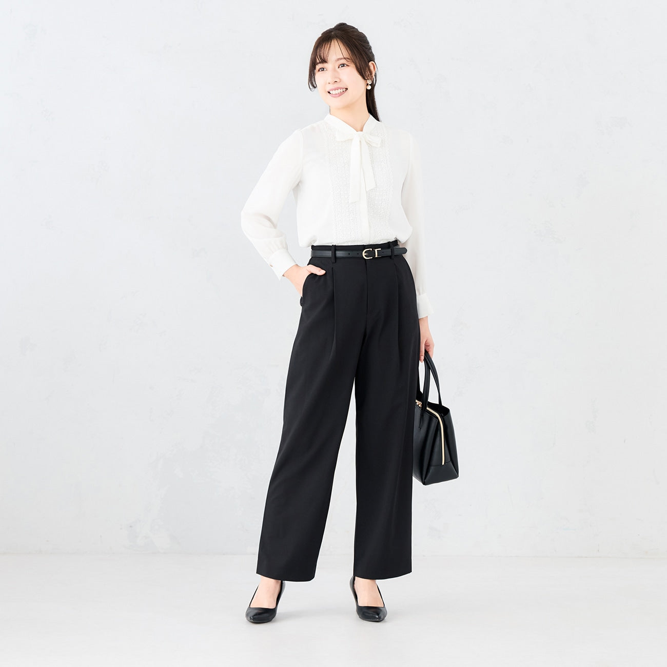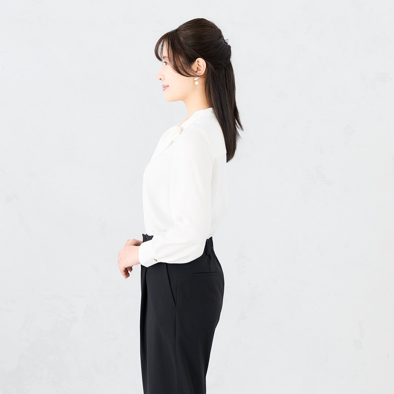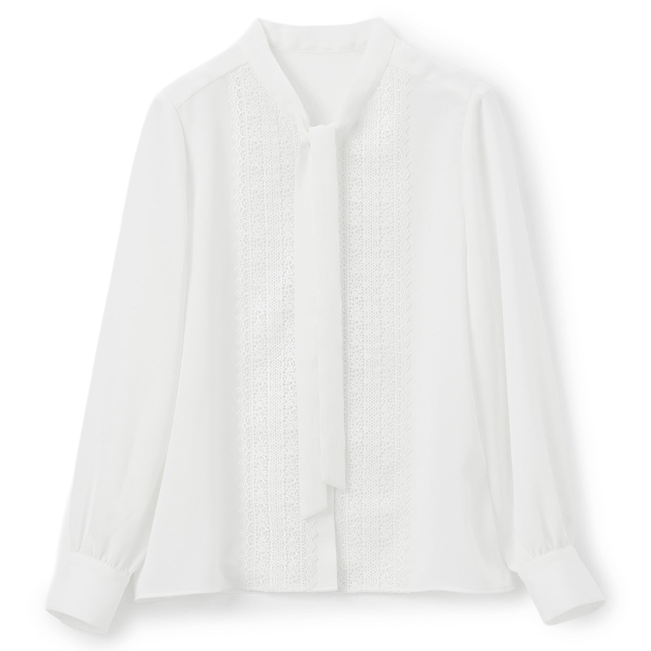 Elegant sheer feeling and lace use brighten and color gorgeously around the face. Even when wearing a jacket, the lace peeking from the chest enhances the sense of class. The freely arranging bow tie changes its expression according to the scene and always fulfills the ideal style.