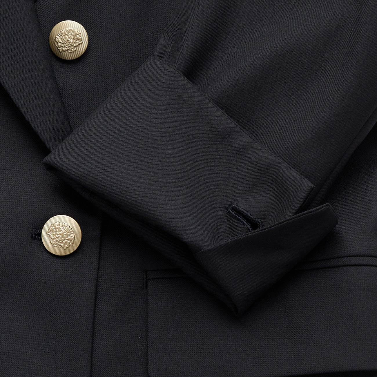 Double-breasted, half-lined, flower hole, waist pockets, inner pockets, 1 button cuffs