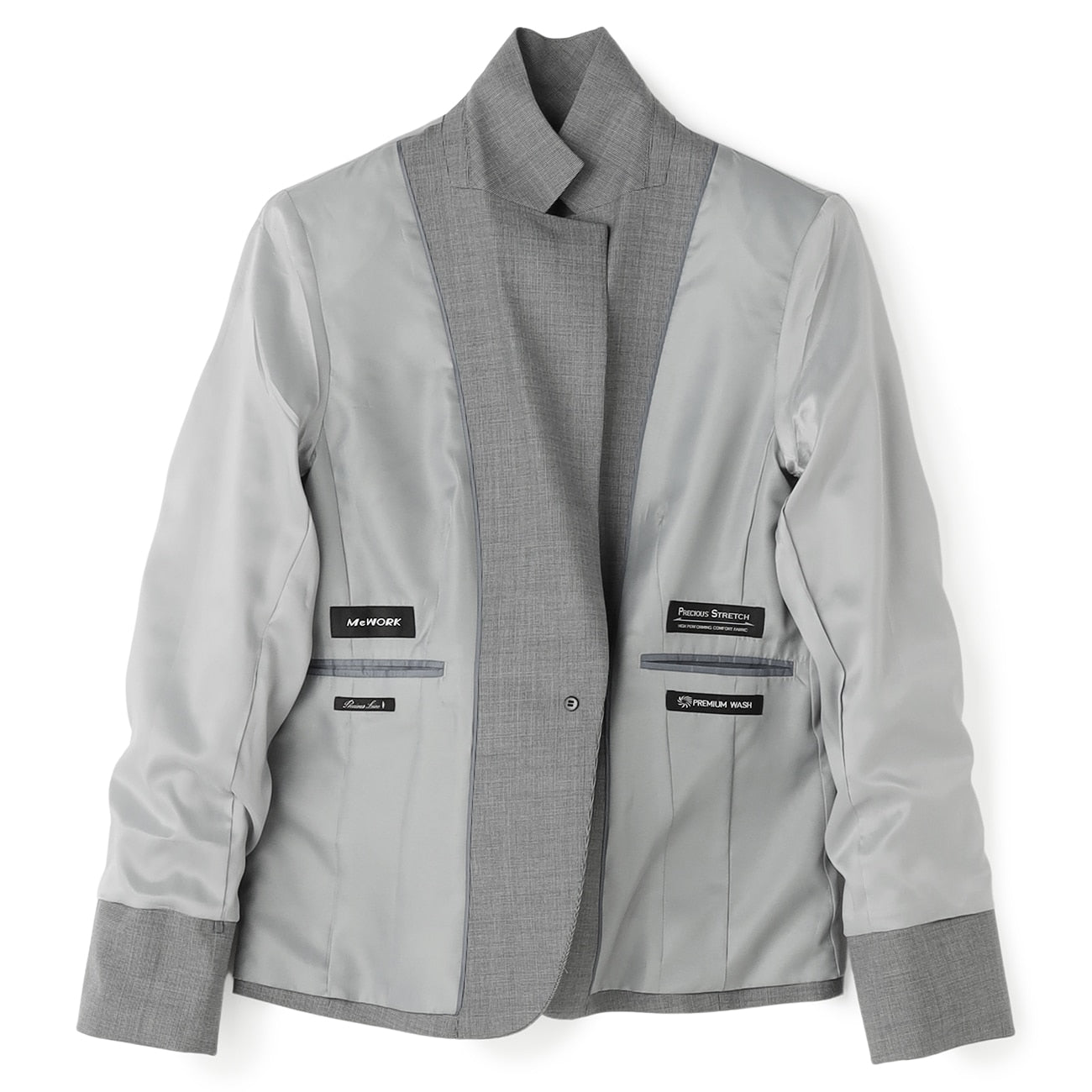 西裝外套1顆鈕扣、部分內裏、袖口可反折、胸前、腰側有口袋、內側有口袋