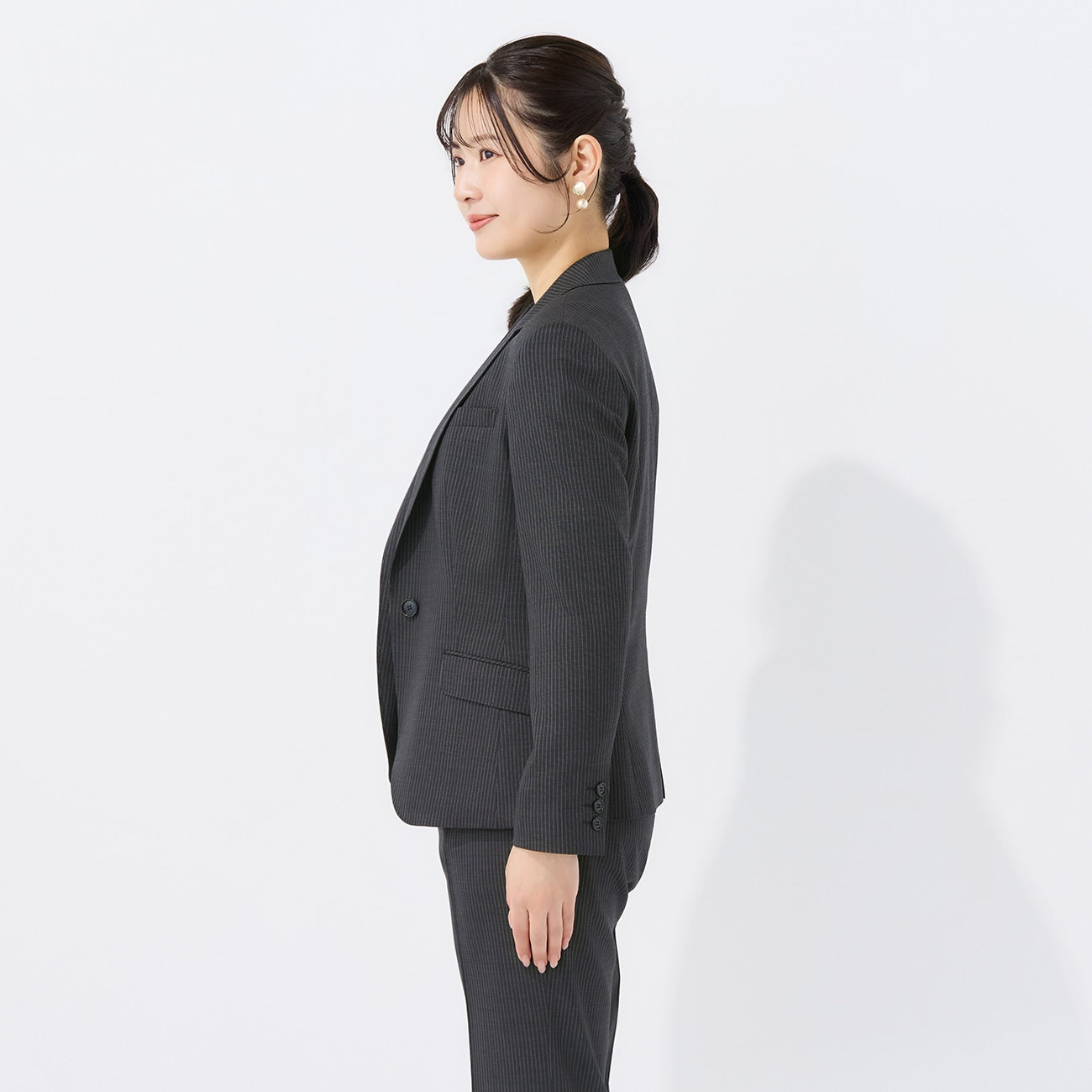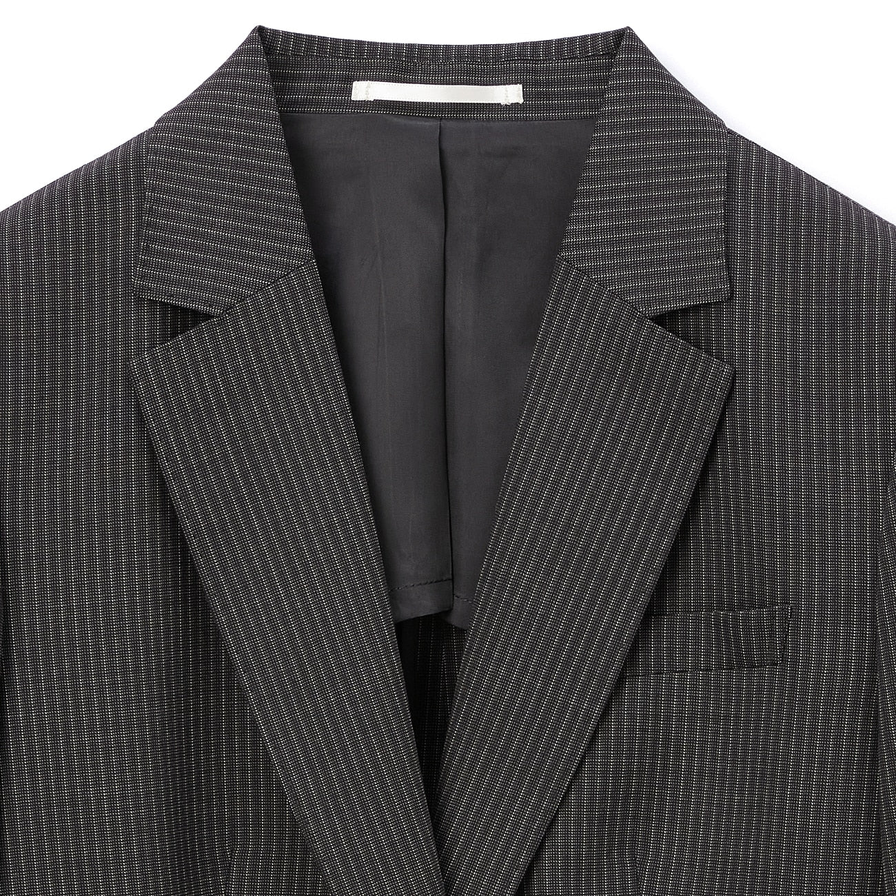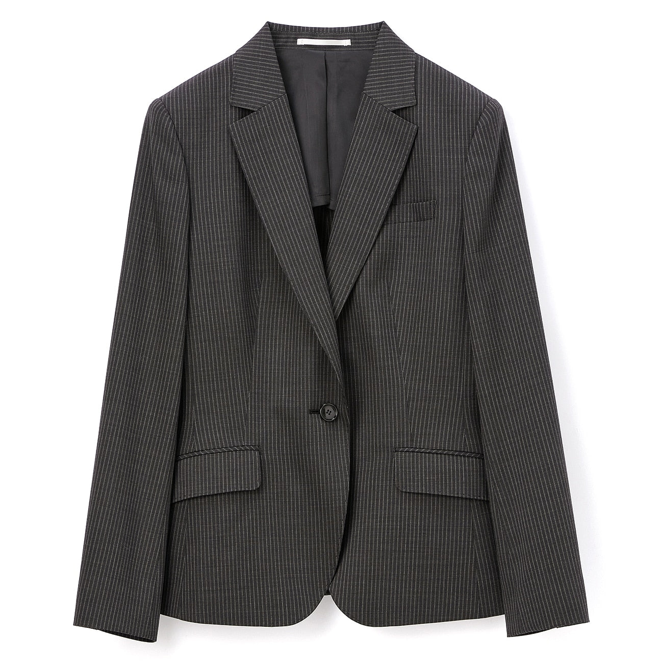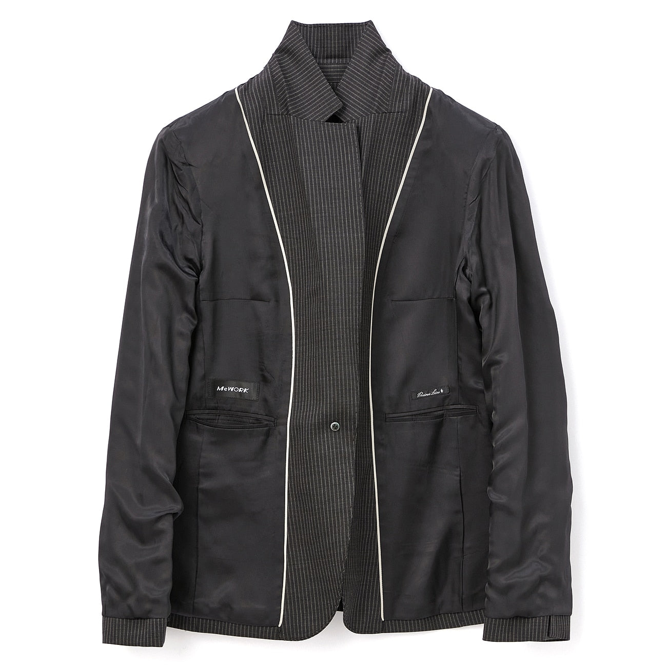 西裝外套1顆鈕扣/半內裏/袖口假扣眼/胸前、腰側有口袋/內側有口袋