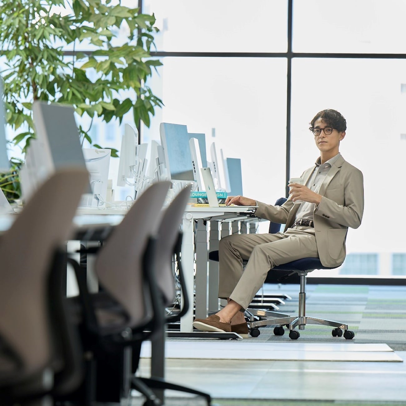 Crafted from a premium, high-stretch material with excellent recovery, this suit offers a cooling sensation upon contact and a stress-free, breathable fit. Its elegant sheen and soft texture ensure a professional look that fits seamlessly into any office environment.