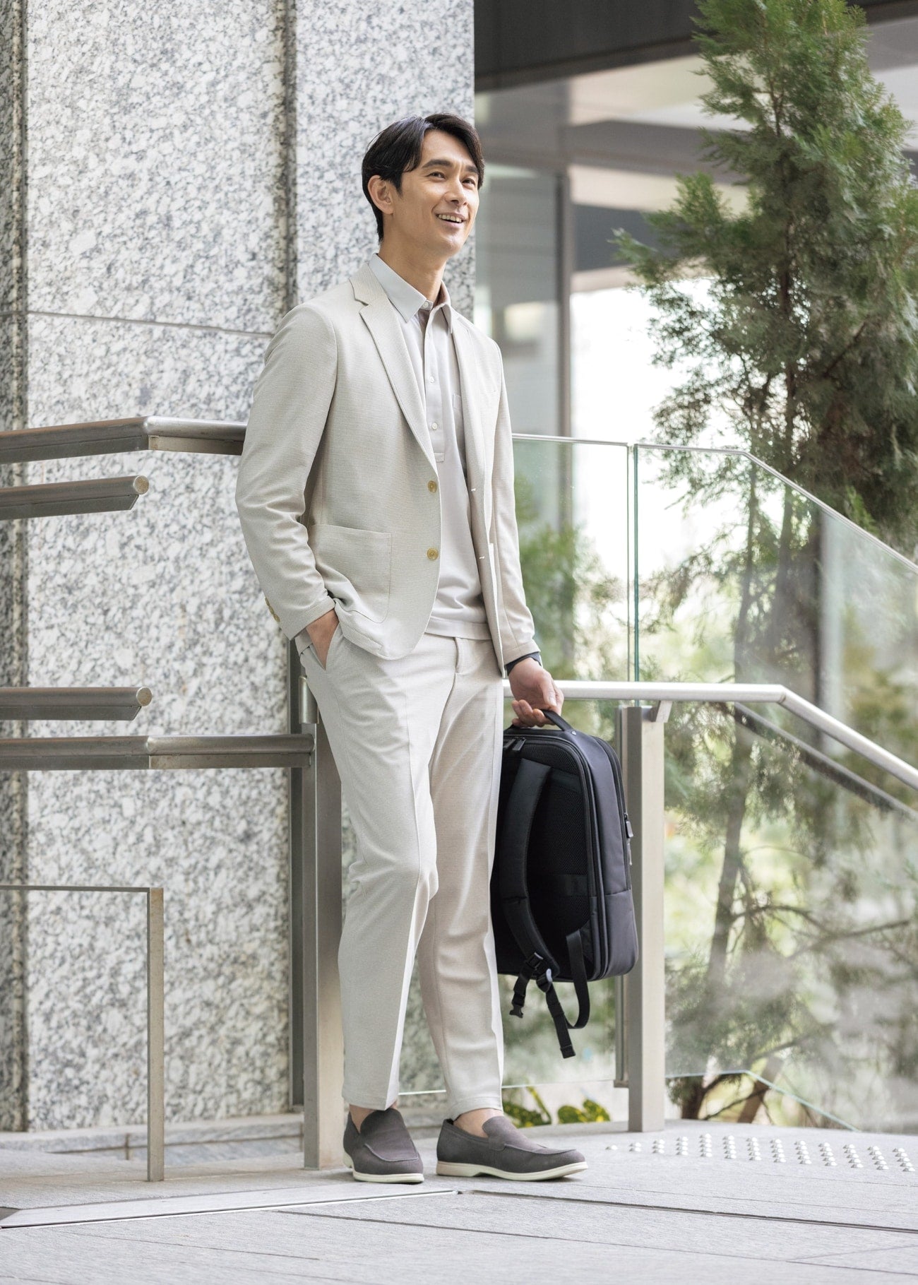 ・混色纱为西装外套增添细致层次,轻松穿出自在氛围。
