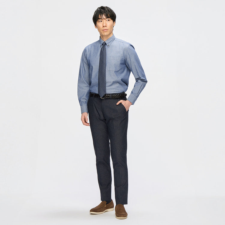 领口与衣身前侧使用柔软衬芯,略宽版型好活动,衬衫衣长精心计算,扎与不扎都俐落。