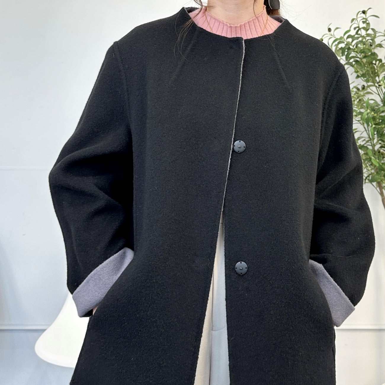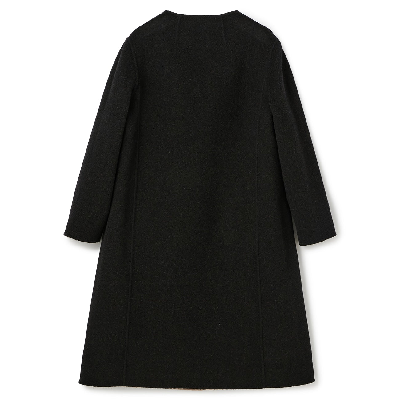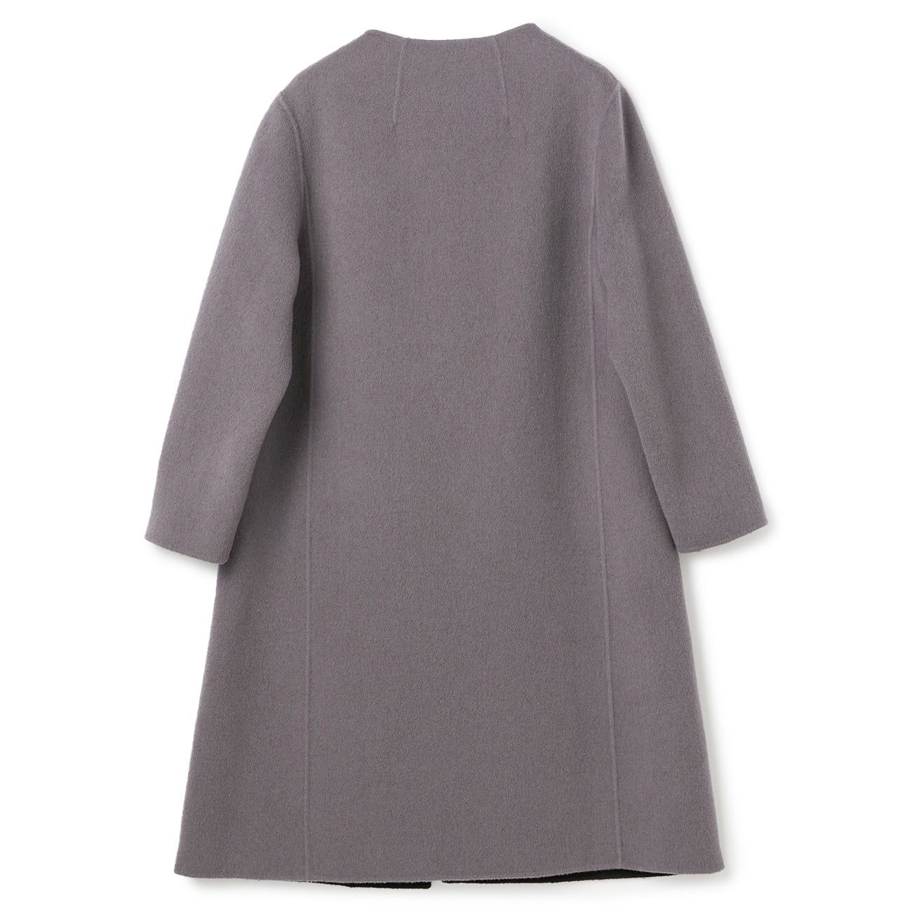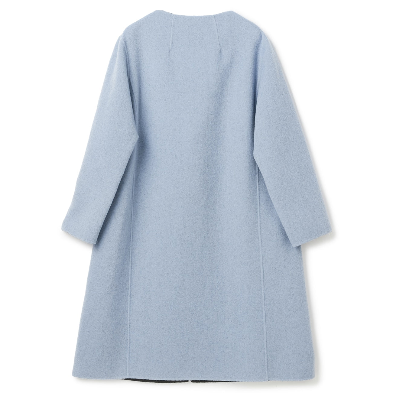 No-collar design that makes the face look clean and bright. Excellent compatibility with scarves and turtle necks. Trendy drop shoulders and relaxed silhouette gently wrap the body for relaxed comfort. Can be worn beautifully by anyone regardless of body type.