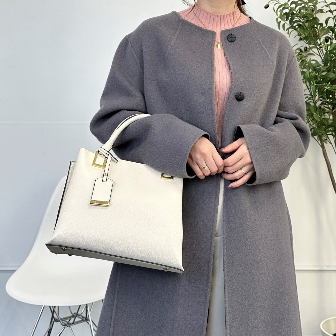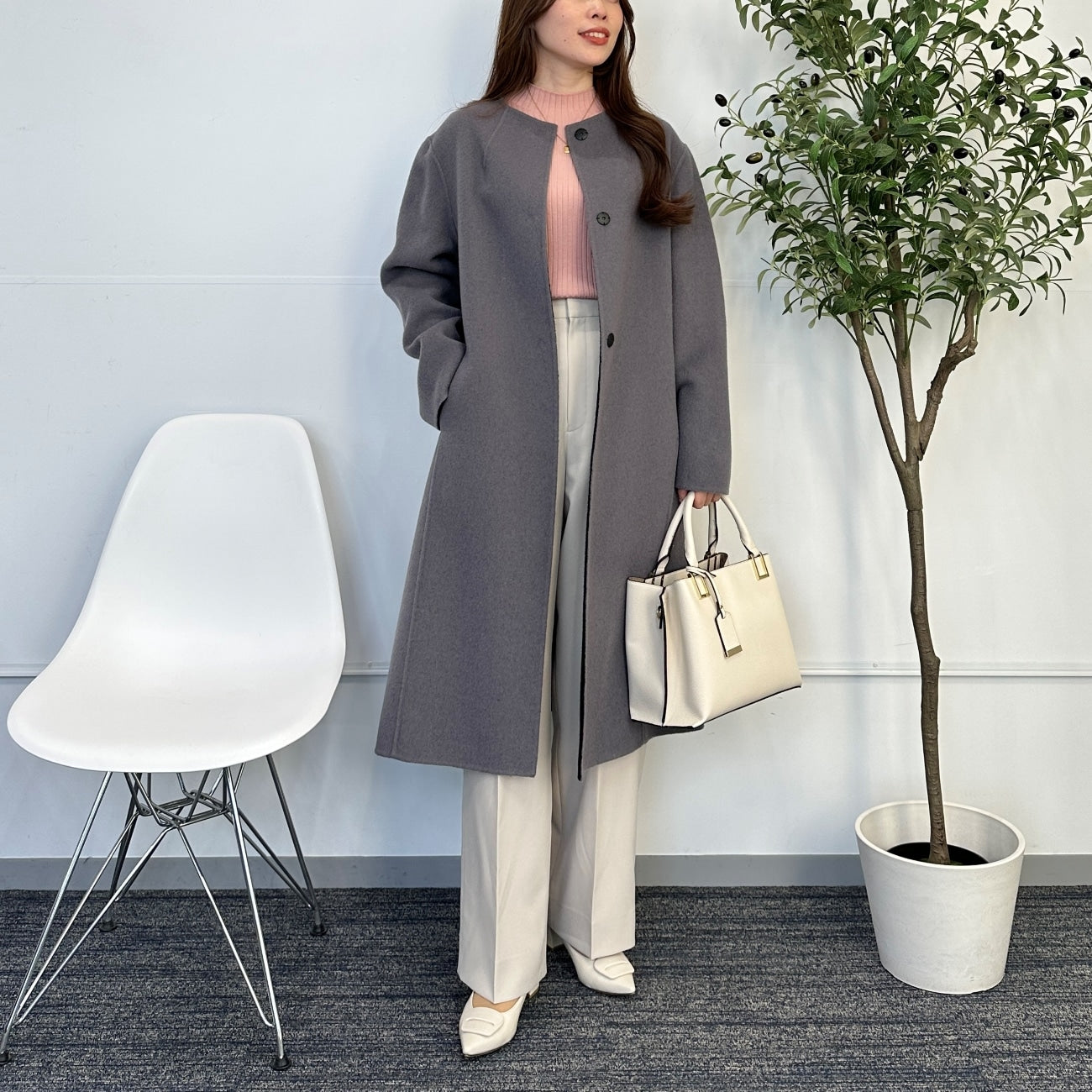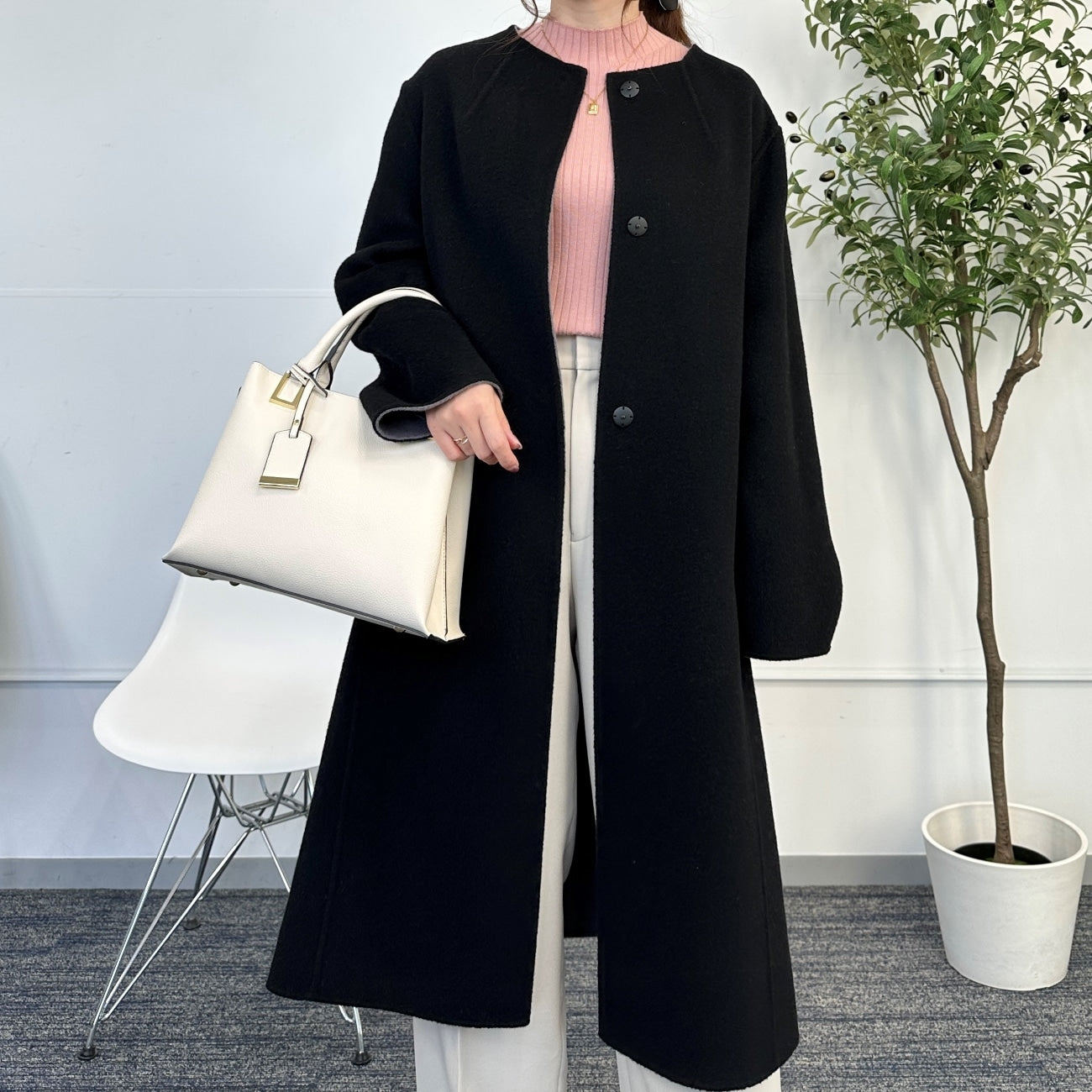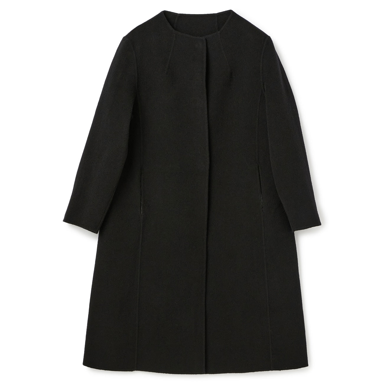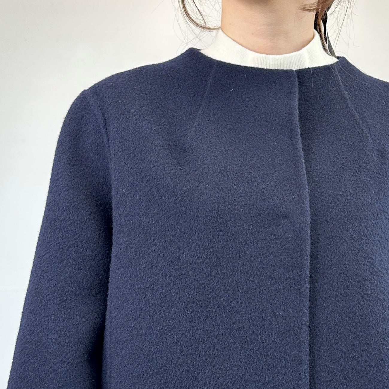 No-collar design that makes the face look clean and bright. Excellent compatibility with scarves and turtle necks. Trendy drop shoulders and relaxed silhouette gently wrap the body for relaxed comfort. Can be worn beautifully by anyone regardless of body type.