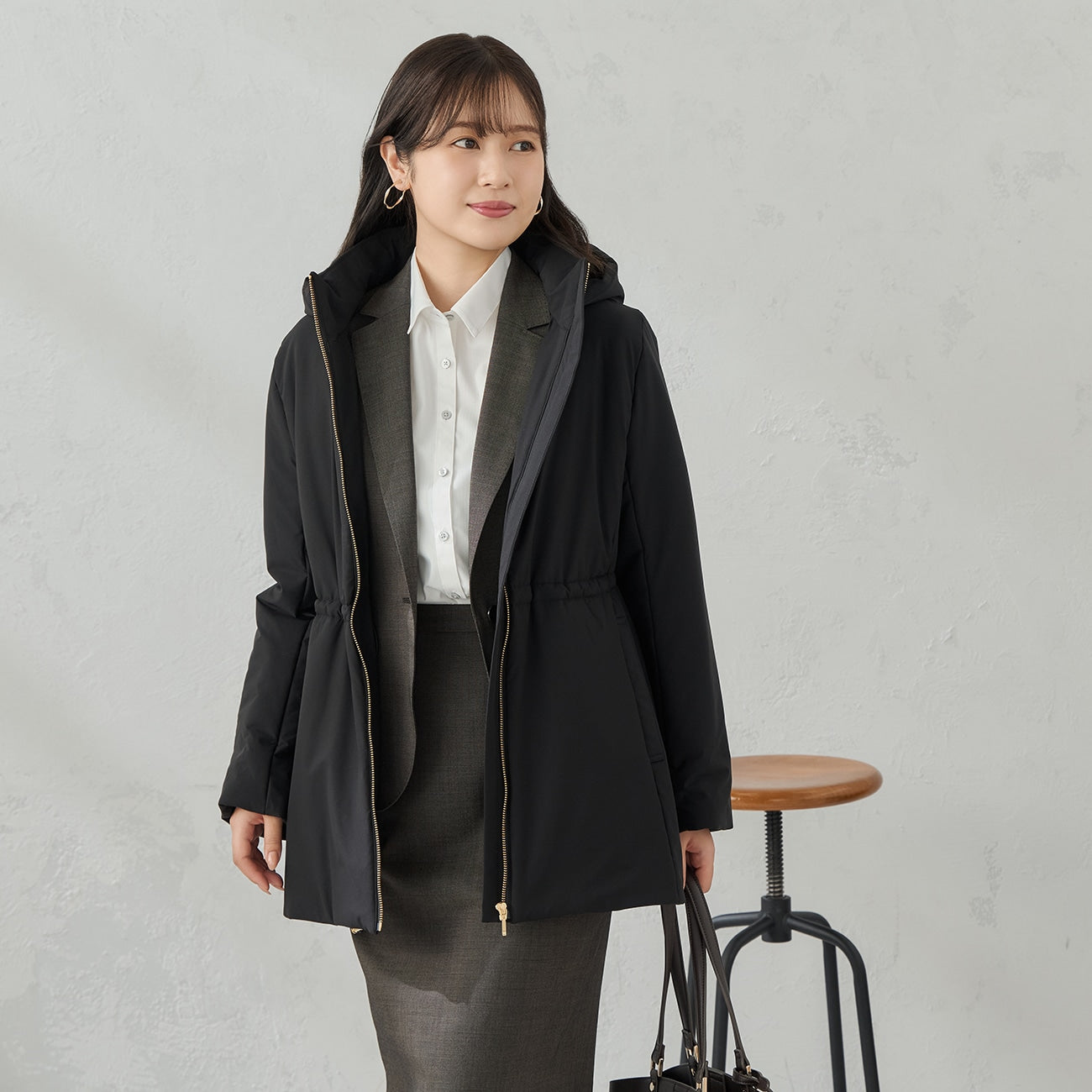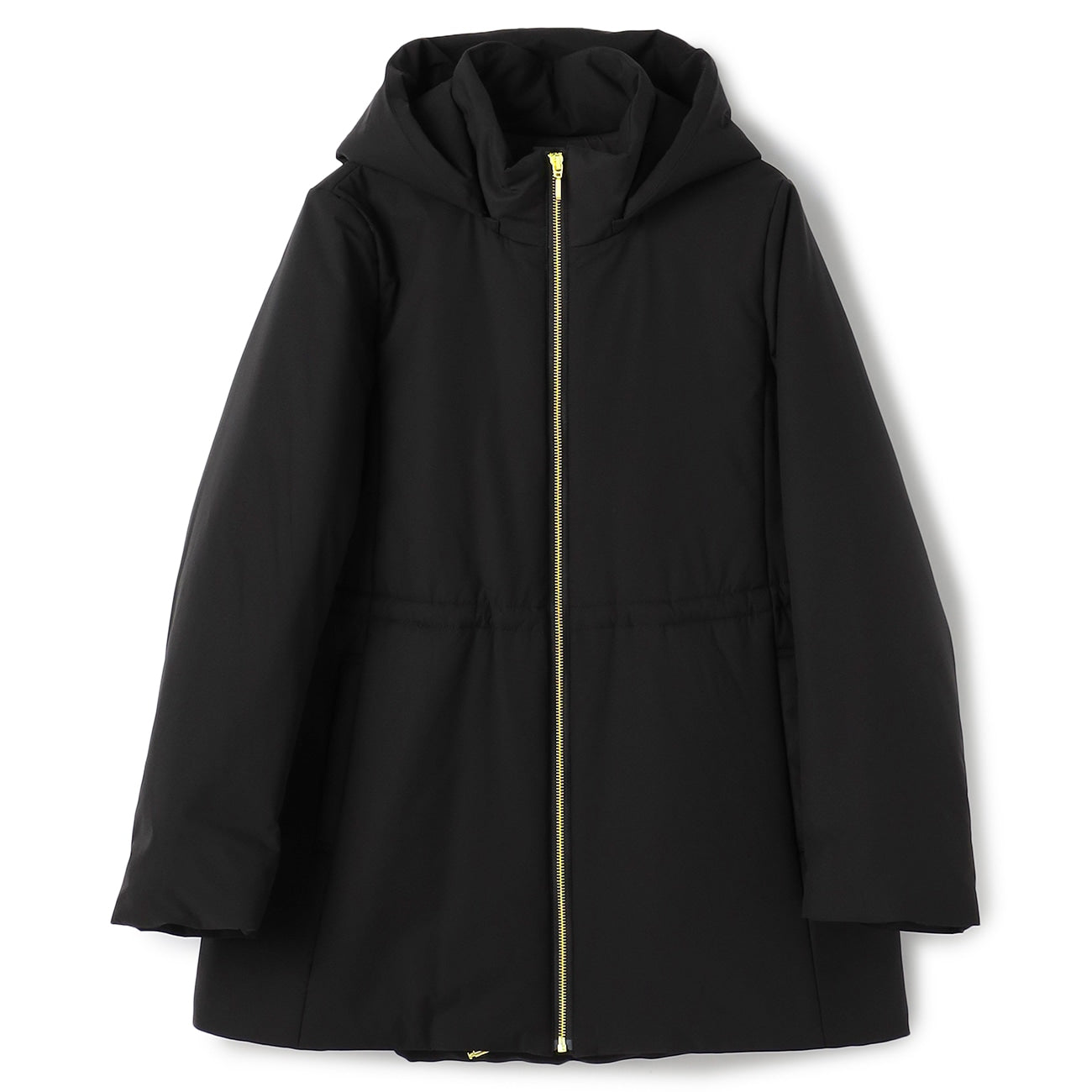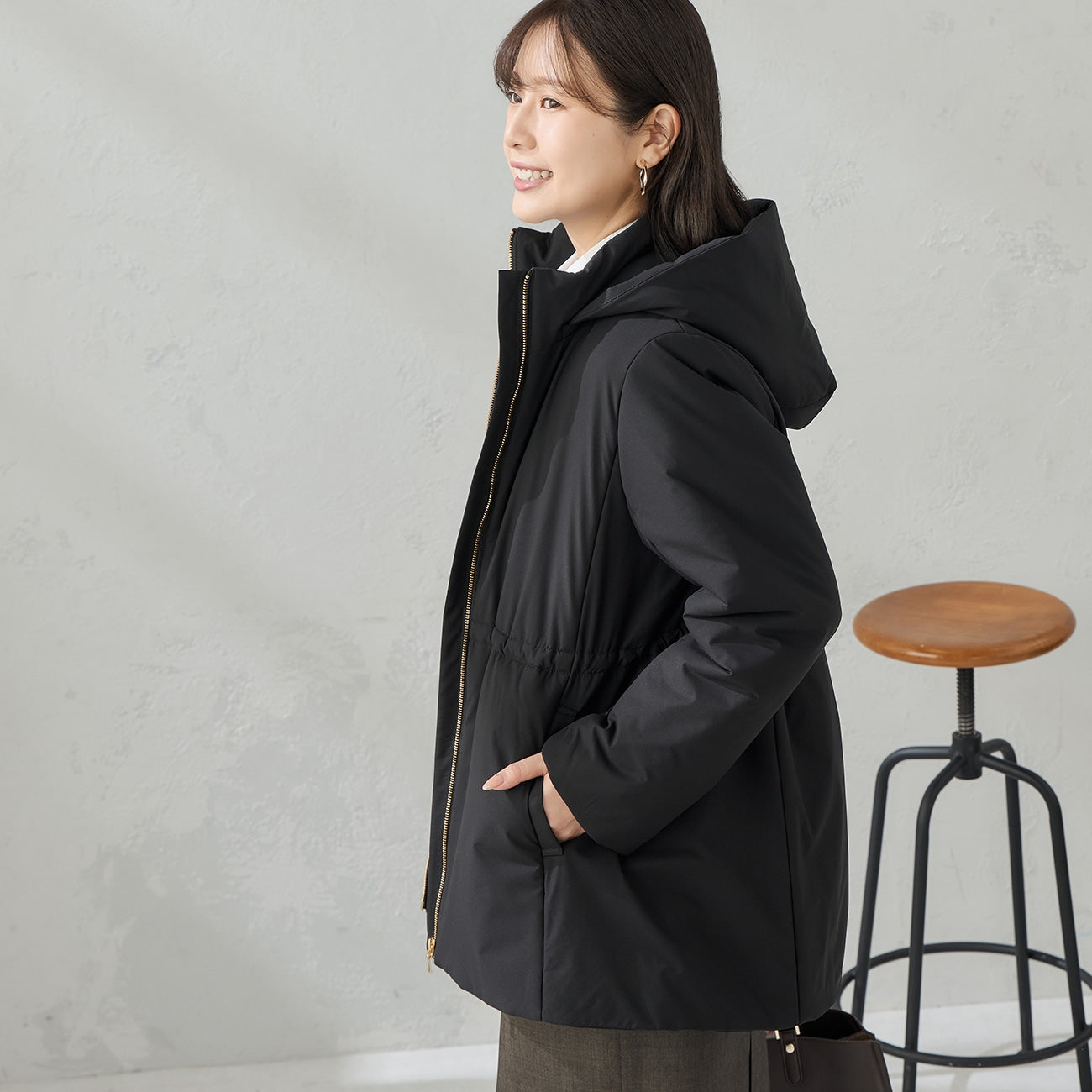 The stitch-free seamless down design creates a soft impression. Adjust the silhouette with waist and hem drawstrings. The voluminous hood is balanced to provide a slimming effect on the face.