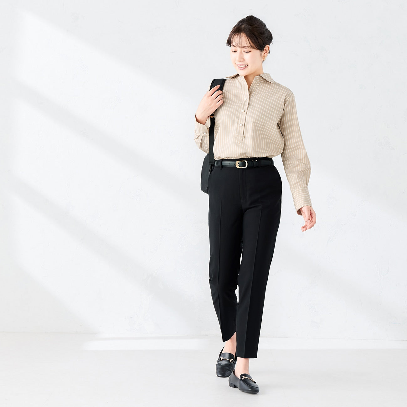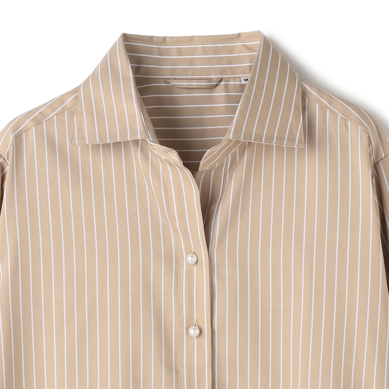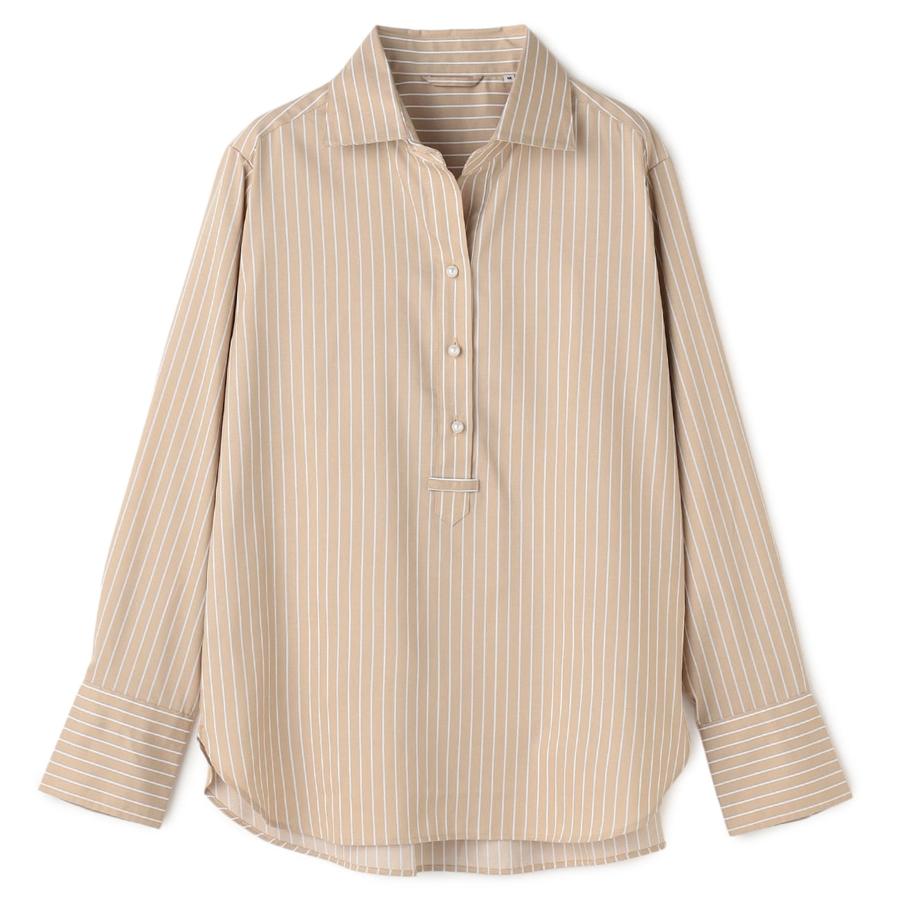 Elegant pearl buttons that are neither too small nor too big. The cuffs are switched to a border pattern to add a sharp expression to the hands. The length covering the hips and round hem look stylish whether tucked in or out.