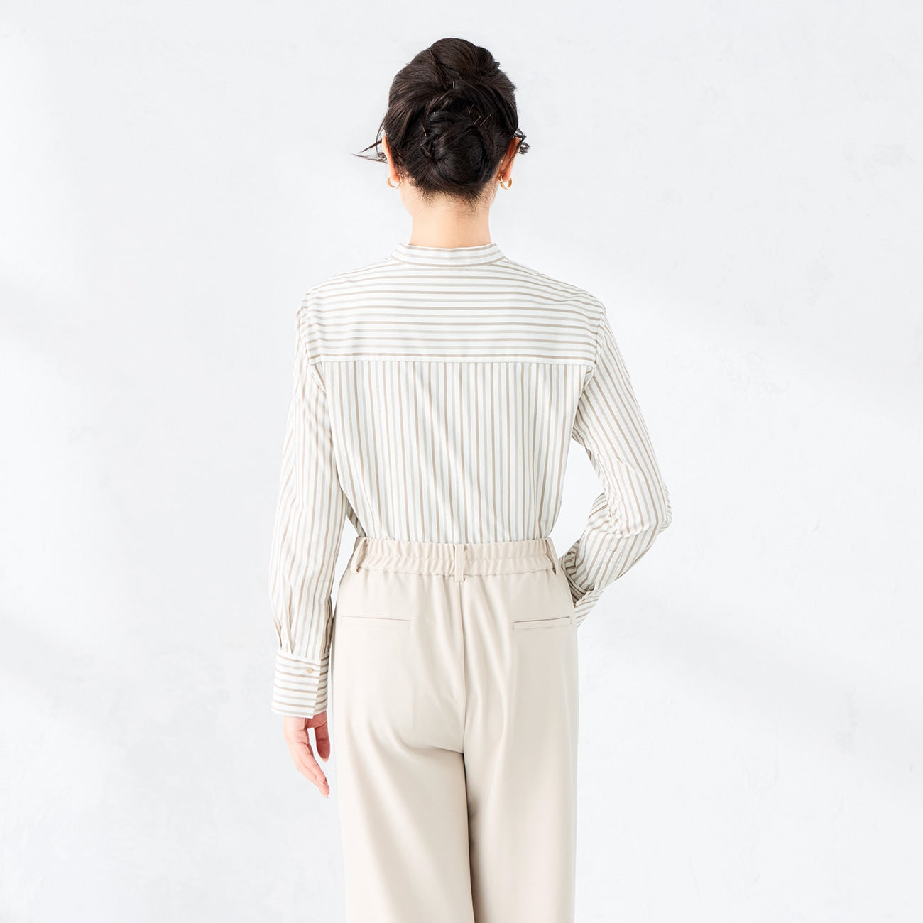 A refined band collar blouse that creates a sleek, elongating silhouette.