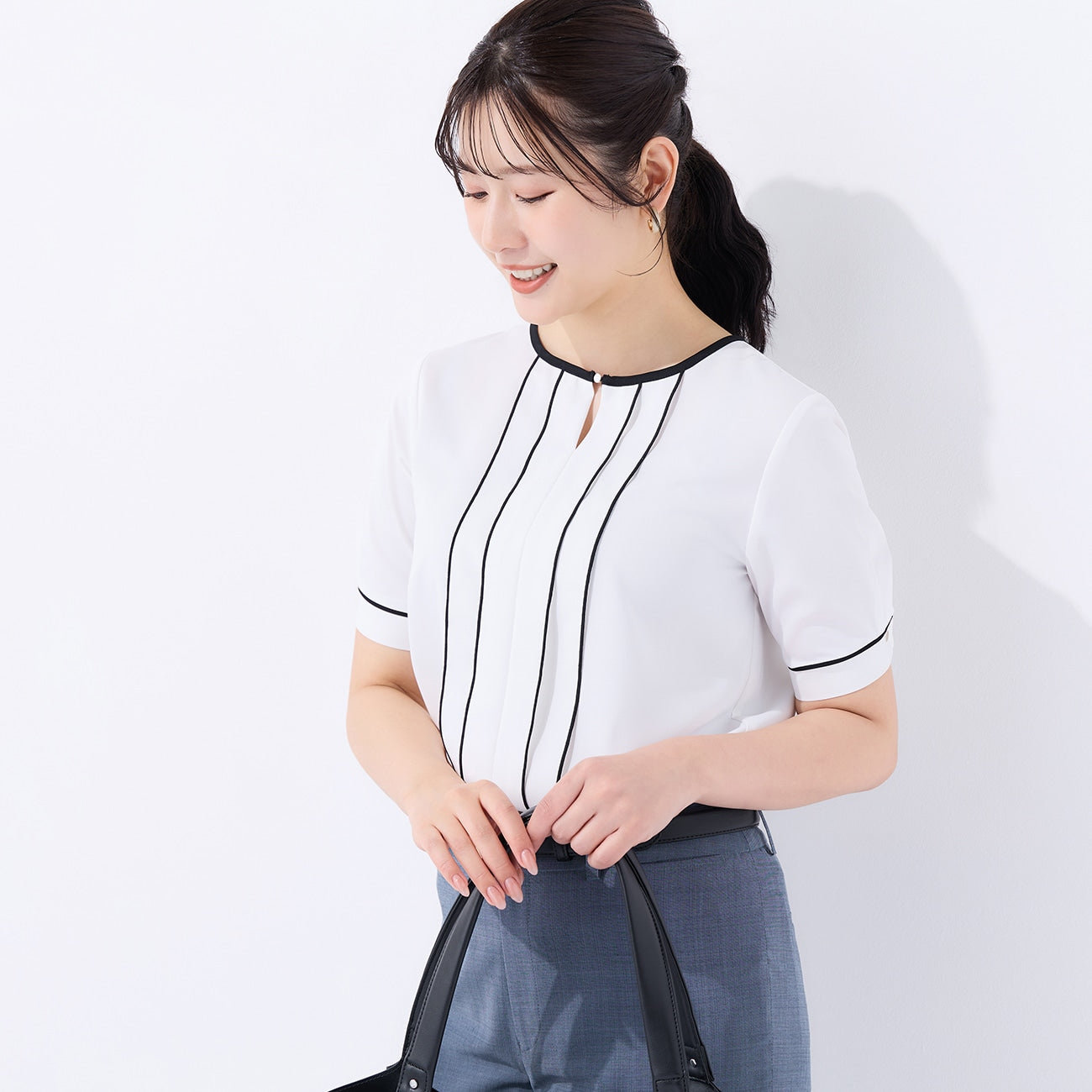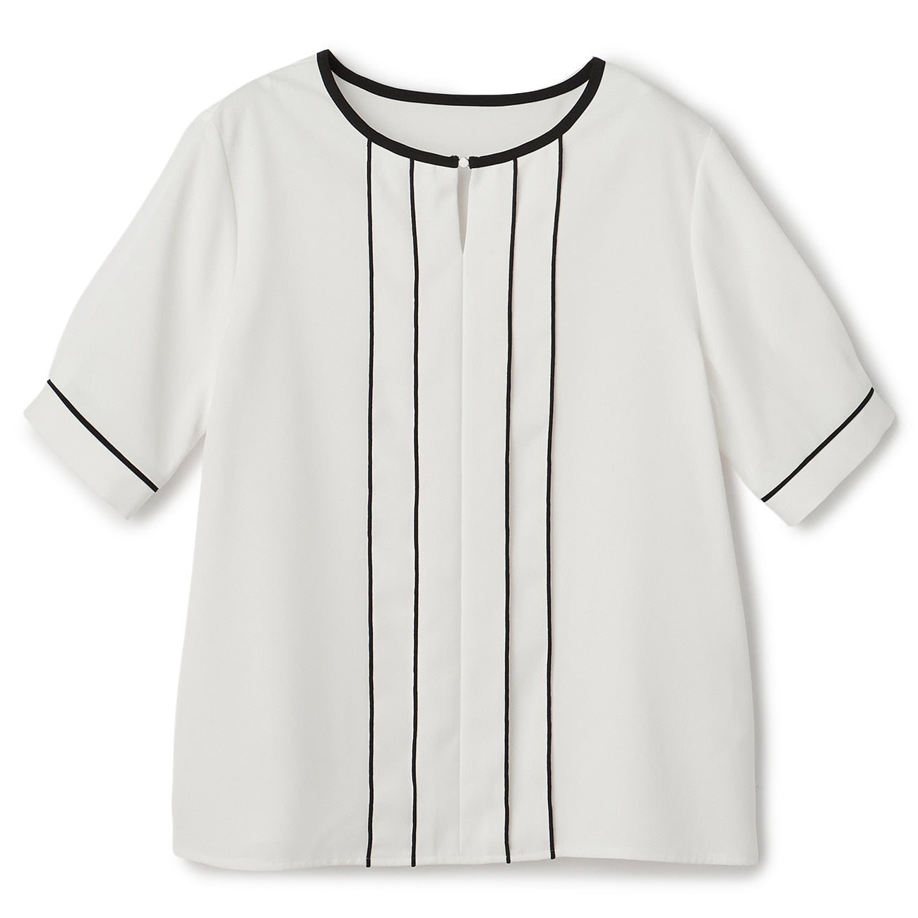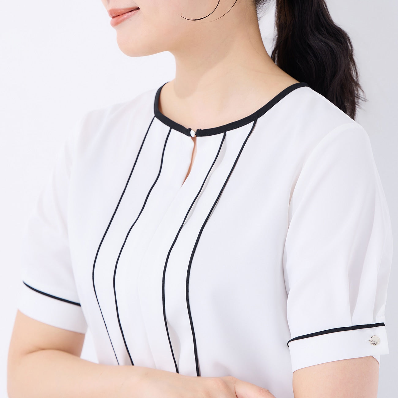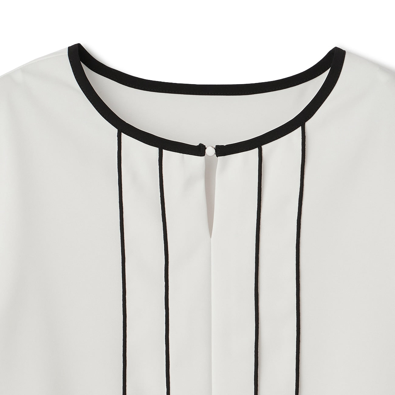 - A short sleeve blouse with delicate contrast mellow lines that create a slimming effect and a sheer-reducing design for peace of mind.