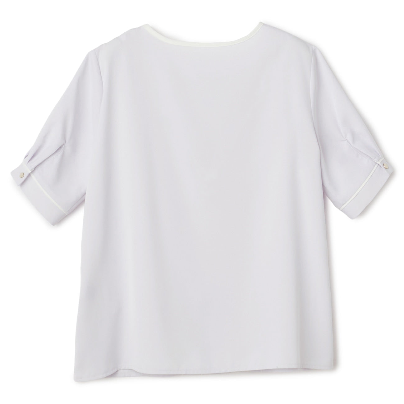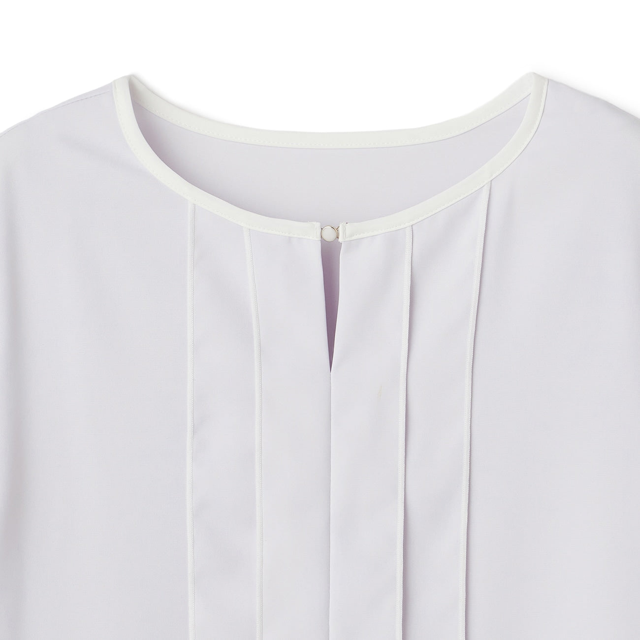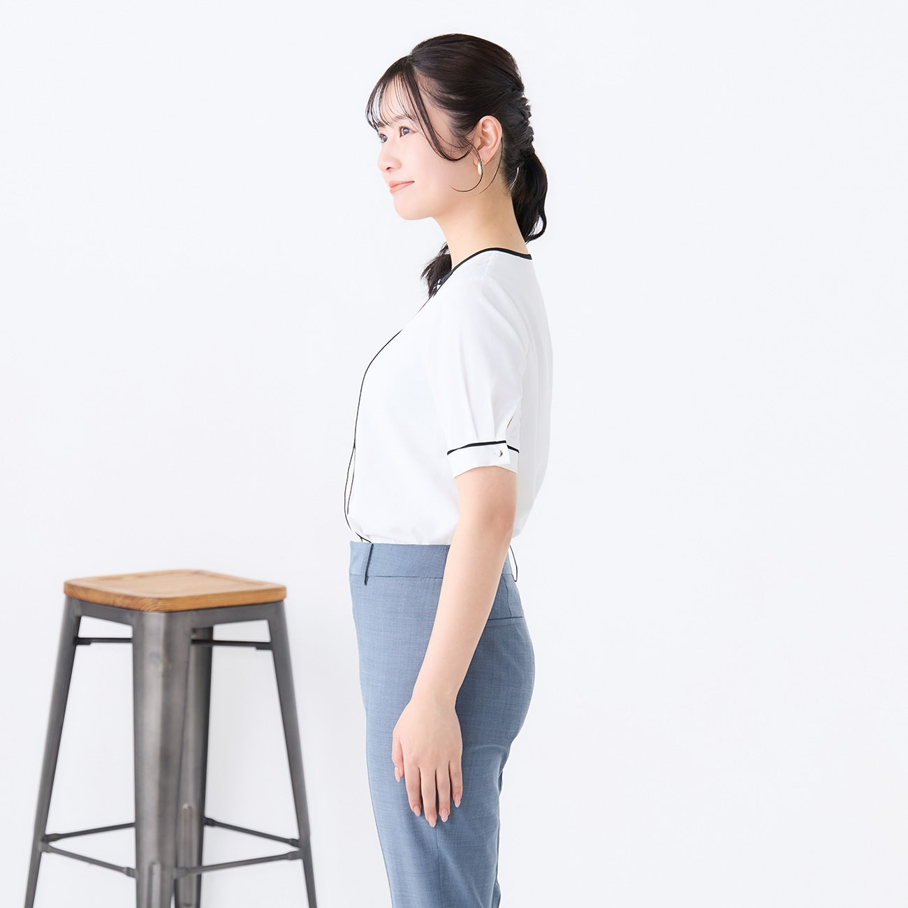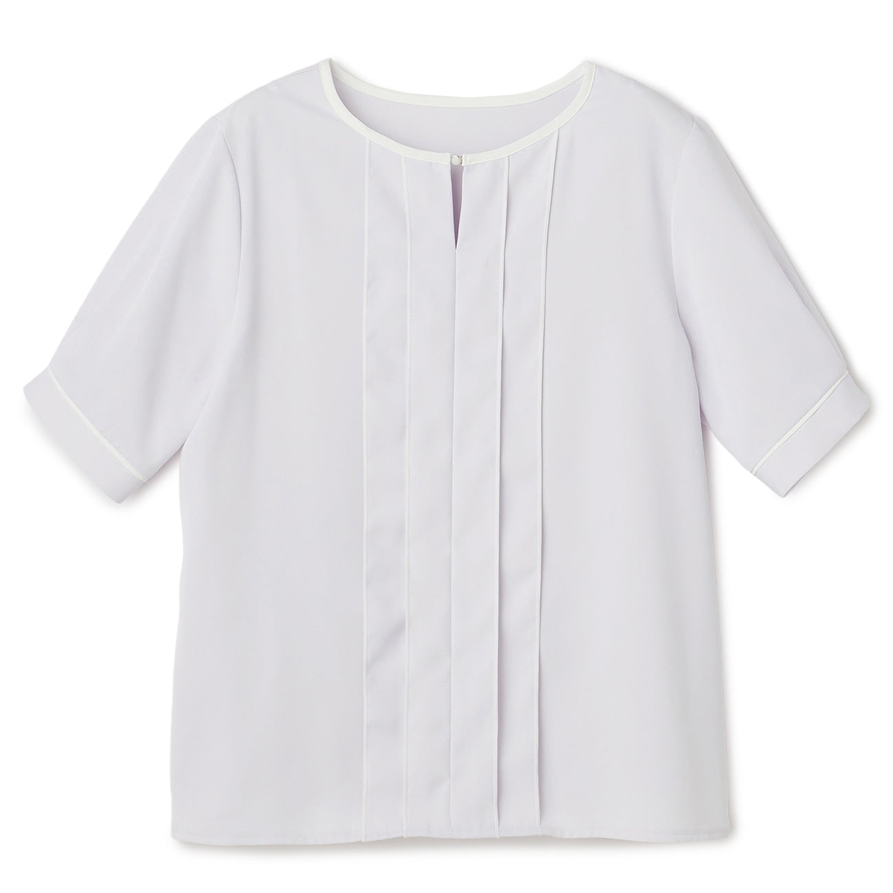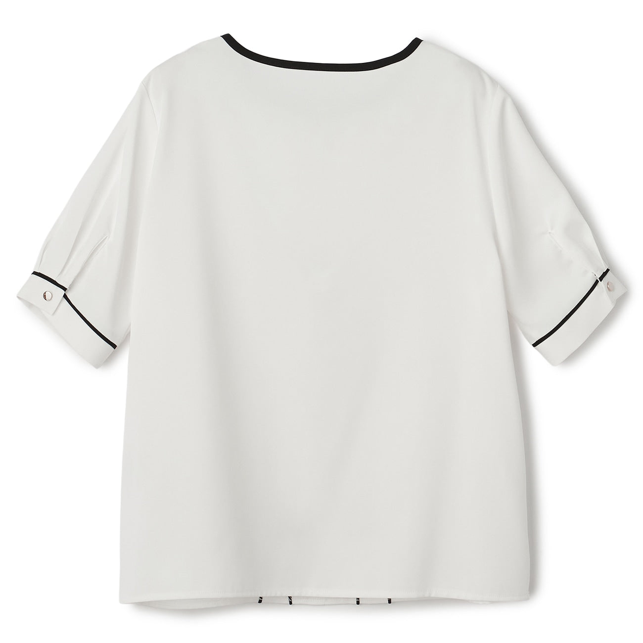 - A short sleeve blouse with delicate contrast mellow lines that create a slimming effect and a sheer-reducing design for peace of mind.