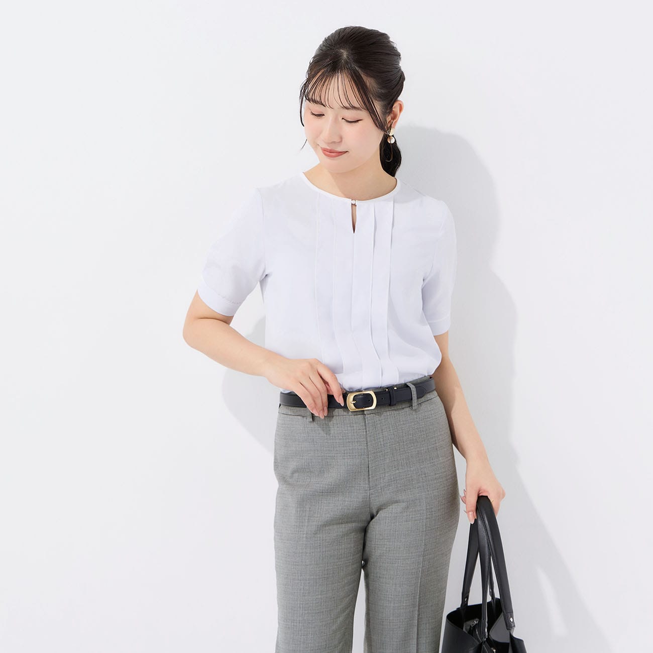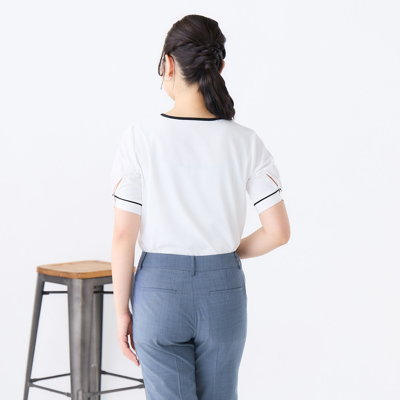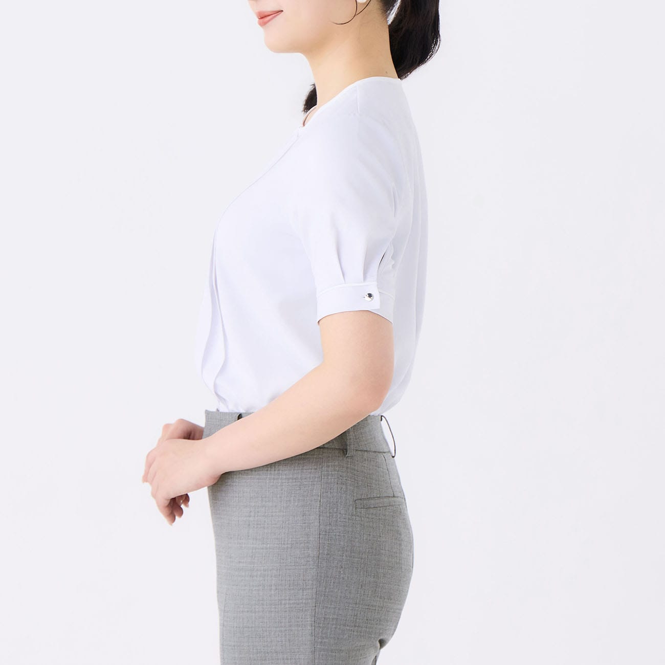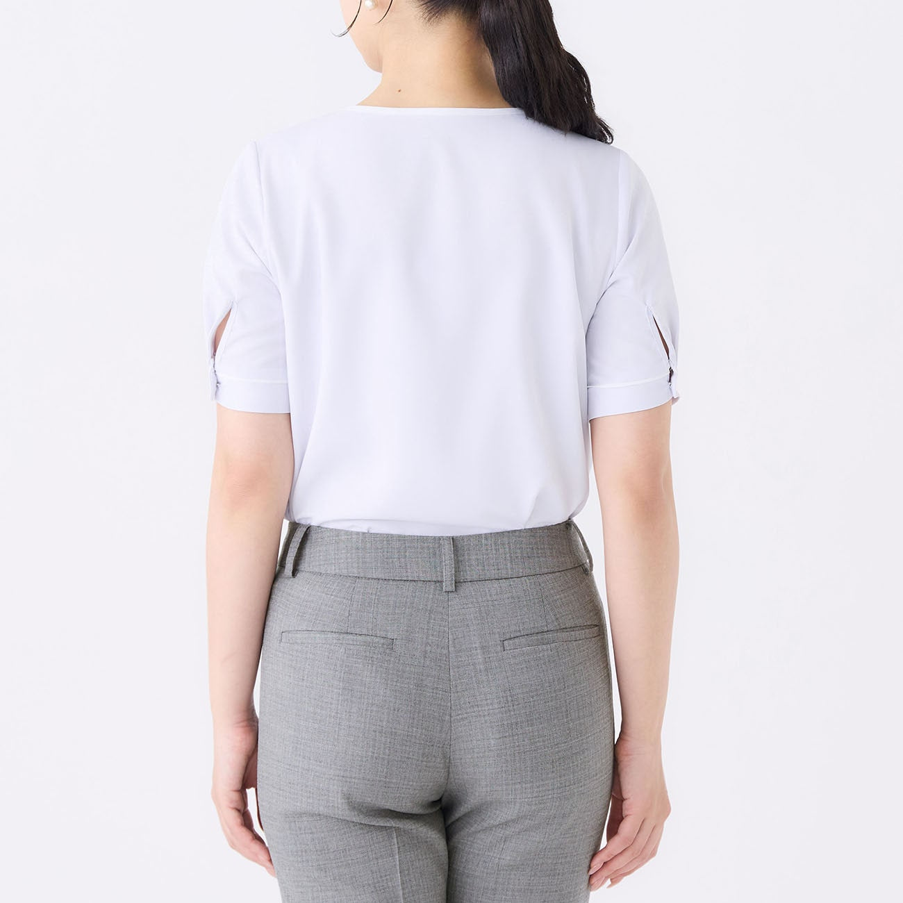 - A short sleeve blouse with delicate contrast mellow lines that create a slimming effect and a sheer-reducing design for peace of mind.