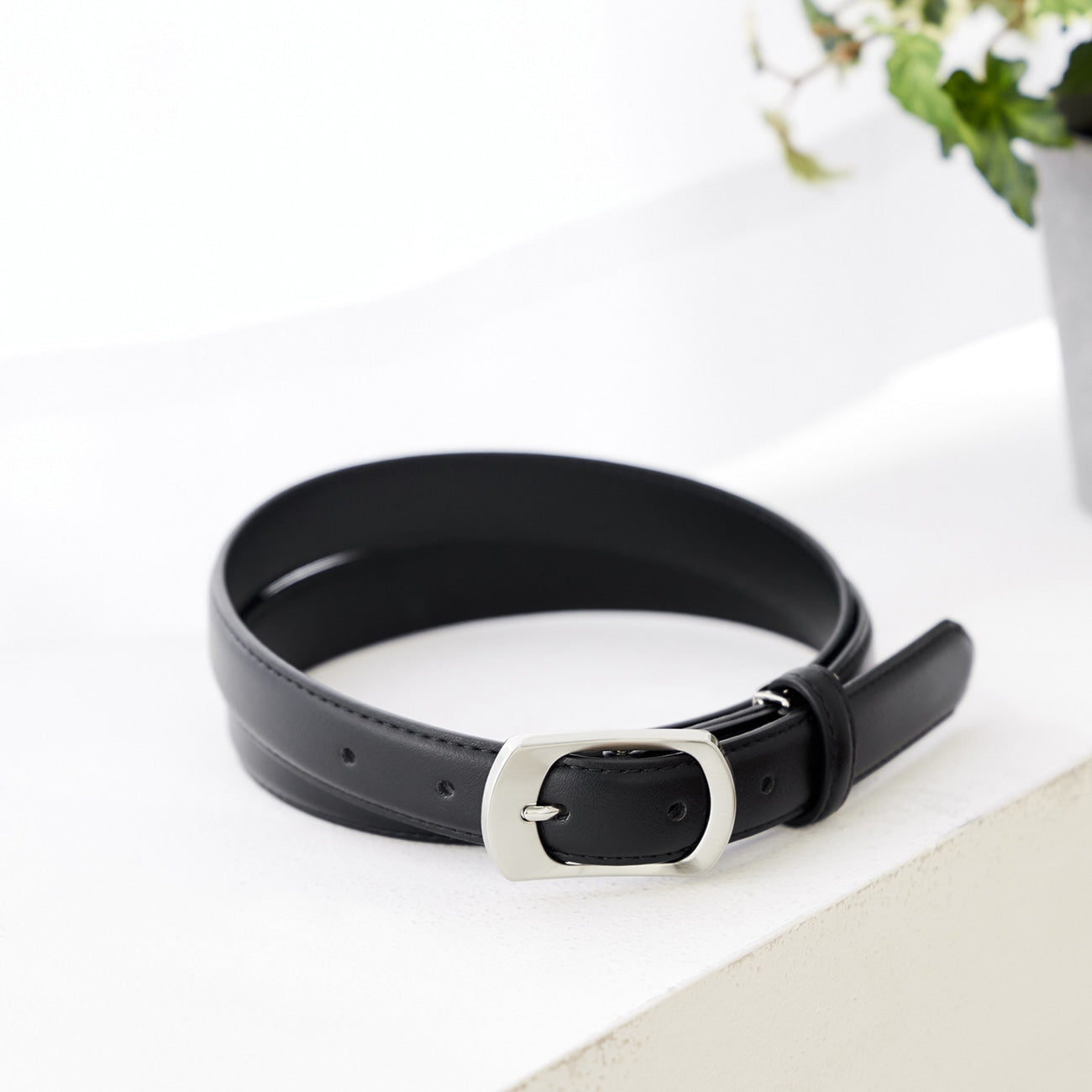 This 2.5cm wide belt serves as a perfect accent for wide-leg trousers, featuring a bold buckle with a sophisticated satin finish that accommodates waist sizes up to 90cm and offers a refined, matte texture suitable for year-round use.