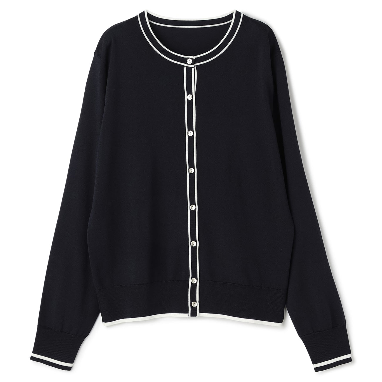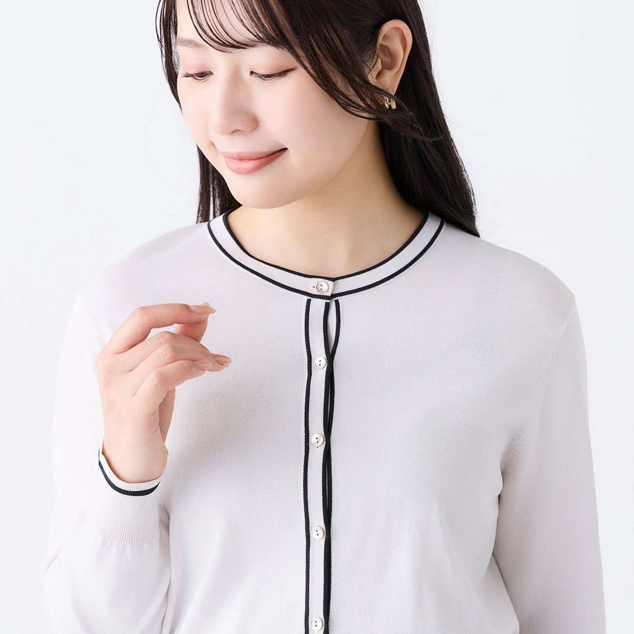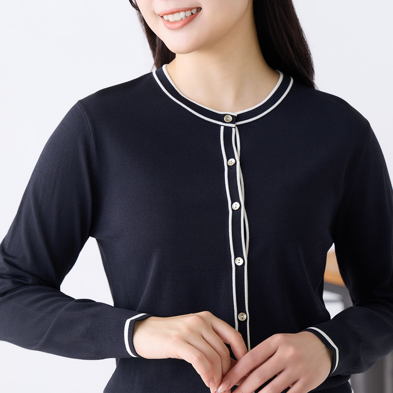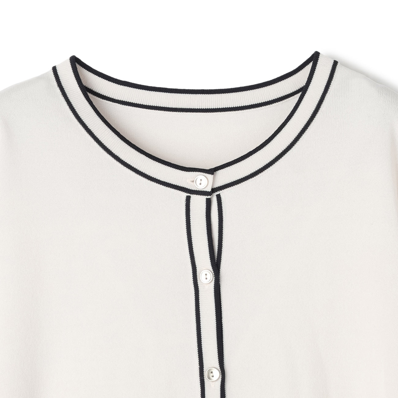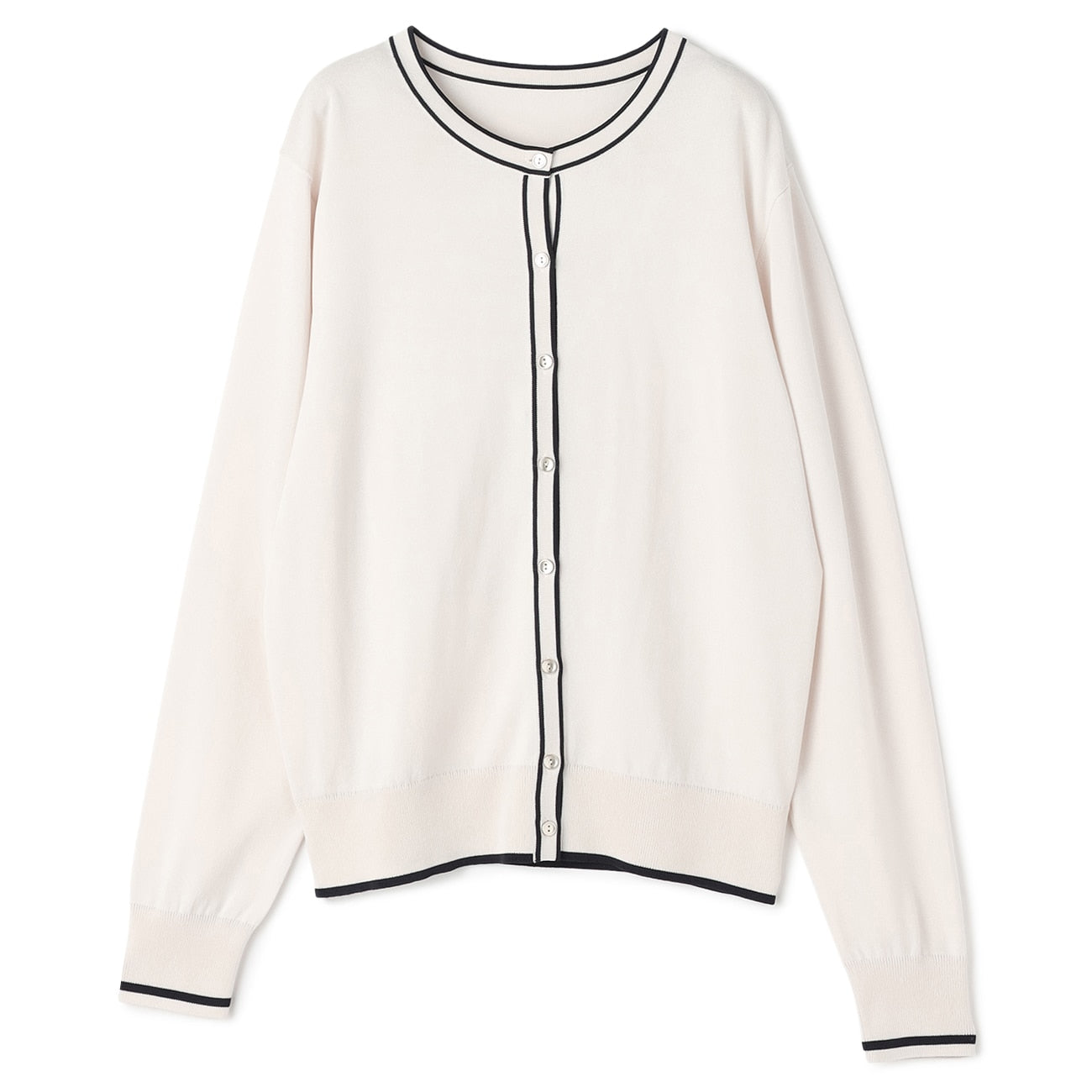 - A long-sleeved crew neck cardigan featuring sharp contrast lines, perfect for protecting against sunlight and air conditioning.