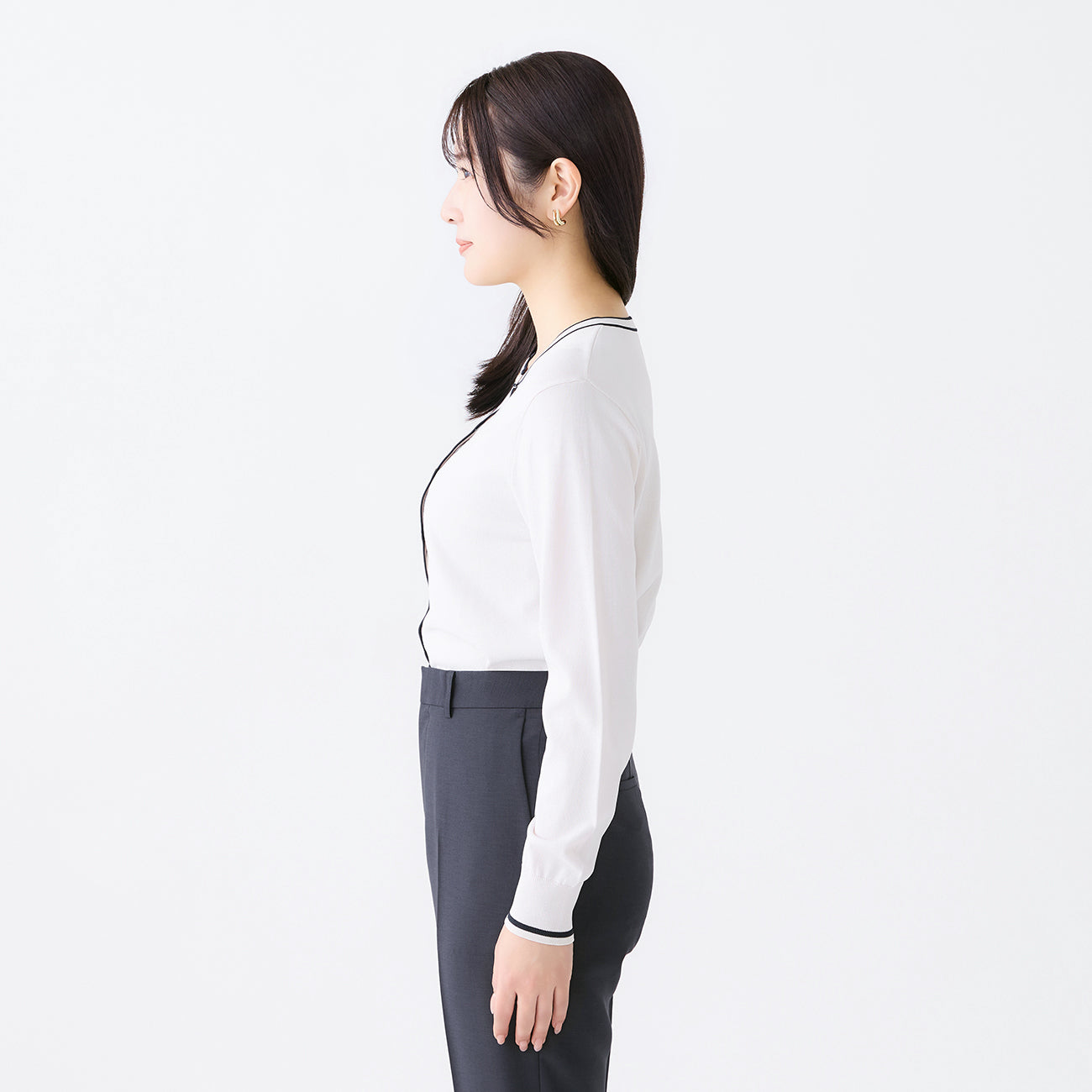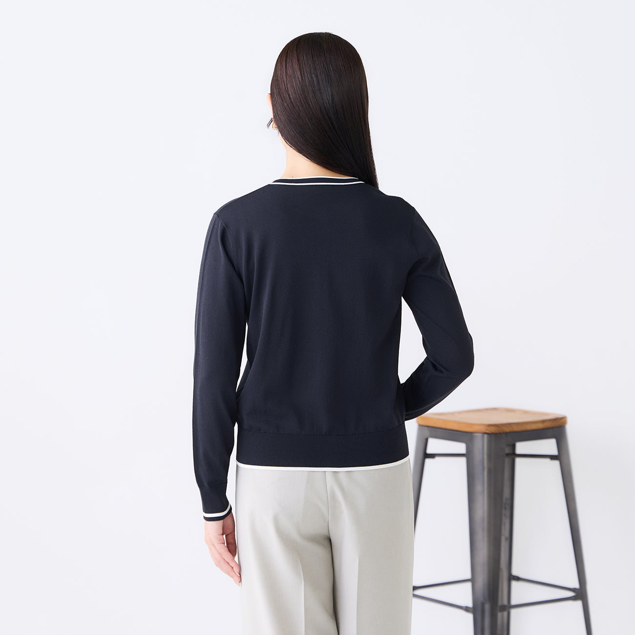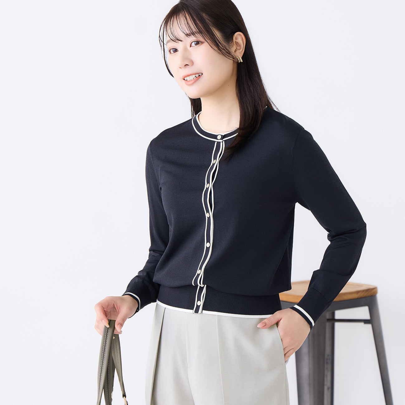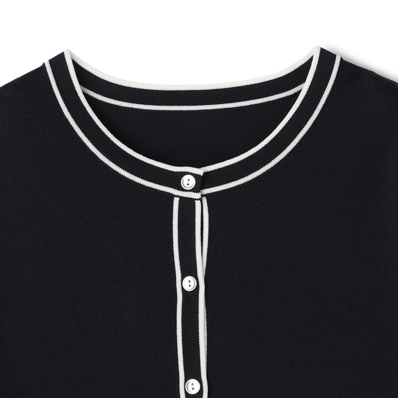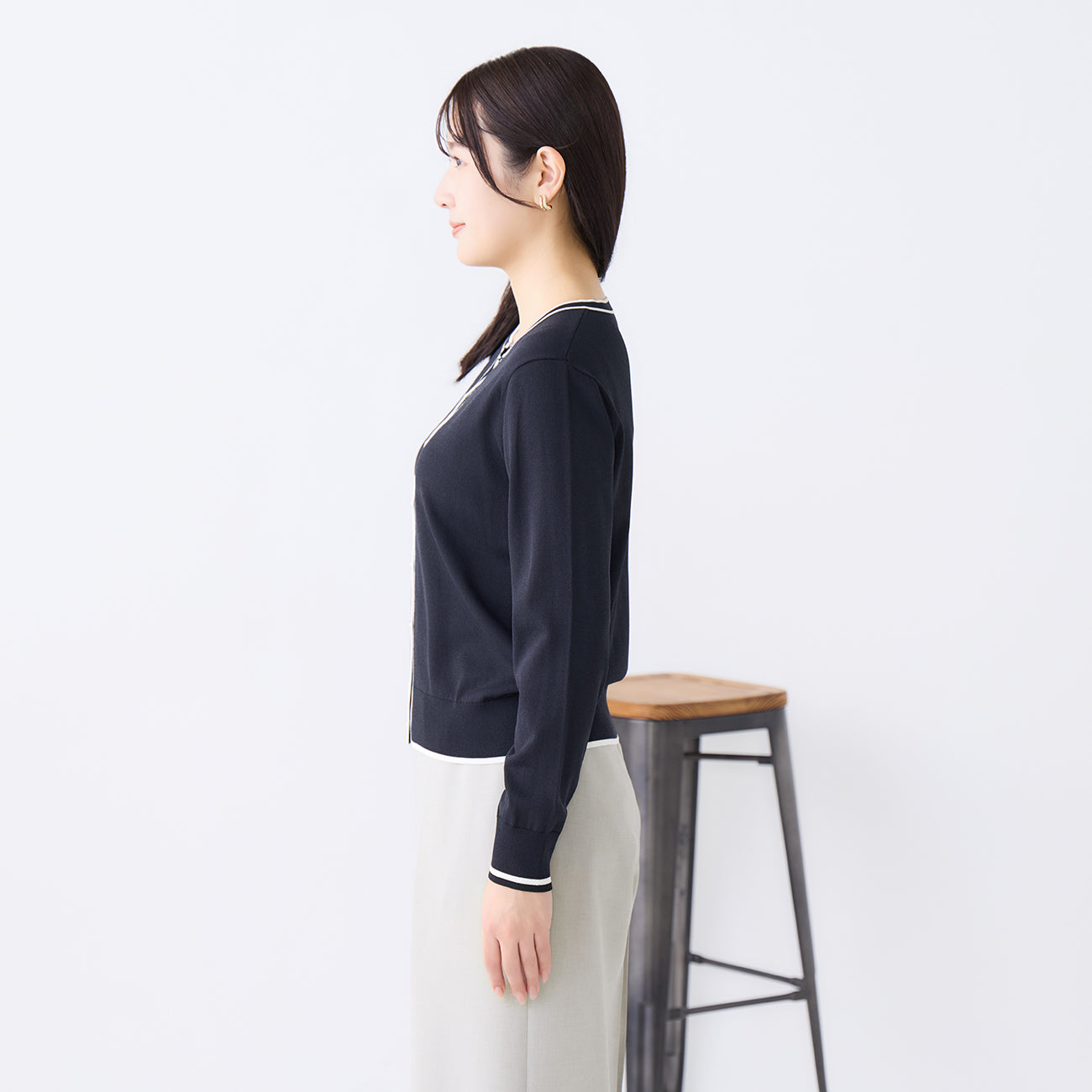 - A long-sleeved crew neck cardigan featuring sharp contrast lines, perfect for protecting against sunlight and air conditioning.