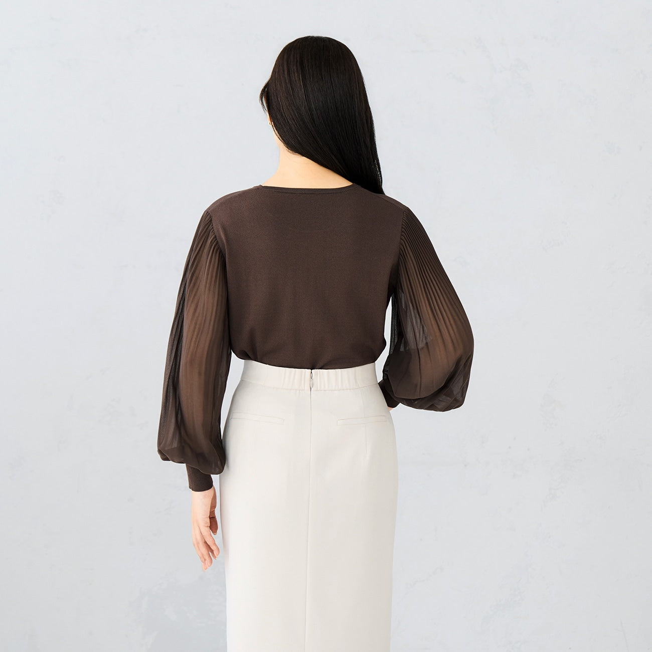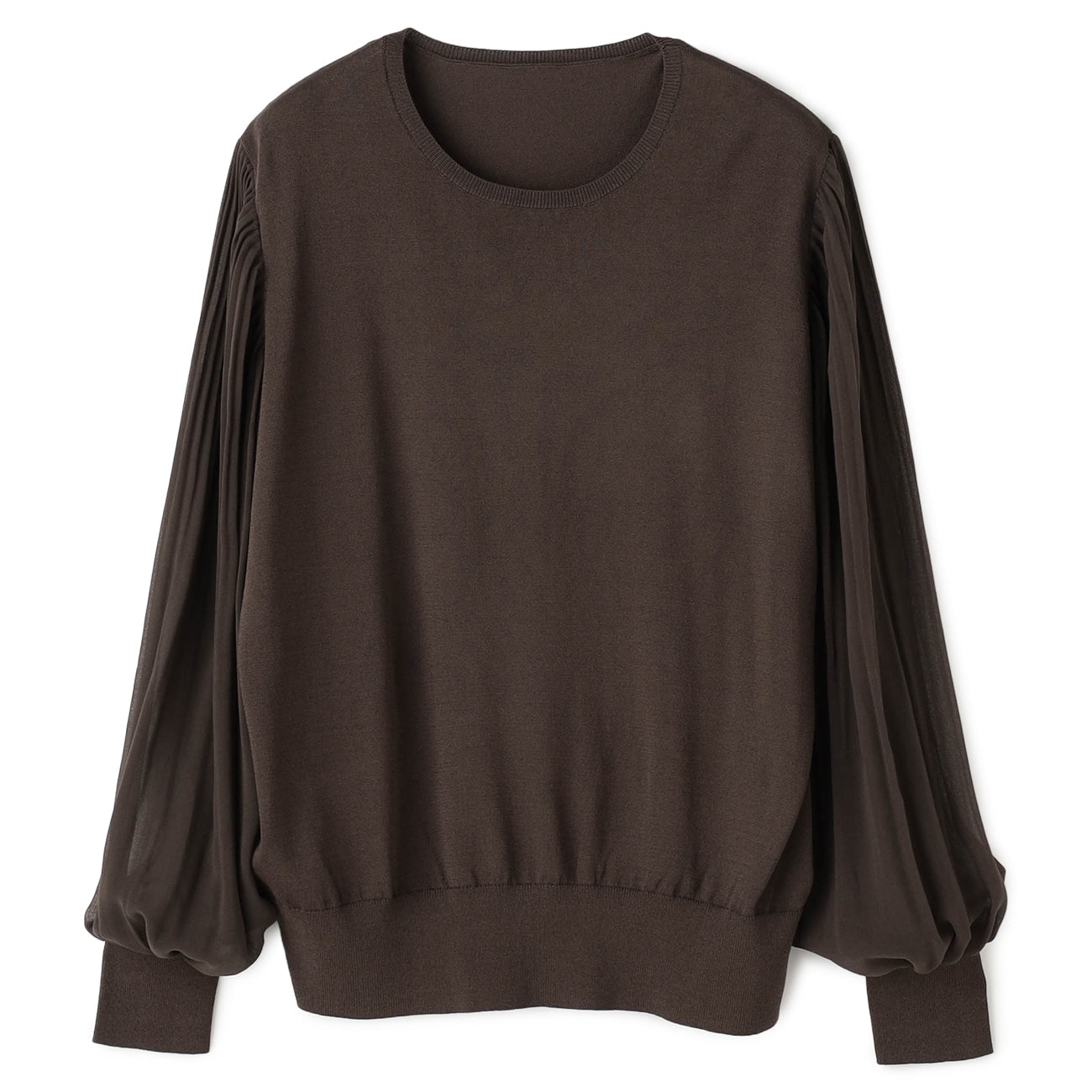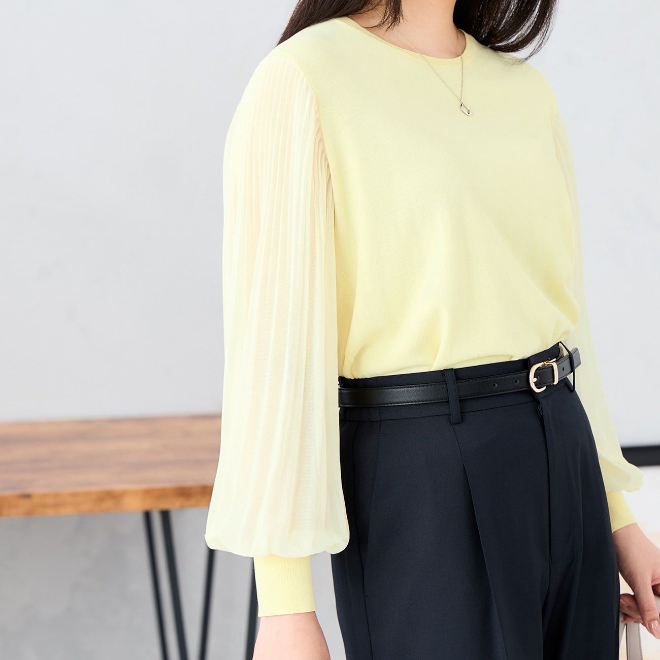 彈性簡約針織衣身,搭配雪紡百褶袖,修身同時打造穿搭亮點。