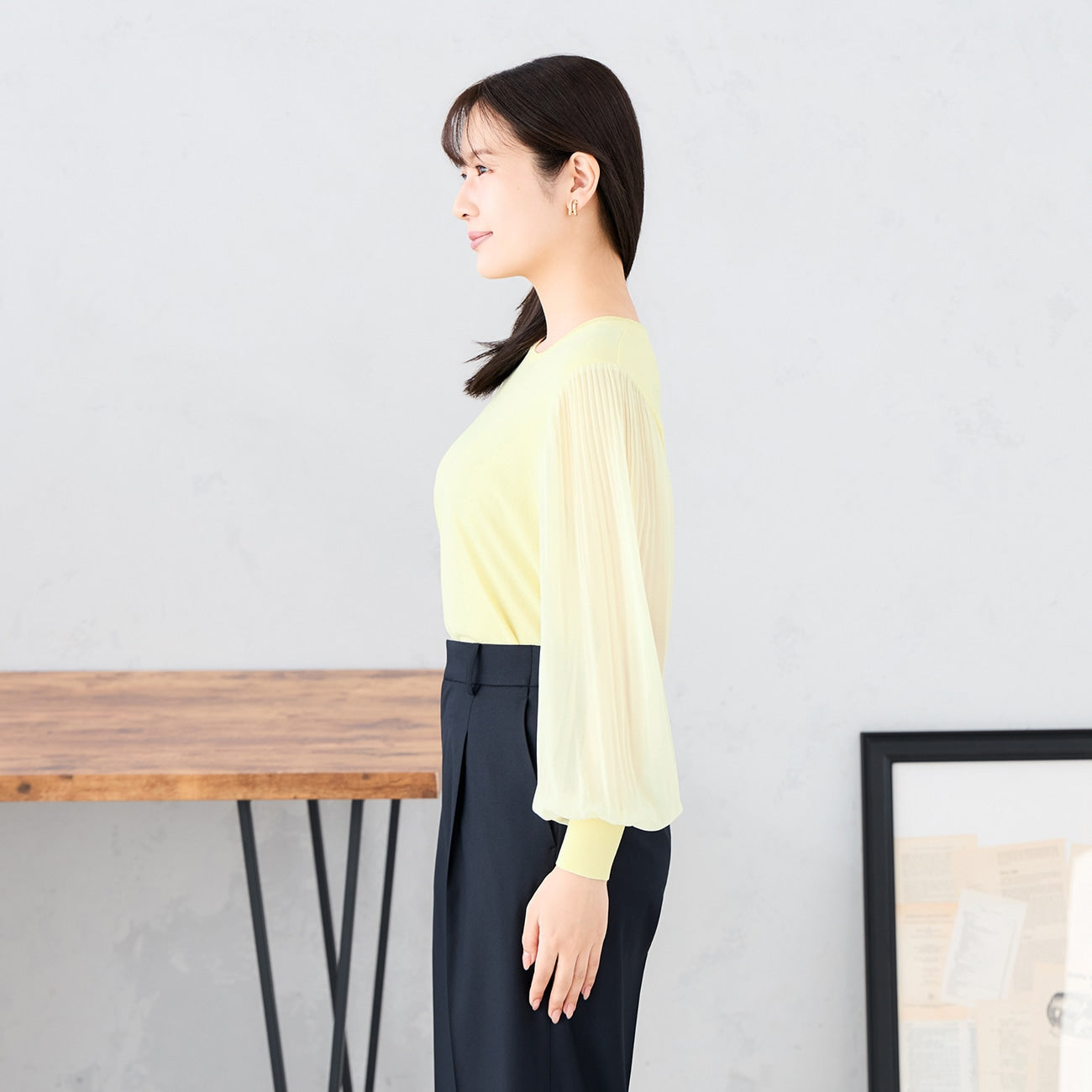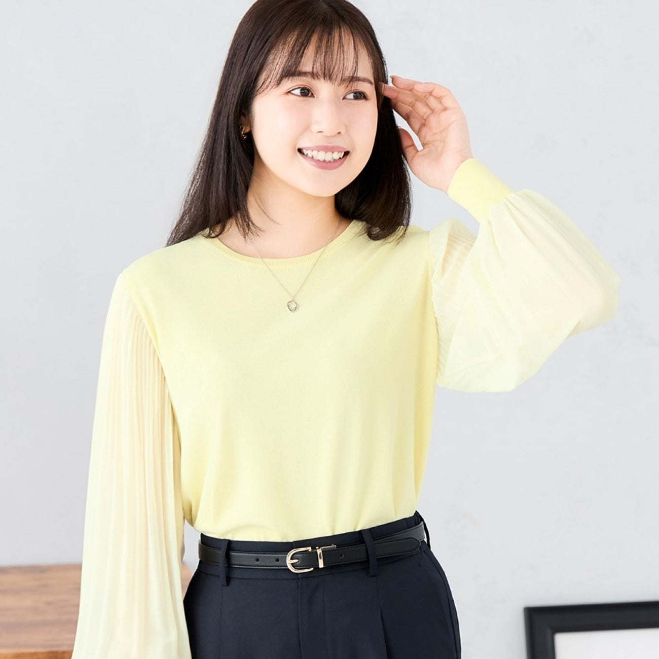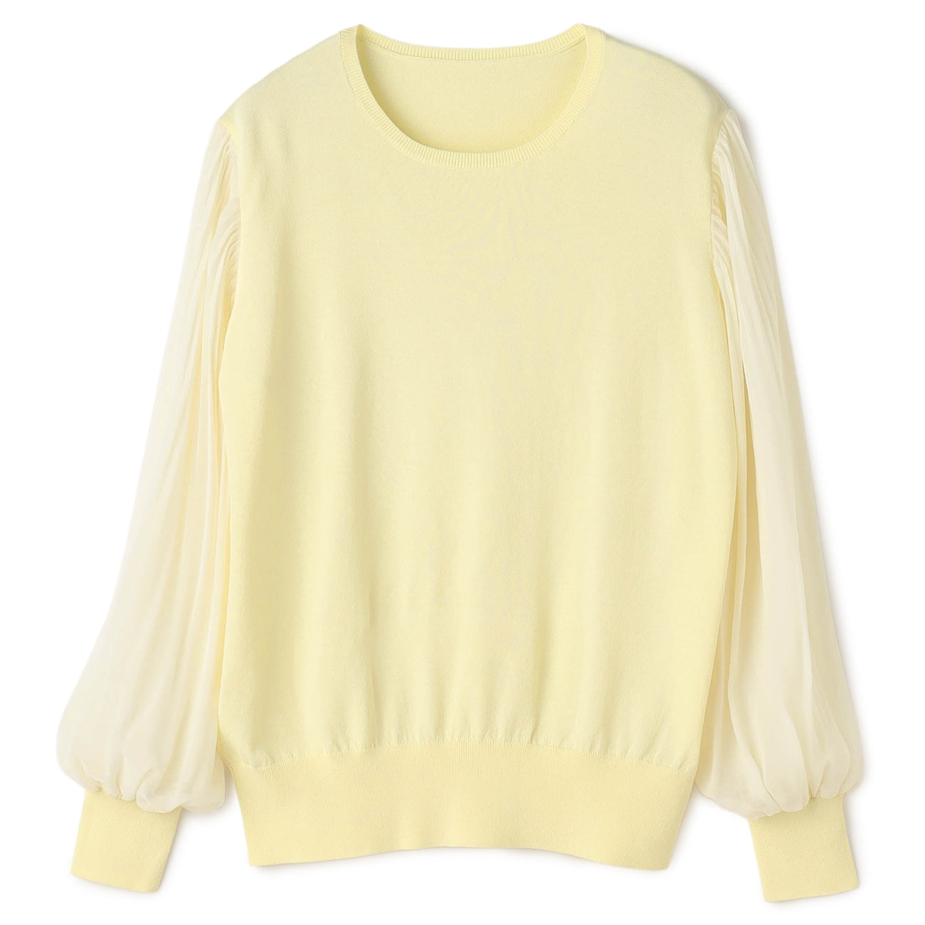 彈性簡約針織衣身,搭配雪紡百褶袖,修身同時打造穿搭亮點。