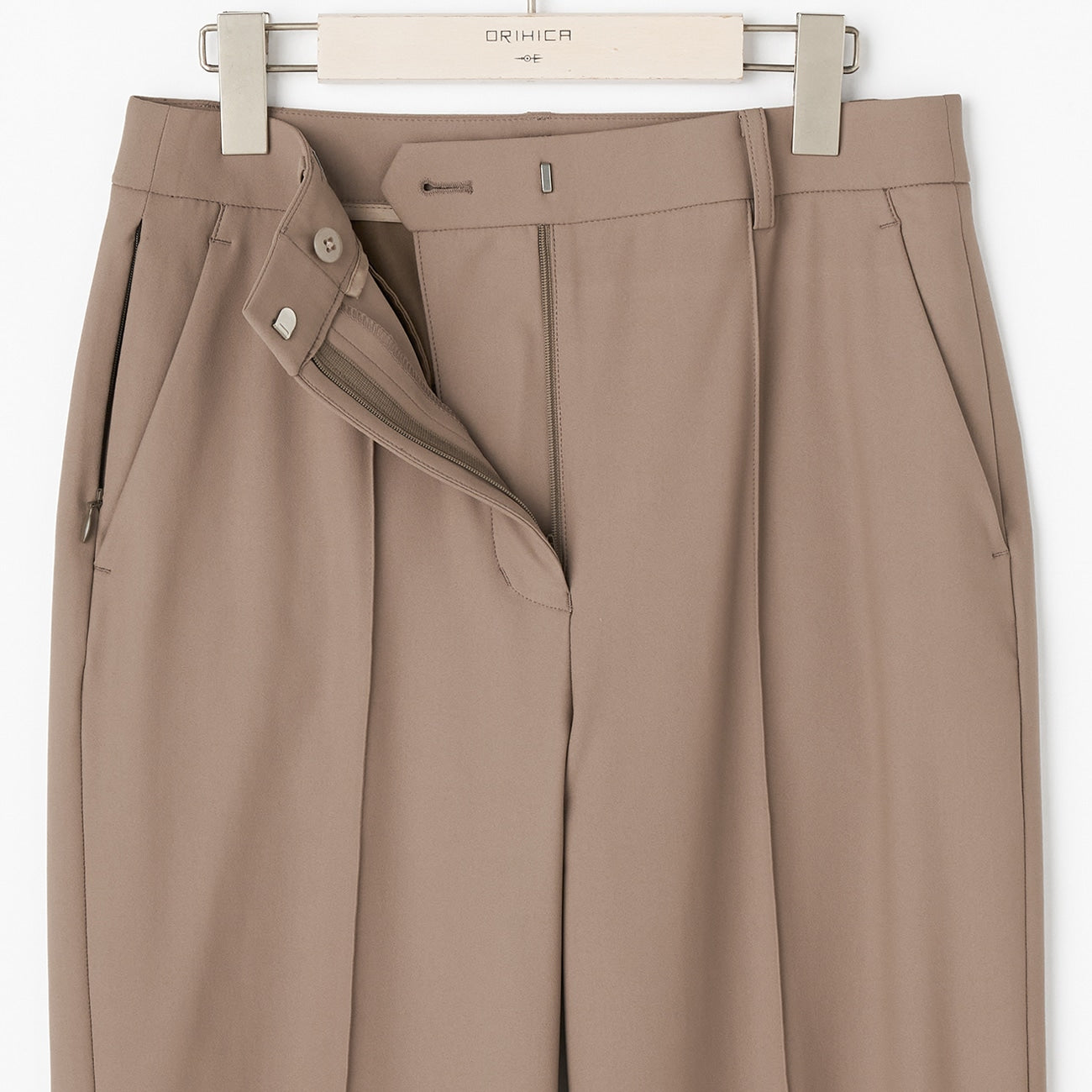 ・西裝寬褲右側口袋附拉鍊,更添運動感。