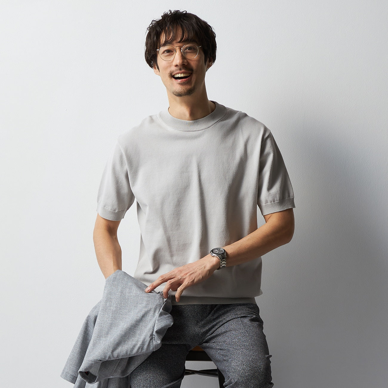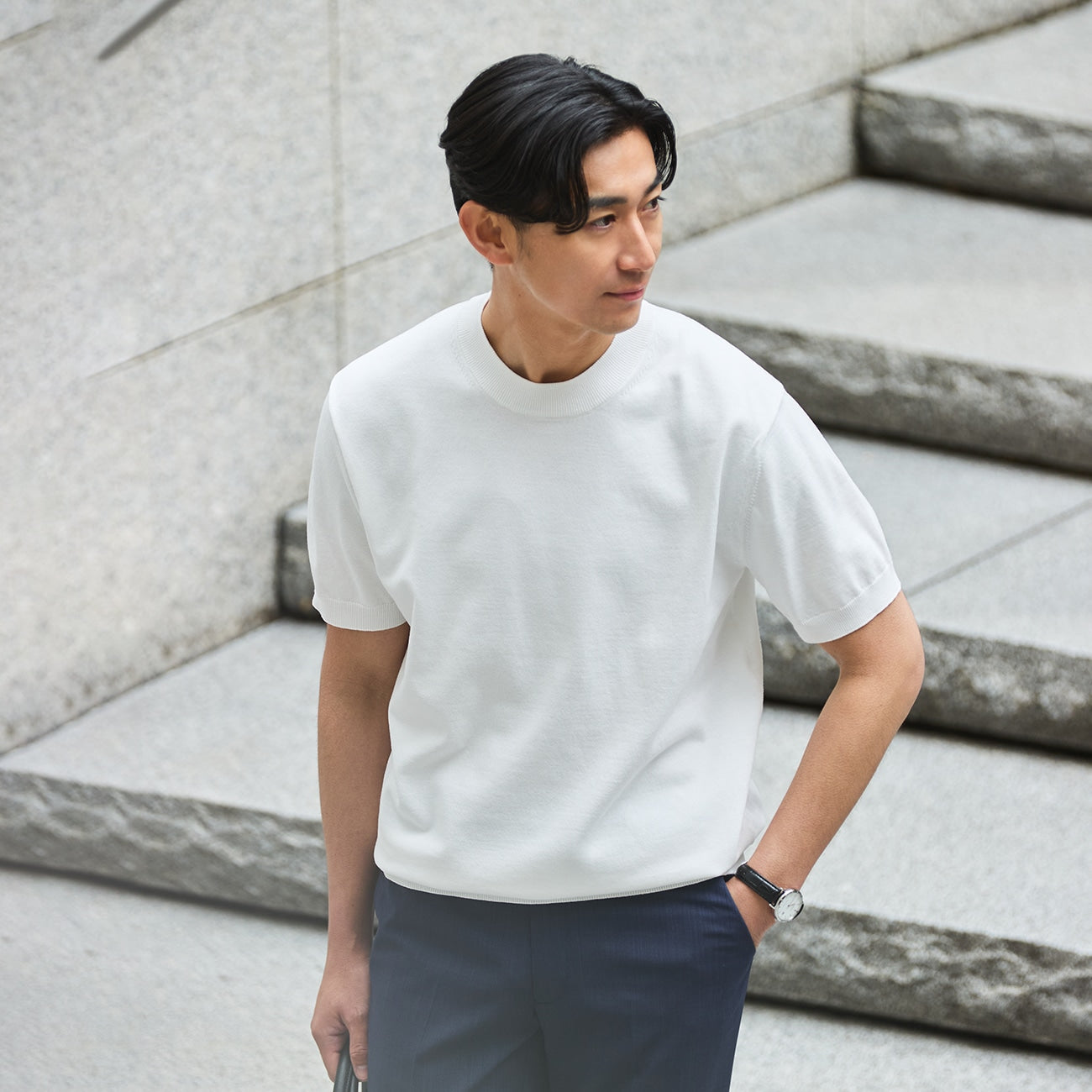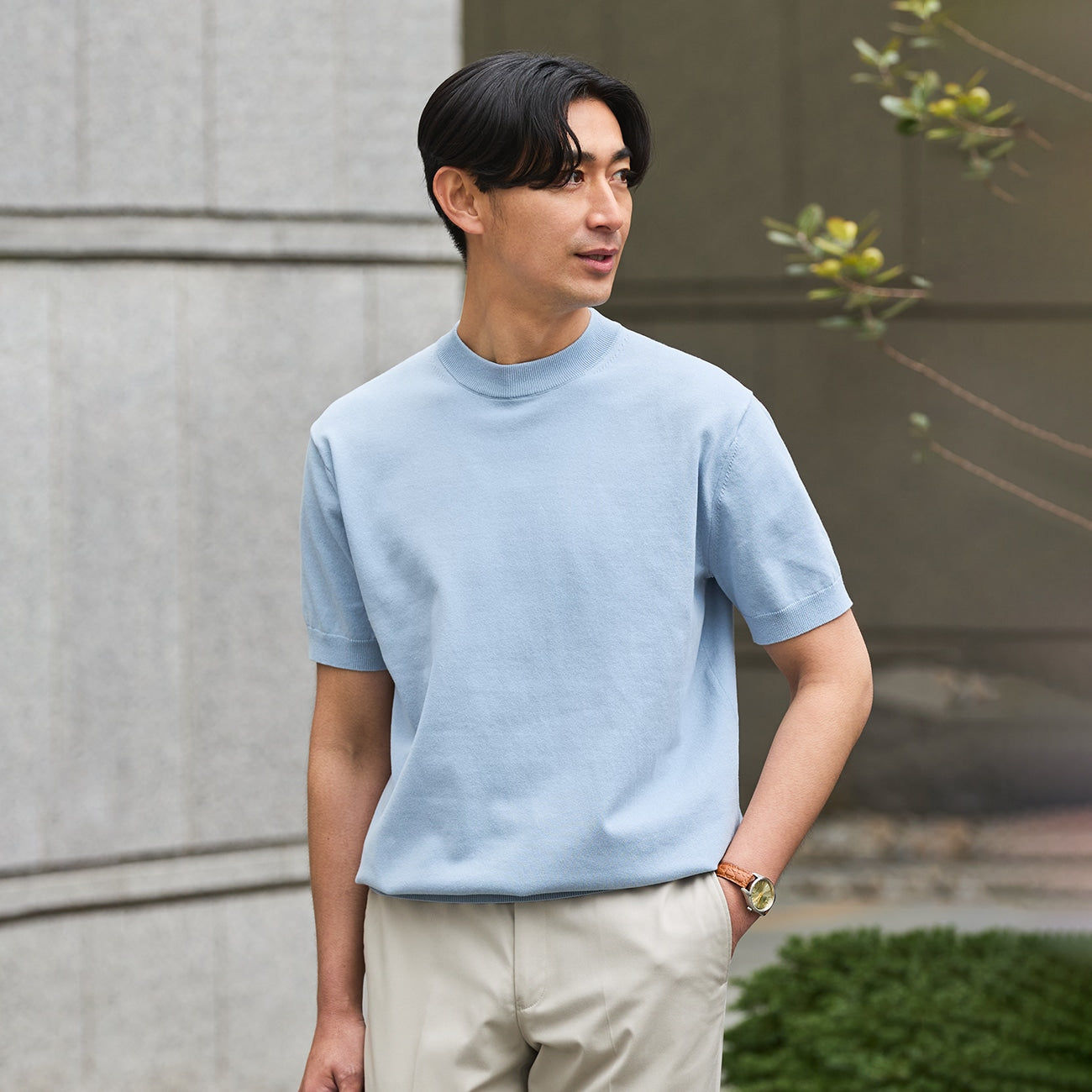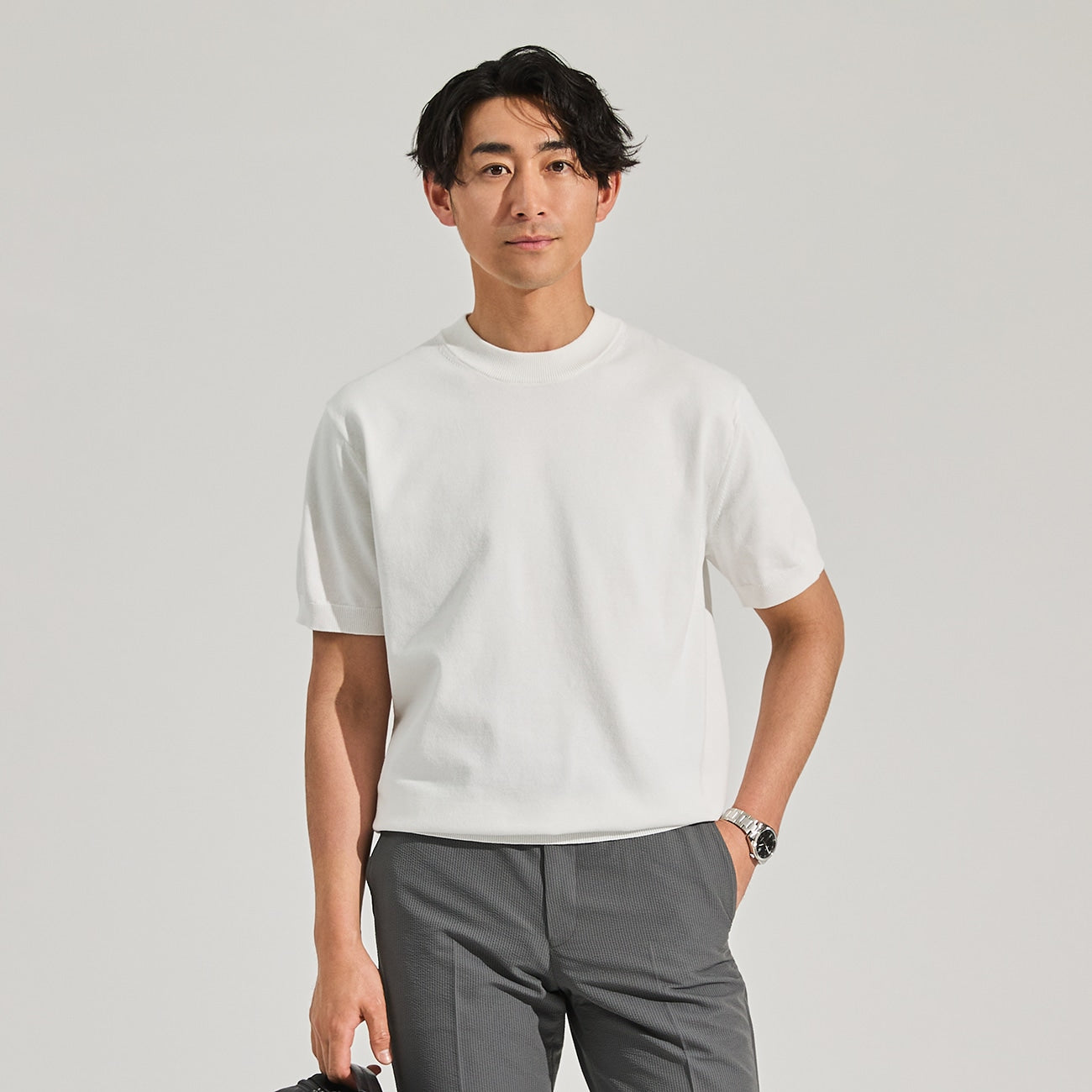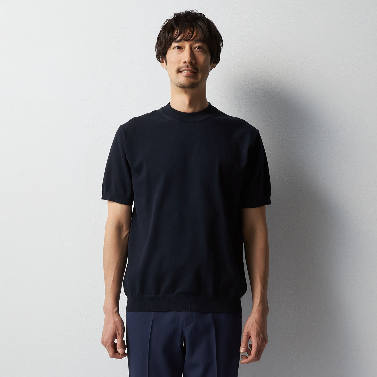 - Plating knit with cotton on the surface & polyester on the back, combining the comfortable texture of cotton with the non-stickiness of polyester, while maintaining high shape retention.