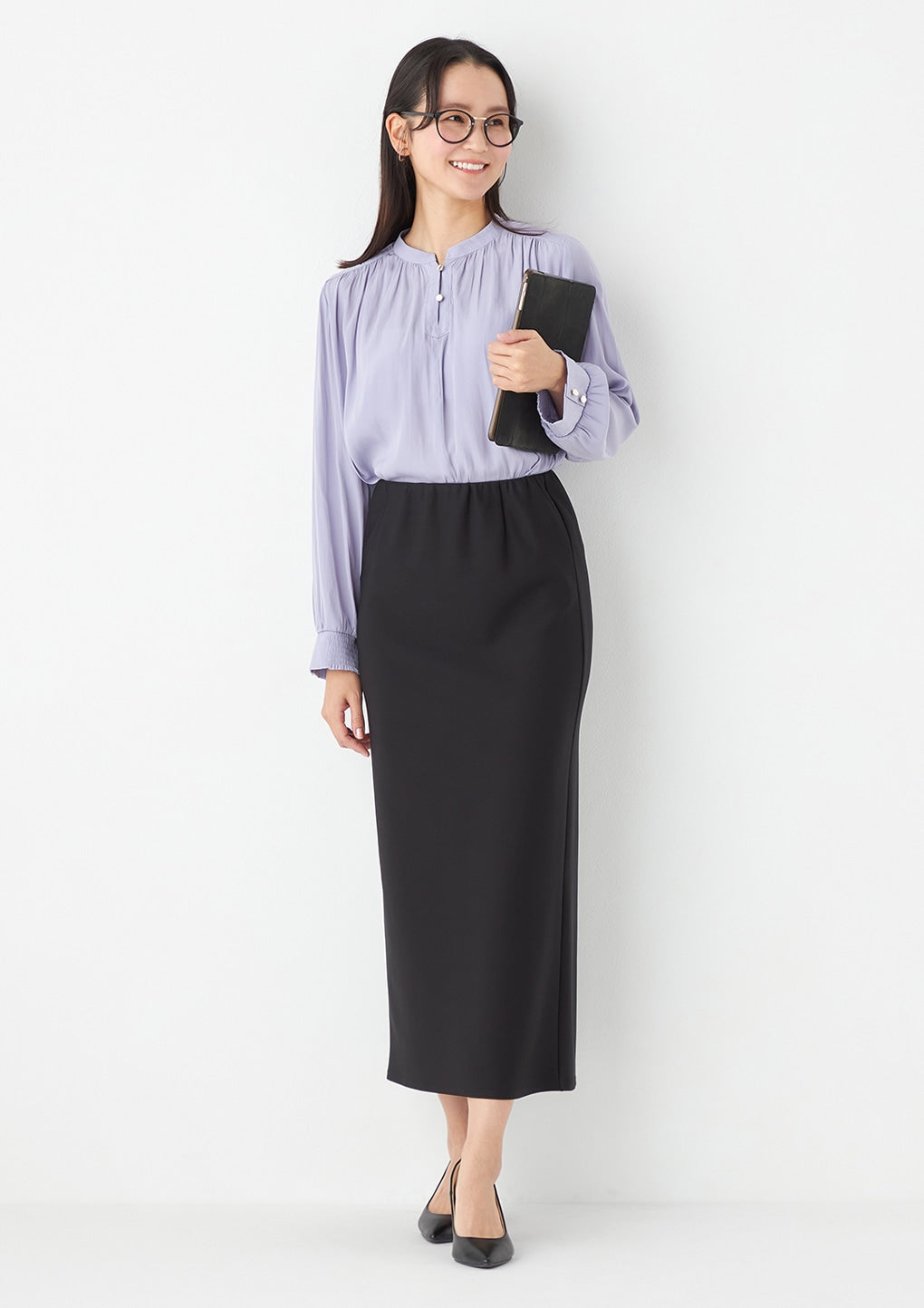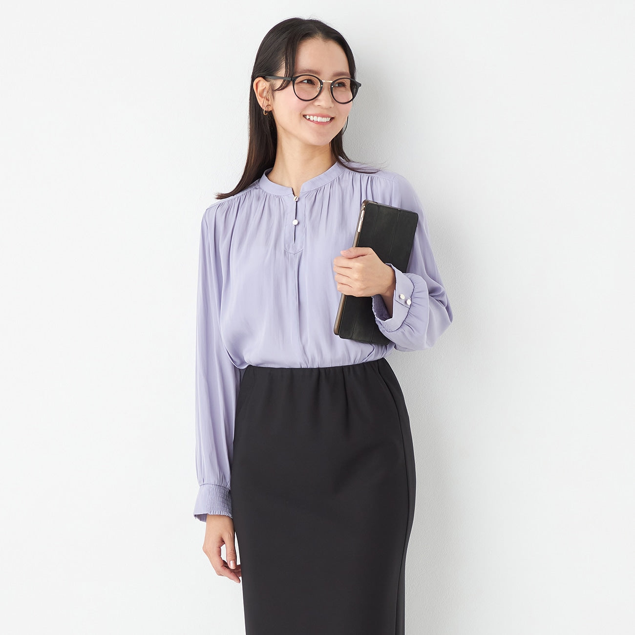 Easy-care blouse featuring a subtle gloss and textured finish, perfect for busy days.