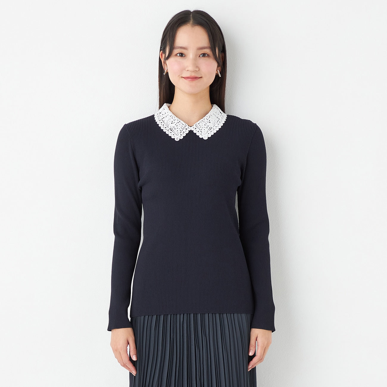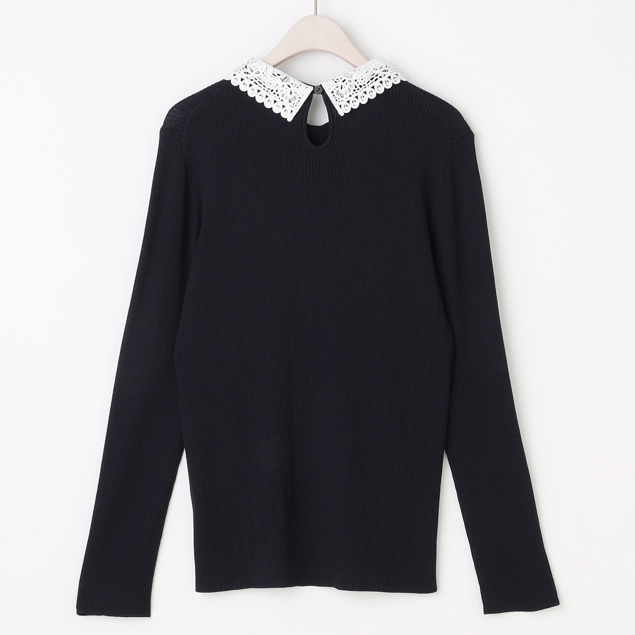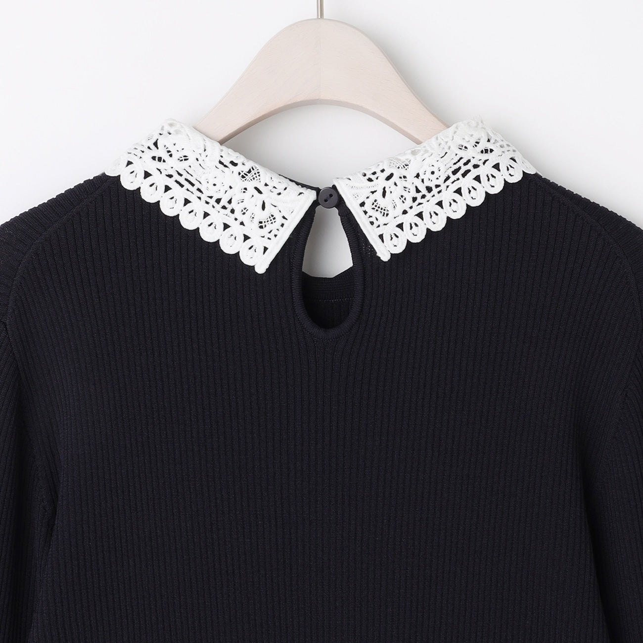 Refined knit top with an elegant lace collar.