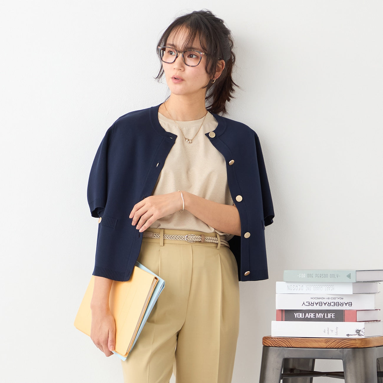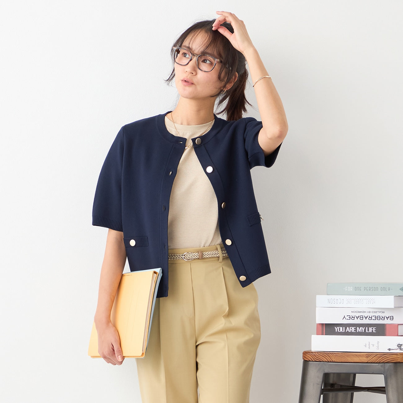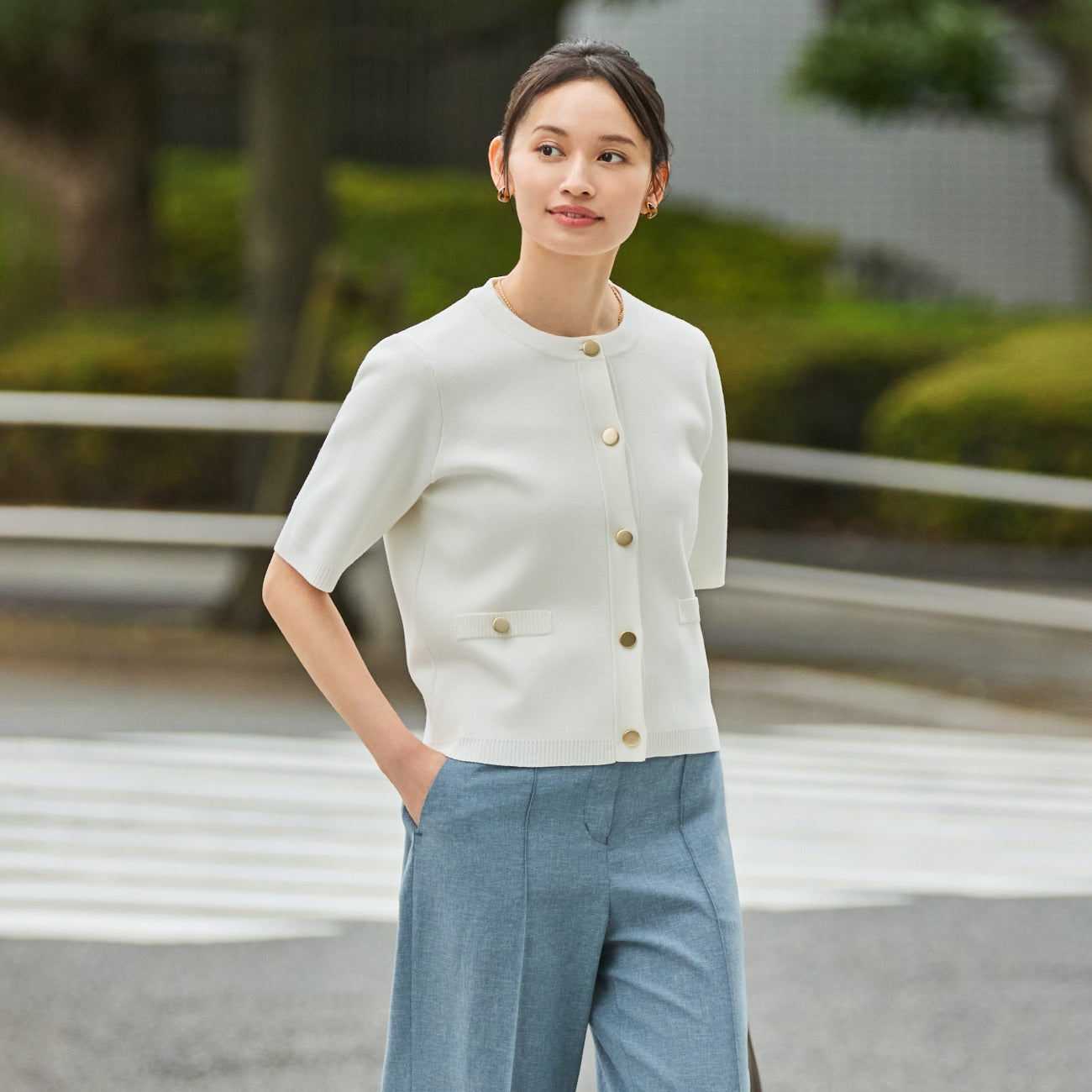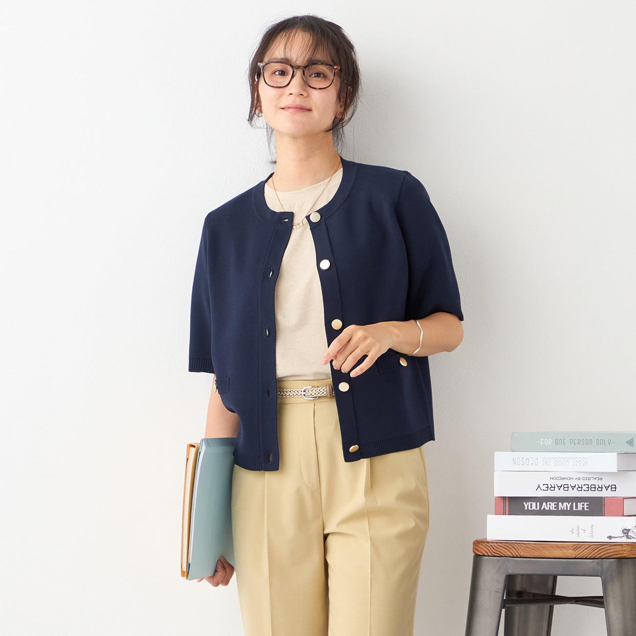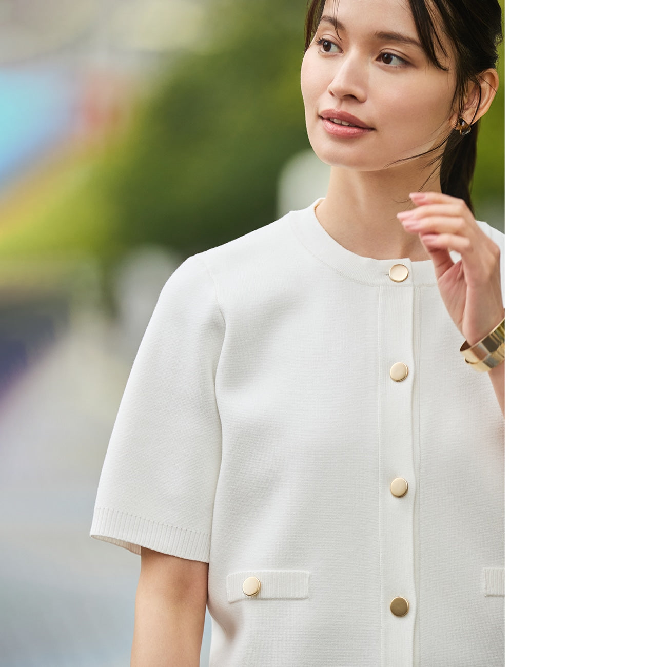 - This short-sleeve knit jacket offers a structured look while being as easy to throw on as a cardigan. It can also be buttoned up & worn as a top.