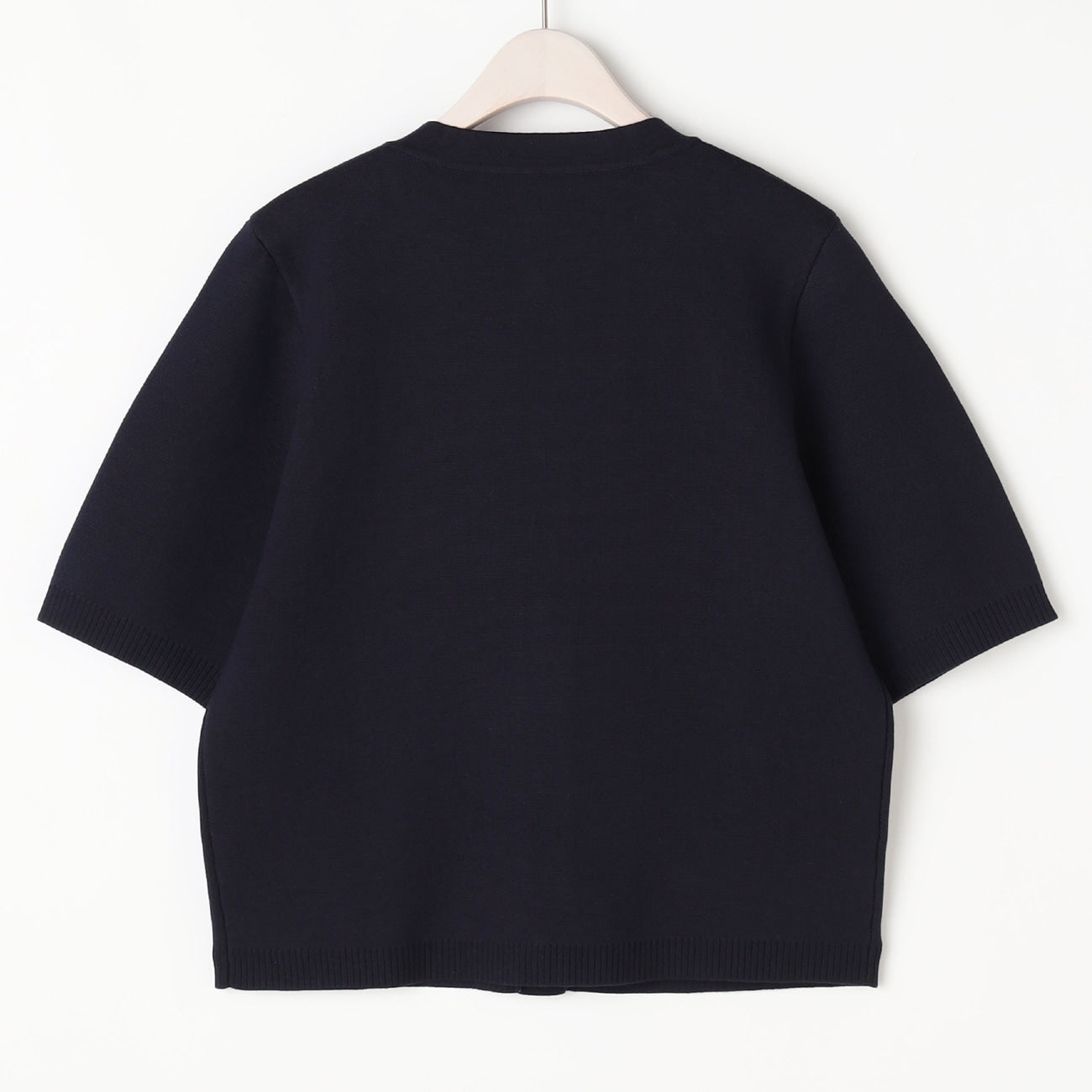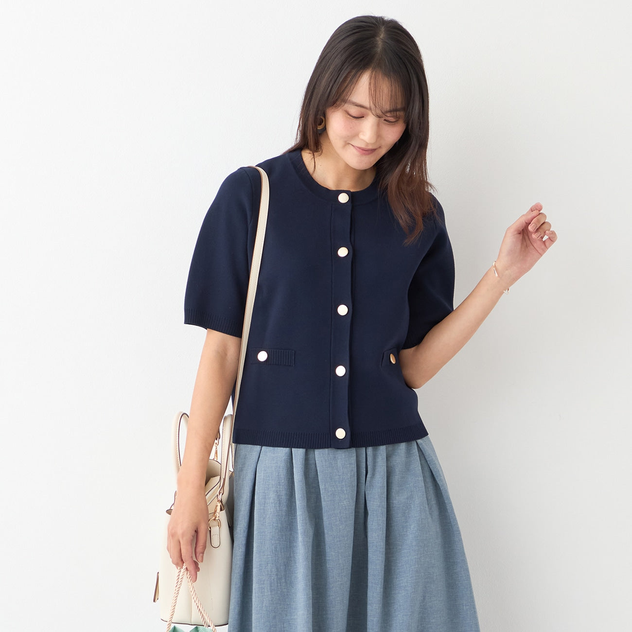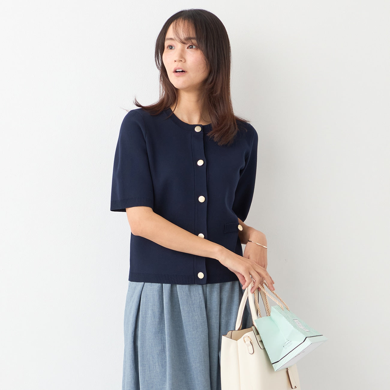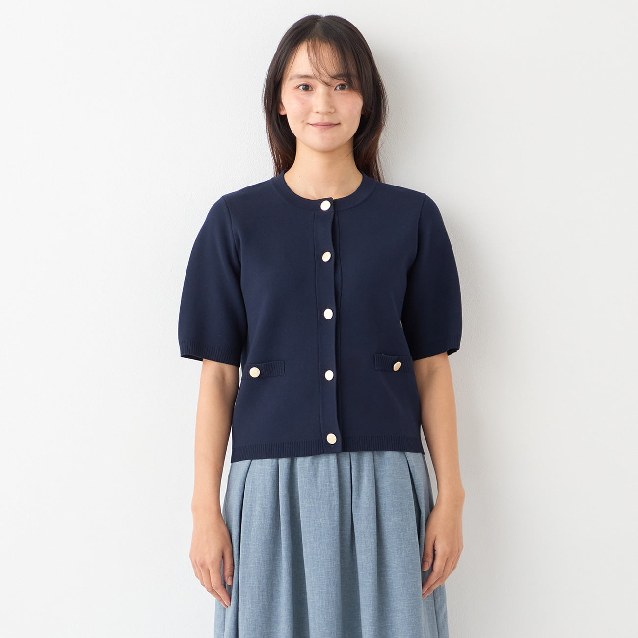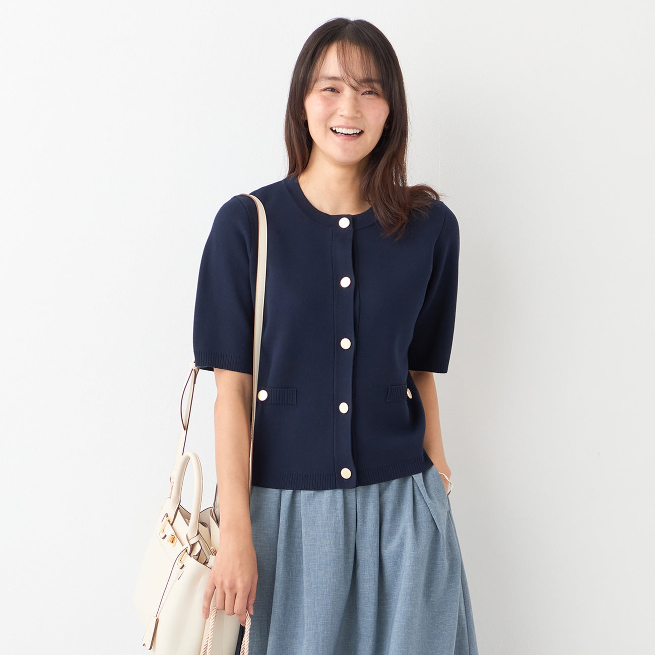 - This short-sleeve knit jacket offers a structured look while being as easy to throw on as a cardigan. It can also be buttoned up & worn as a top.