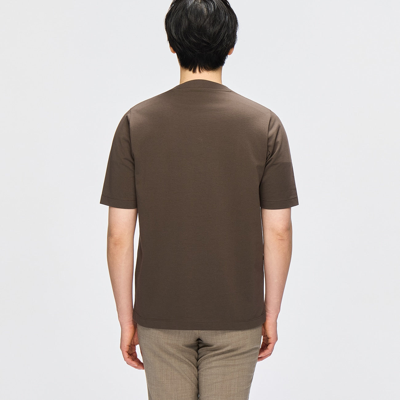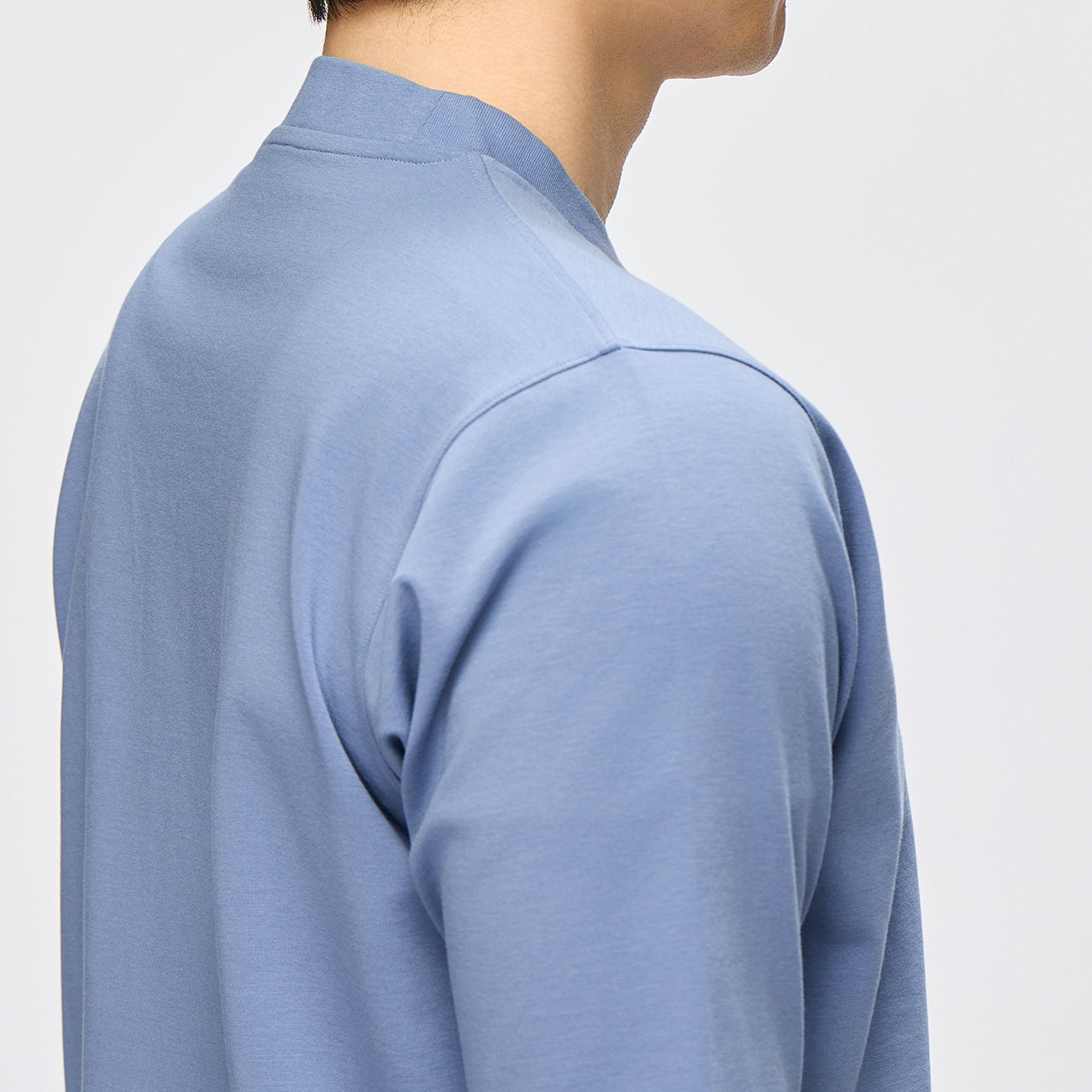 The updated design features no visible stitching on the front neckline and finer twin-needle stitching on the cuffs and hem. These subtle details create a sharp, dressy impression that stands out whether worn alone or as an inner layer.