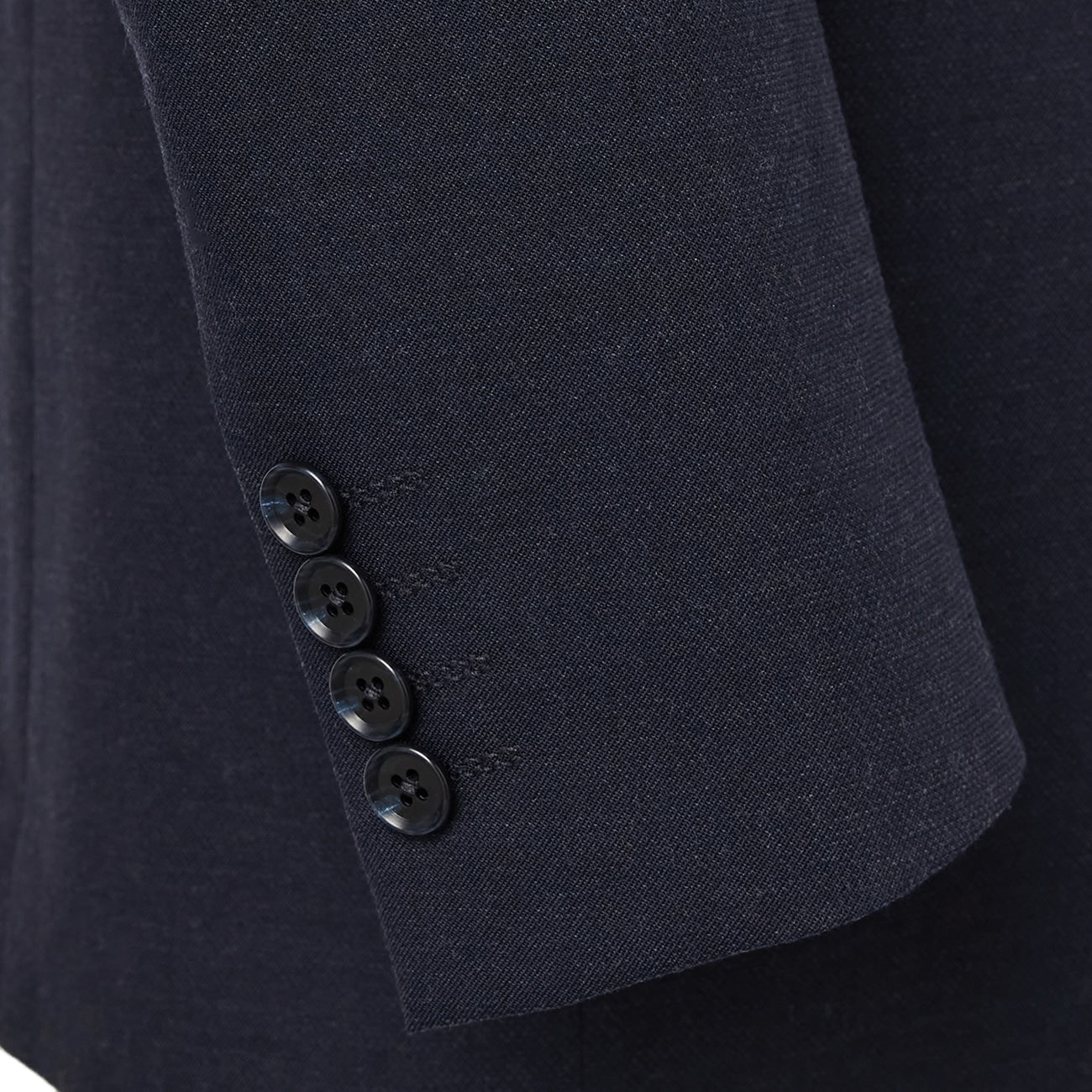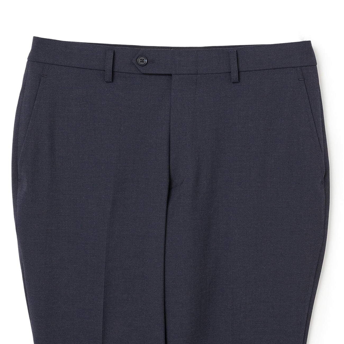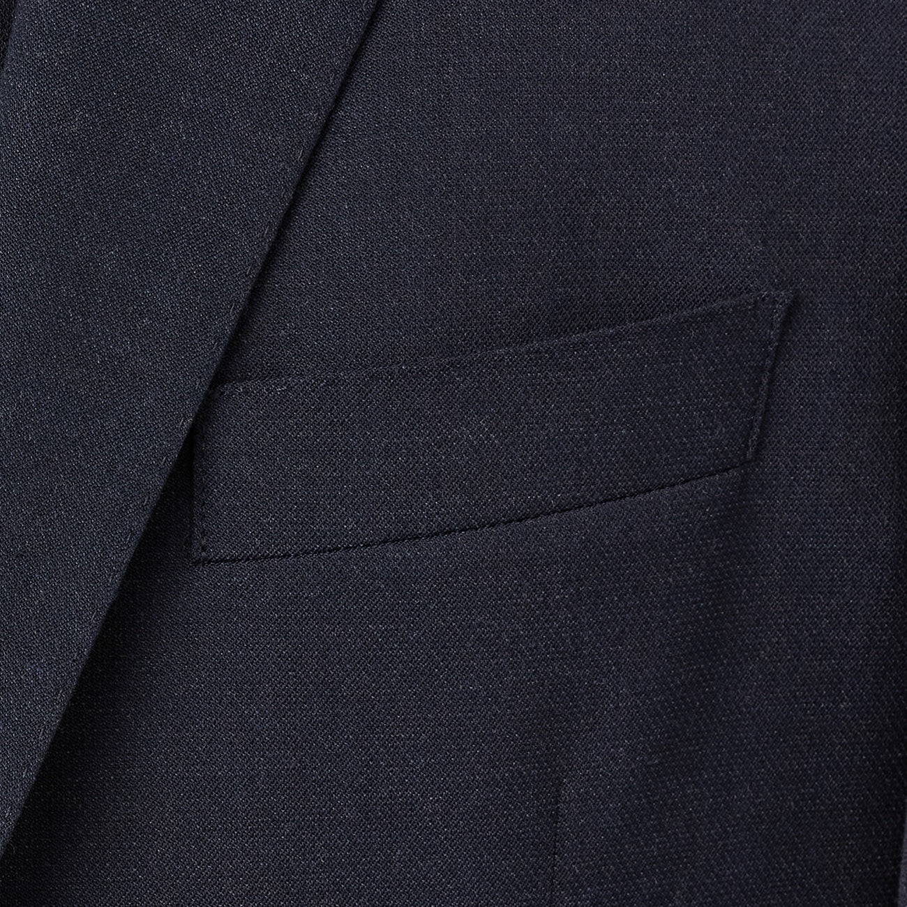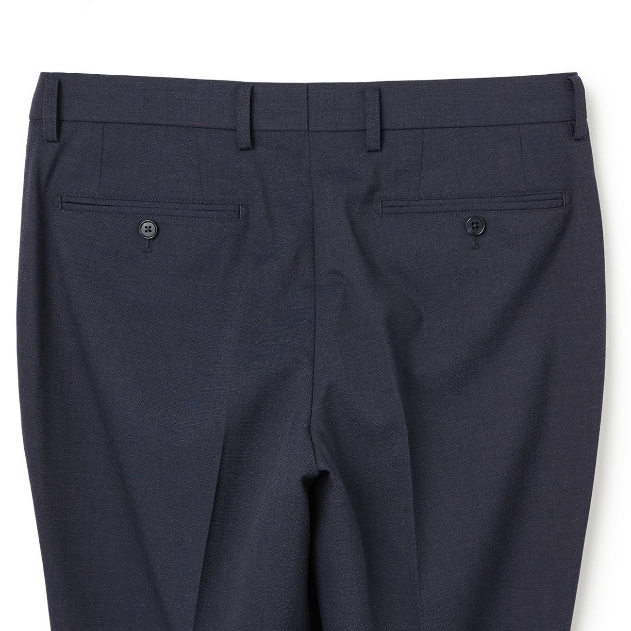 西裝外套肩膀略呈圓弧線條,穿著輕鬆不拘束。肩寬適中、腰部略為收窄,打造出自然立體身形。西裝褲為低腰錐形設計,腰圍不緊繃、錐形剪裁更有修飾腿型效果。