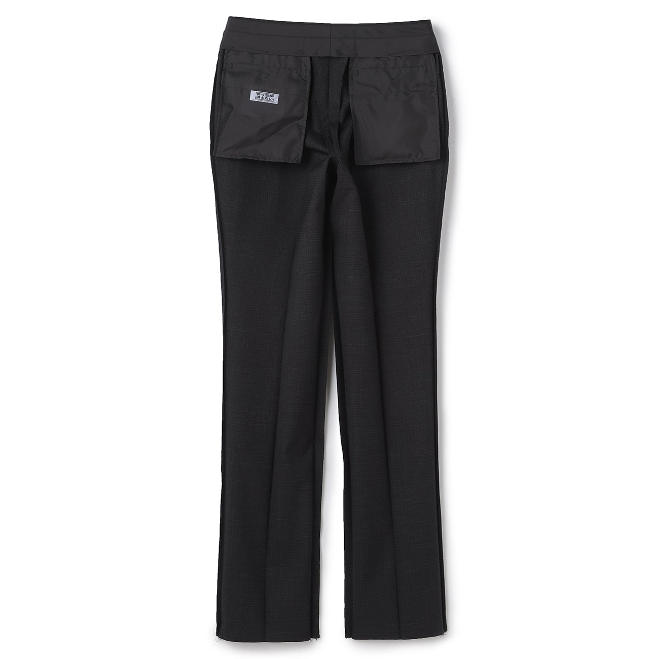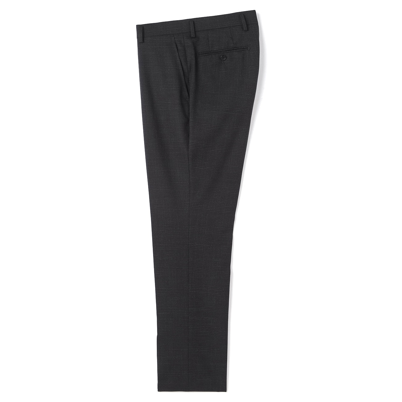 西裝褲:無摺、低腰褲、中央壓線處理