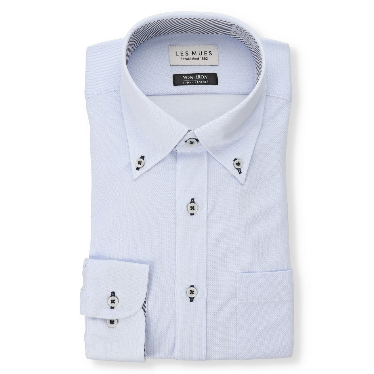 長袖、鈕扣式立領、左胸口袋、對比色內領與袖口、雙鈕扣可調節袖口、convertible cuffs
