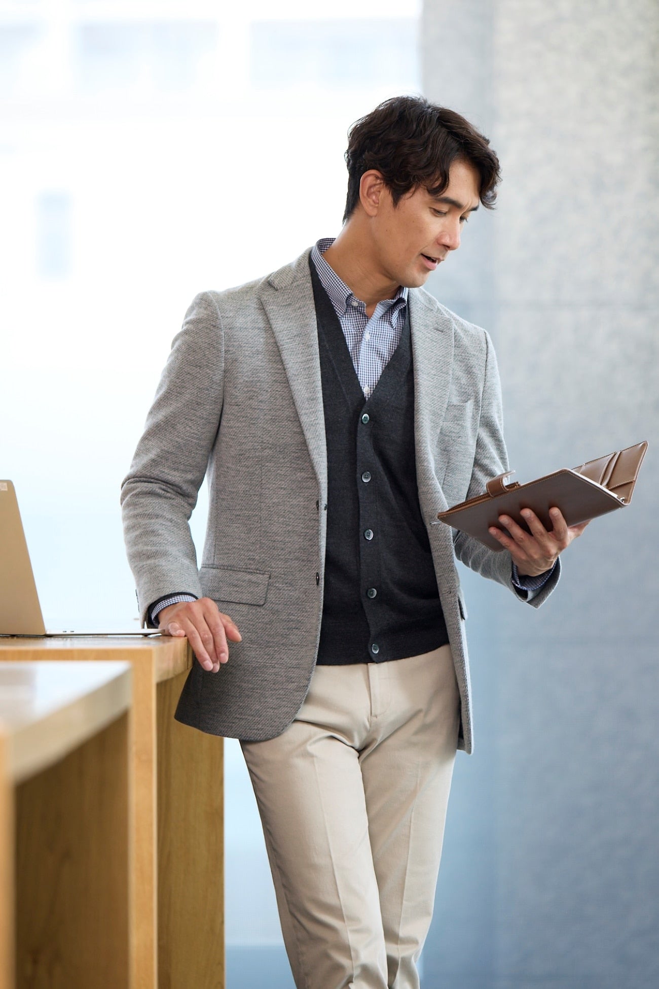 高針數針織呈現流暢優雅質感。面料厚度適中,穿著於西裝或外套內層時舒適貼合,毫無厚重感。