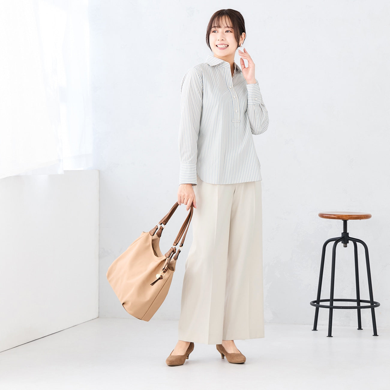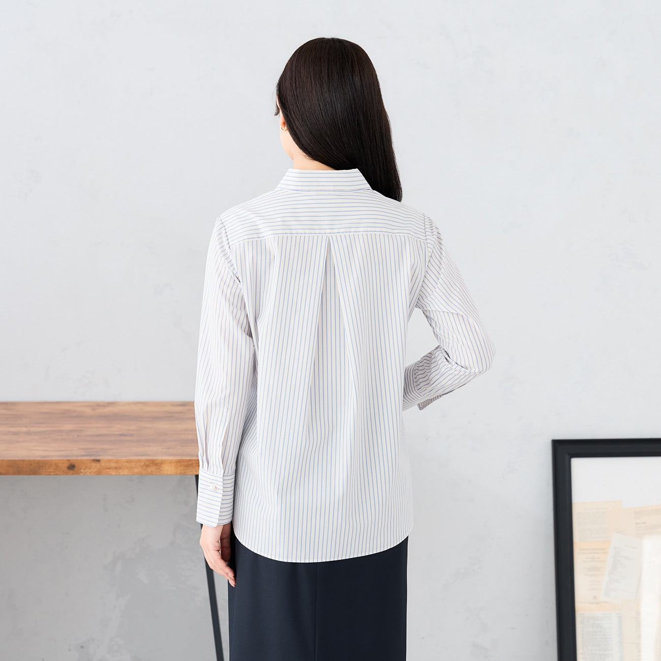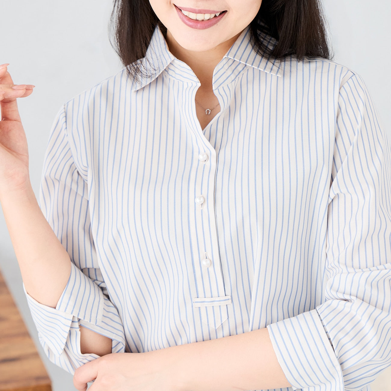 Elegant pearl buttons that are neither too small nor too big. The cuffs are switched to a border pattern to add a sharp expression to the hands. The length covering the hips and round hem look stylish whether tucked in or out.