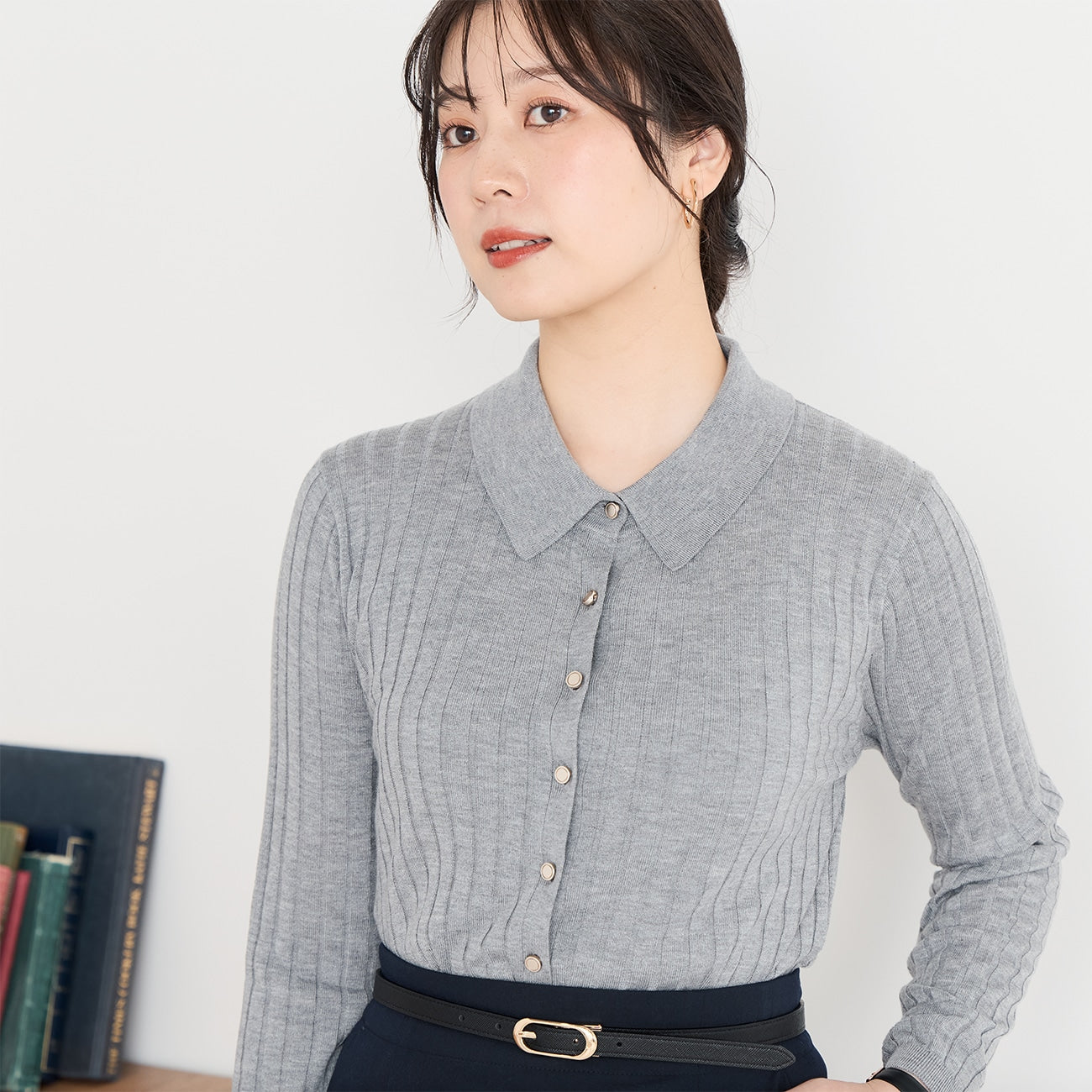 優雅針織衫 。金色鈕扣為羅紋設計增添亮點,無論商務場合或休閒穿搭皆完美適配。