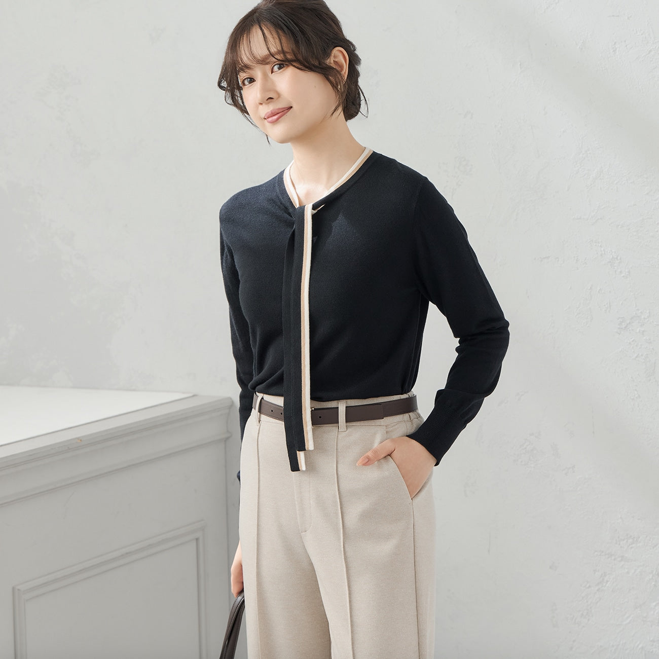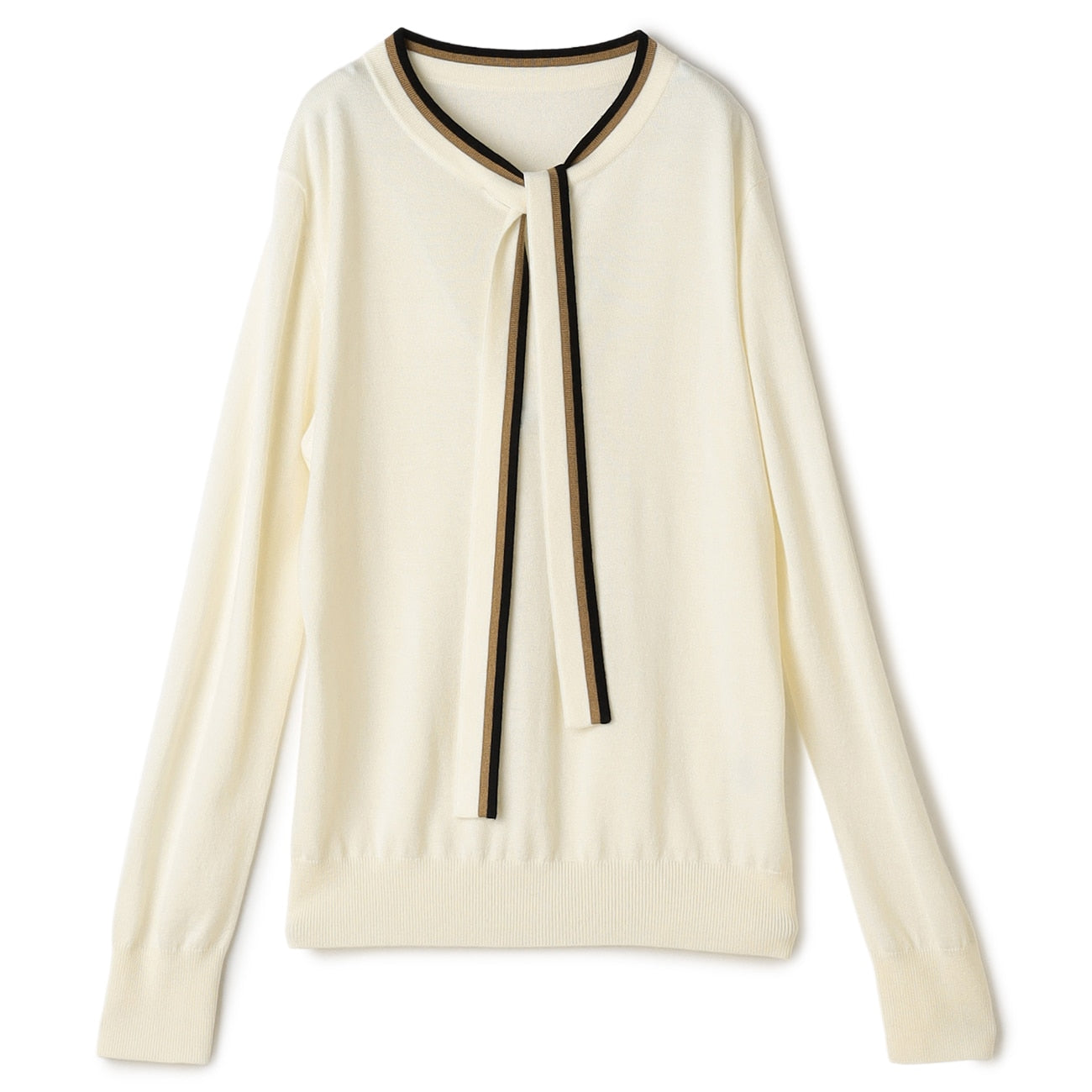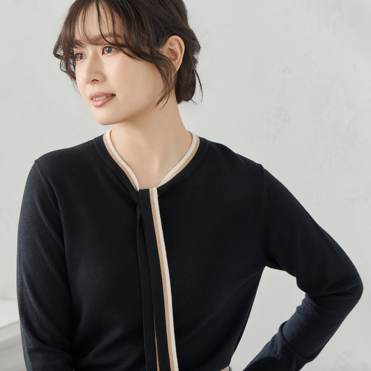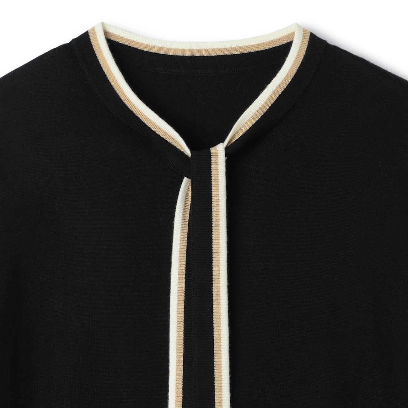 採用柔軟蓬鬆的半精紡羊毛紗線。混紡材質呈現優雅色澤,綢緞特有的細膩光澤更添質感,搭配迷人的對比色蝴蝶結領帶。