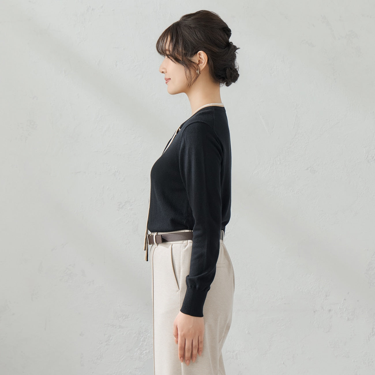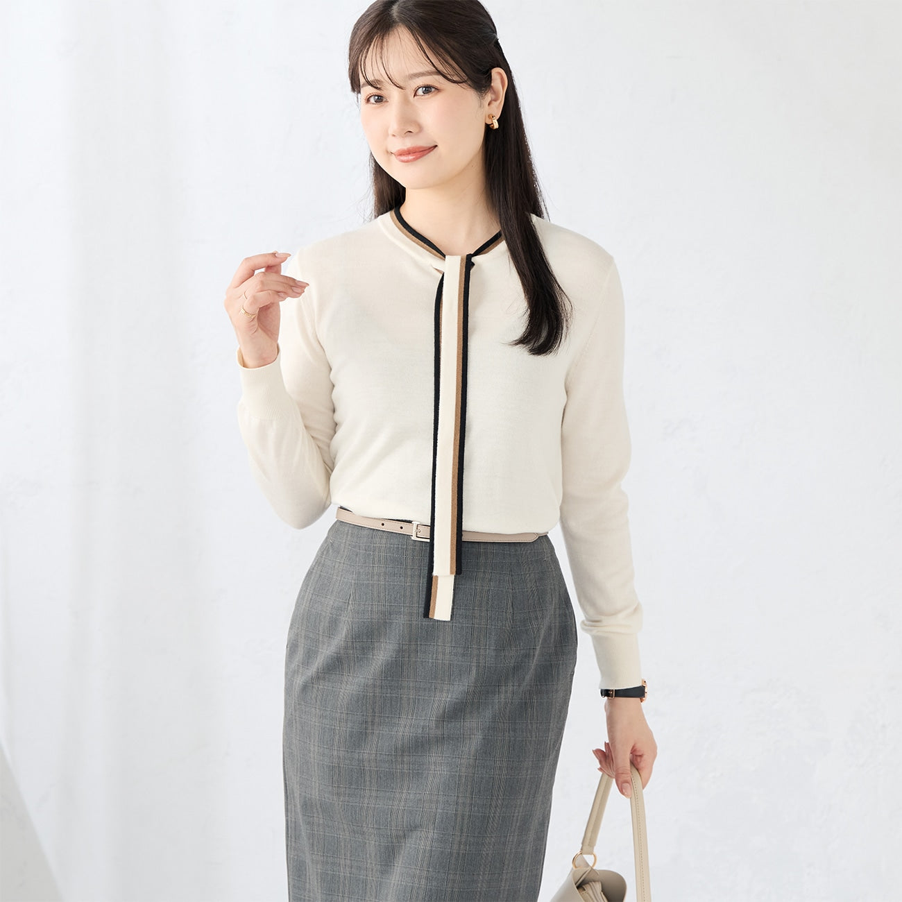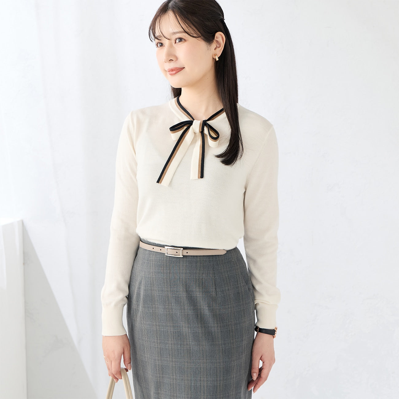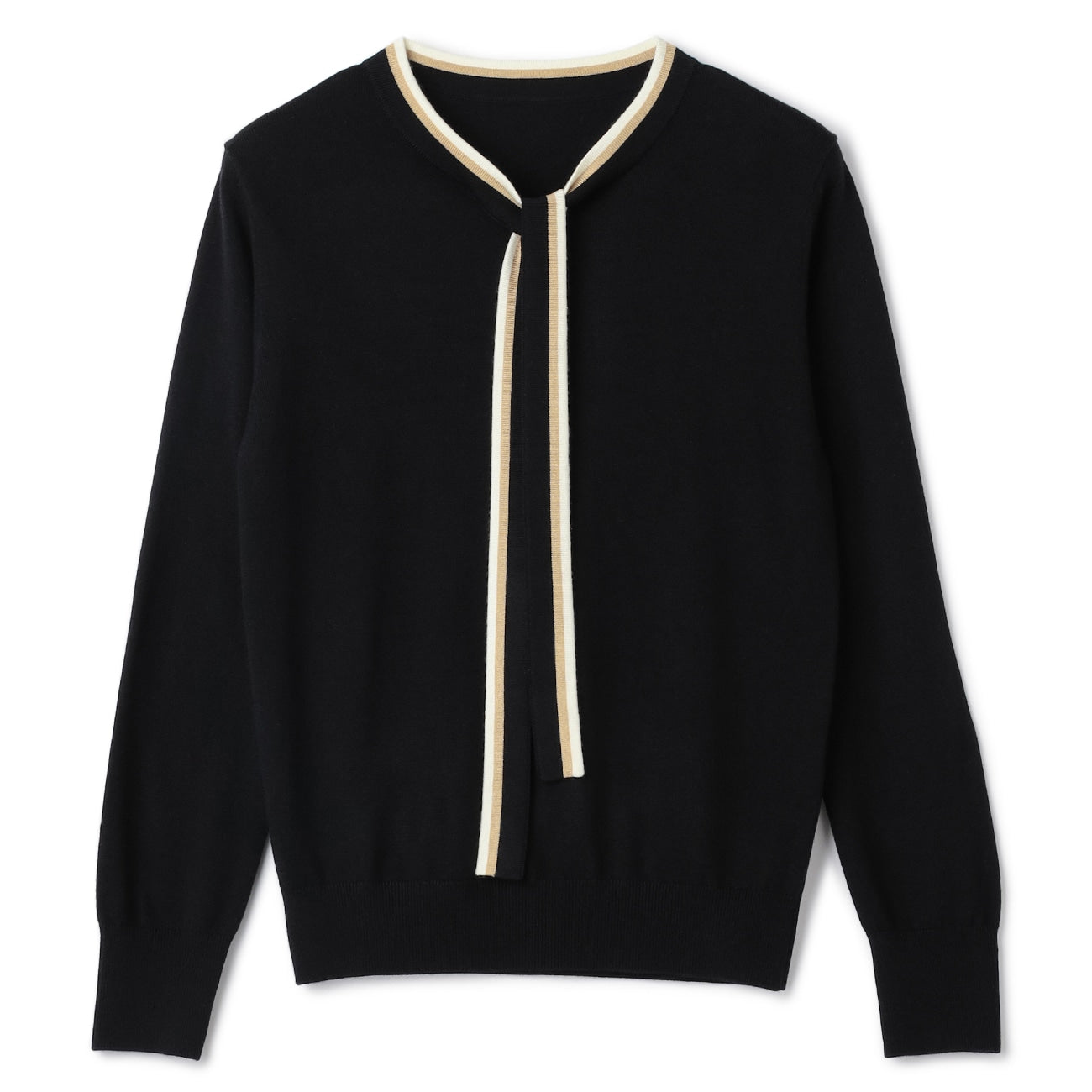 採用柔軟蓬鬆的半精紡羊毛紗線。混紡材質呈現優雅色澤,綢緞特有的細膩光澤更添質感,搭配迷人的對比色蝴蝶結領帶。