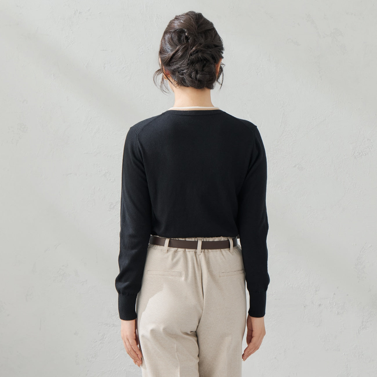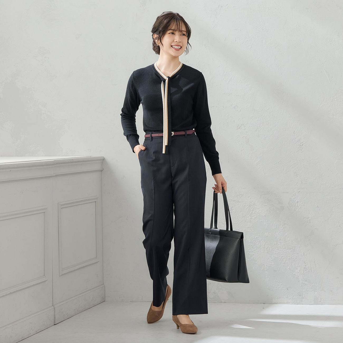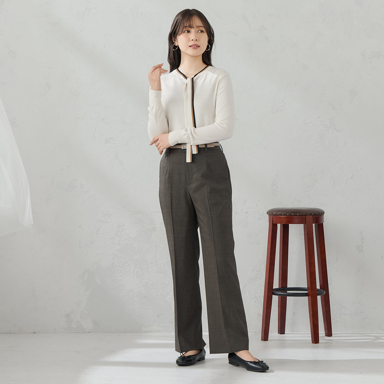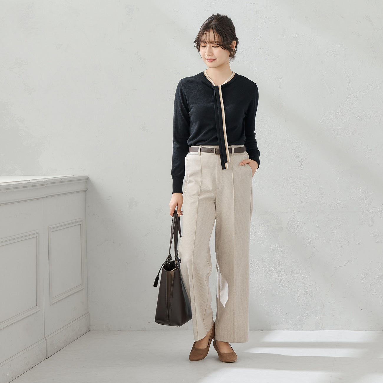 採用柔軟蓬鬆的半精紡羊毛紗線。混紡材質呈現優雅色澤,綢緞特有的細膩光澤更添質感,搭配迷人的對比色蝴蝶結領帶。
