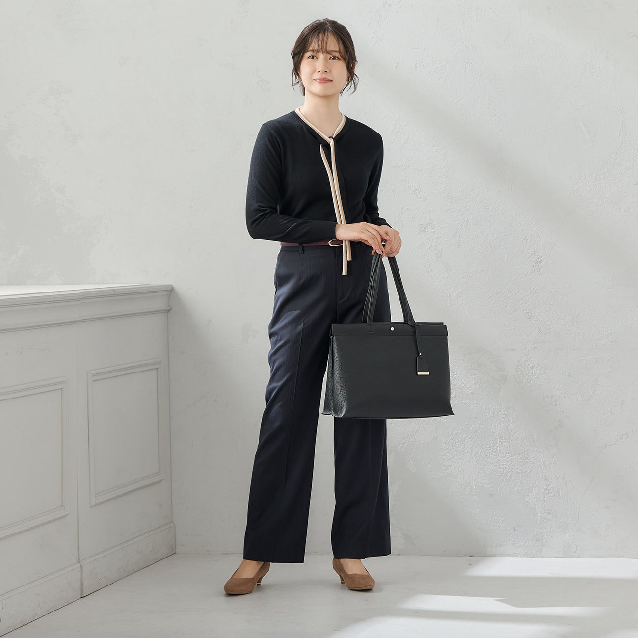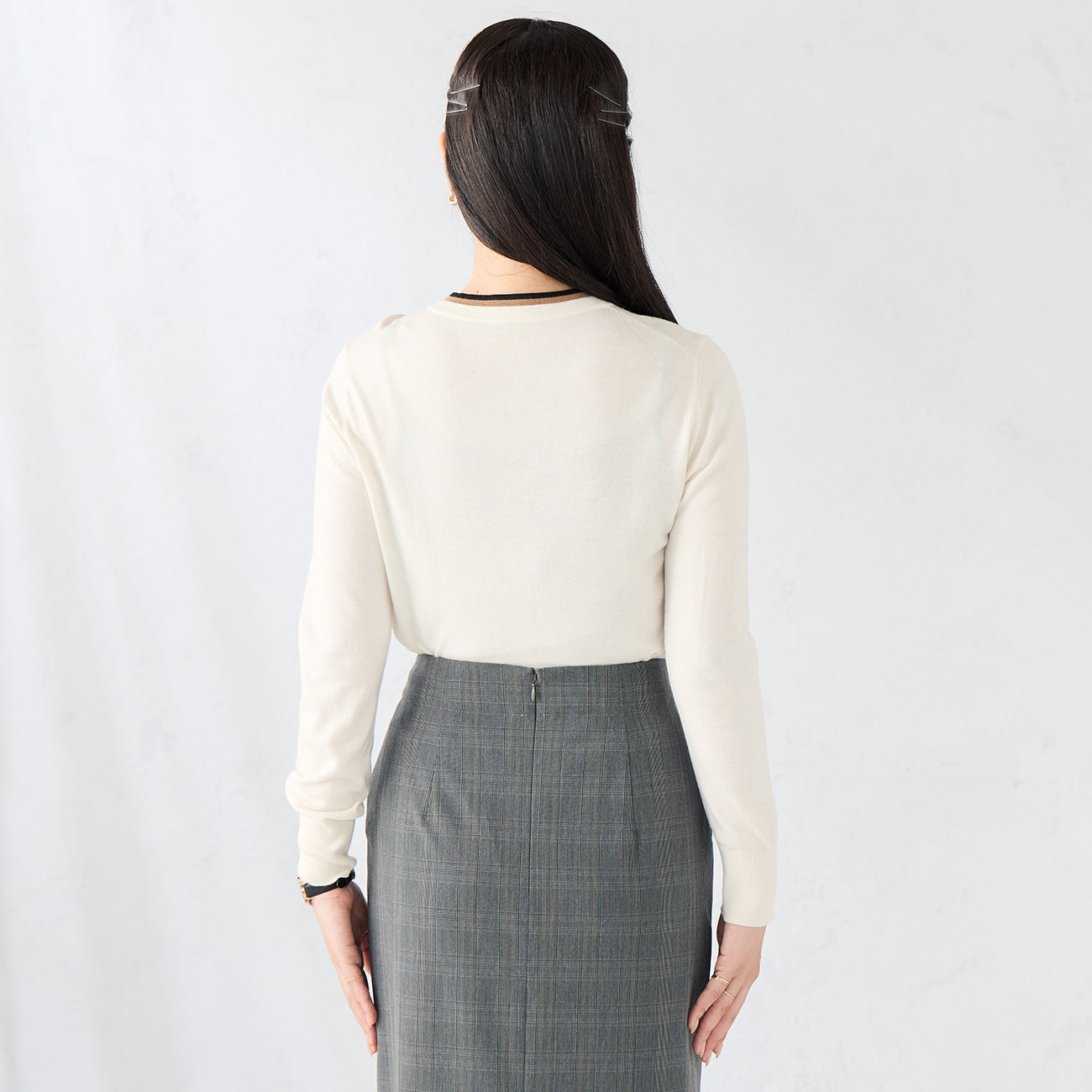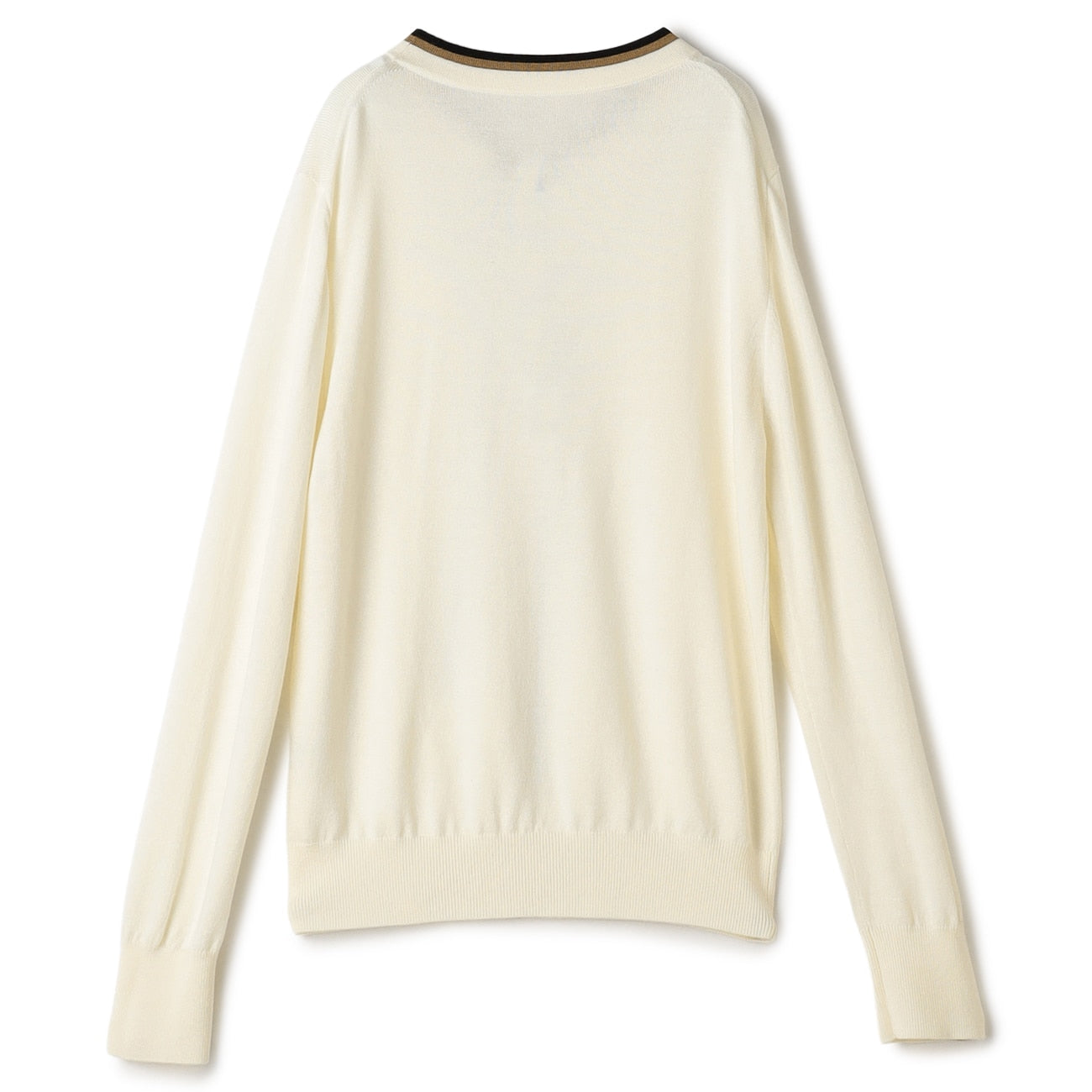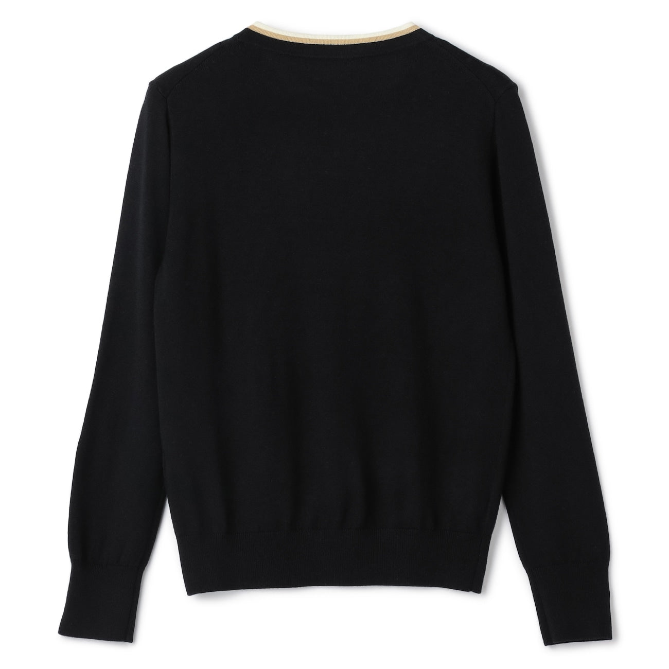 採用柔軟蓬鬆的半精紡羊毛紗線。混紡材質呈現優雅色澤,綢緞特有的細膩光澤更添質感,搭配迷人的對比色蝴蝶結領帶。