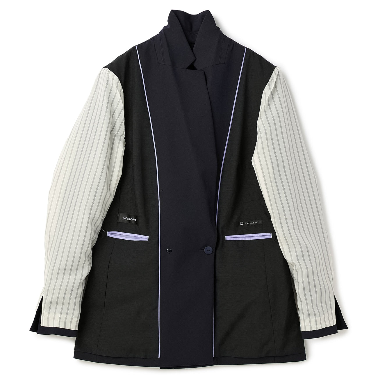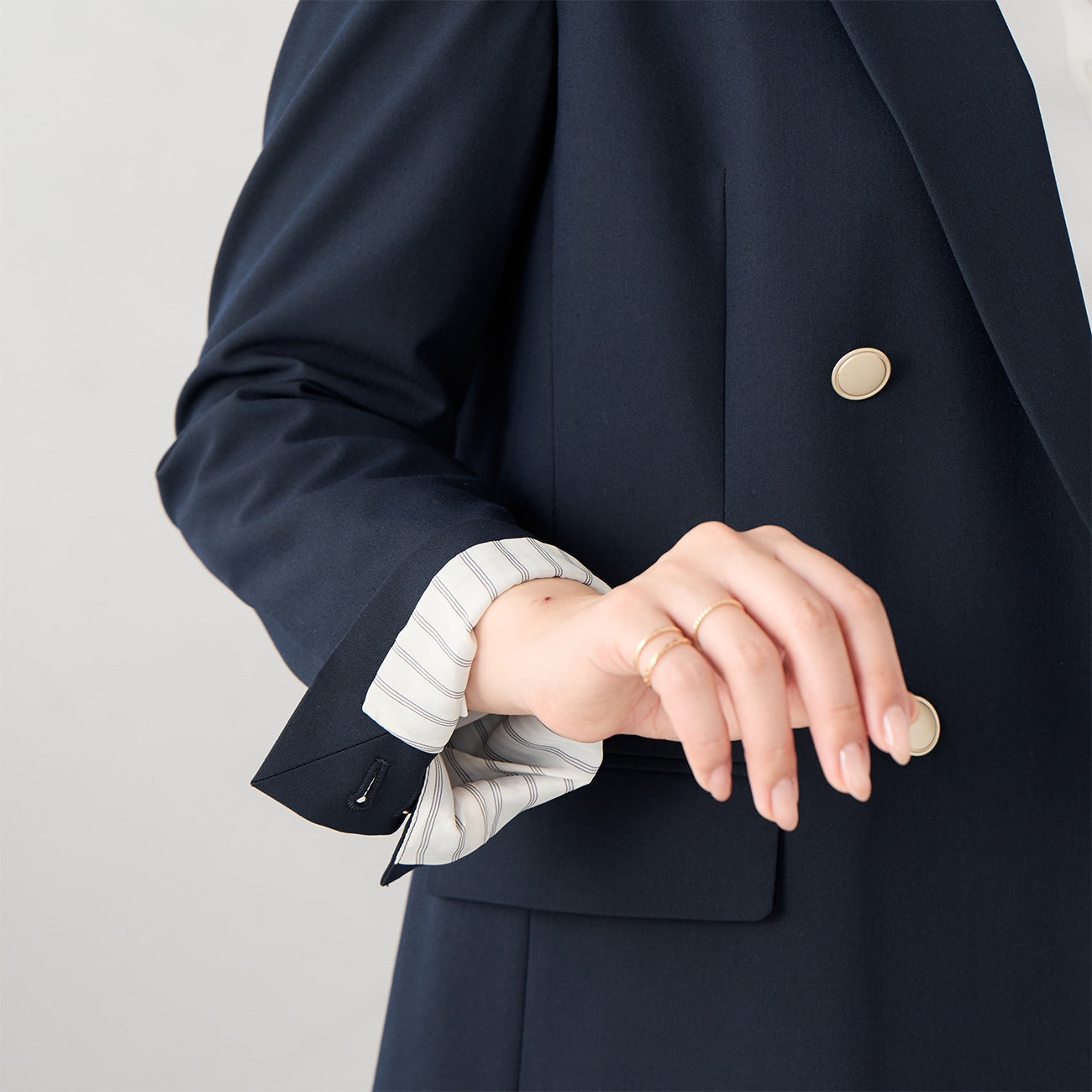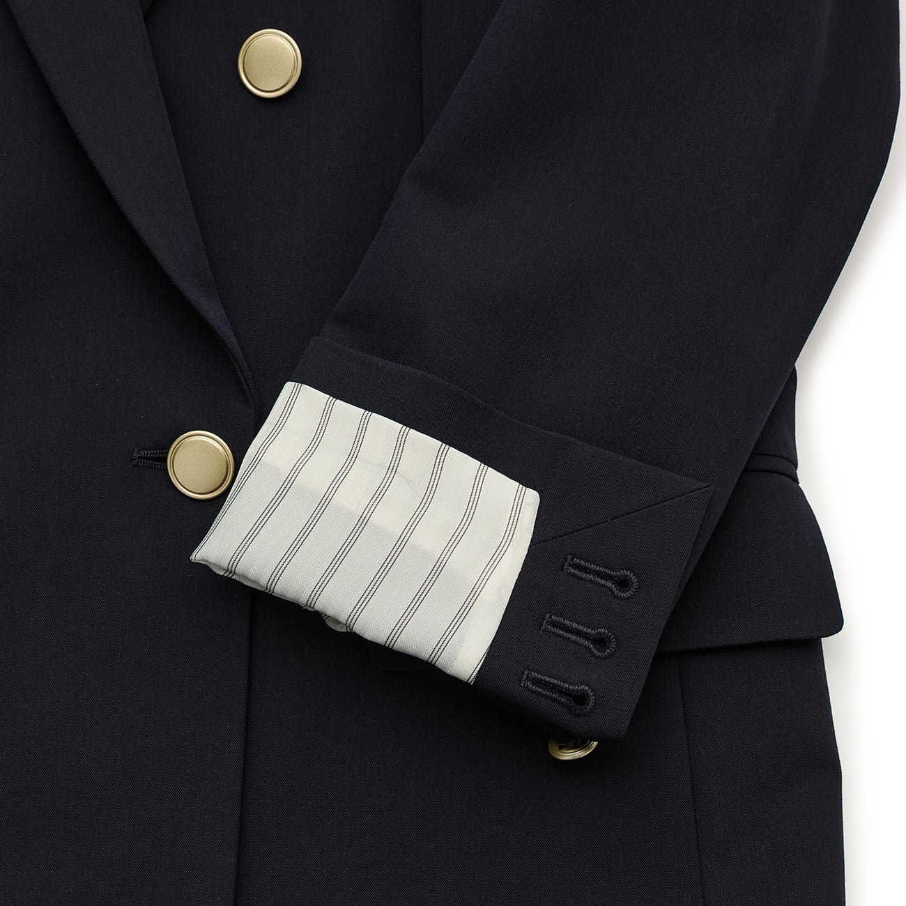 Matte 鈕扣與優雅的條紋襯裡,在袖口捲起時清晰可見,成為時尚的點綴。