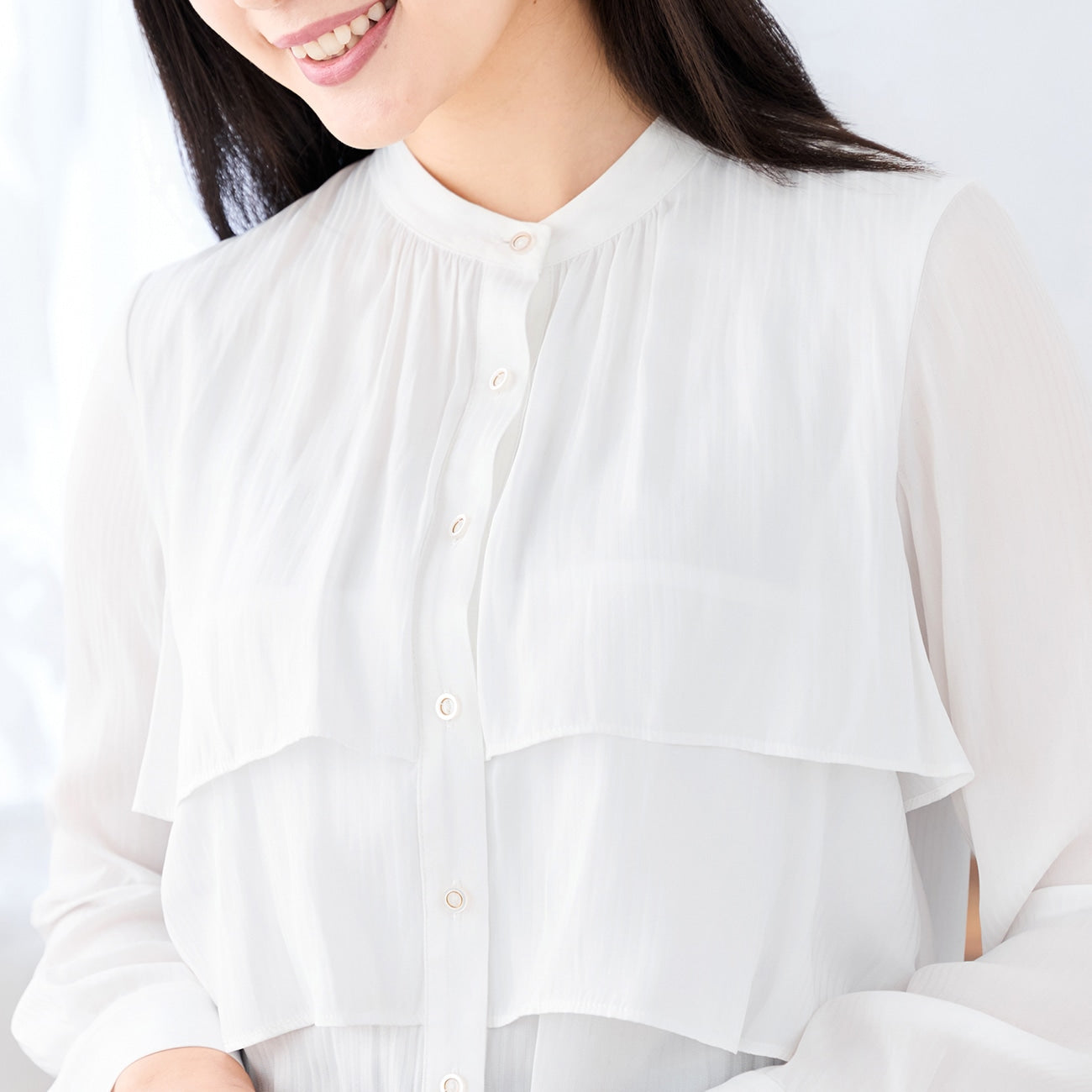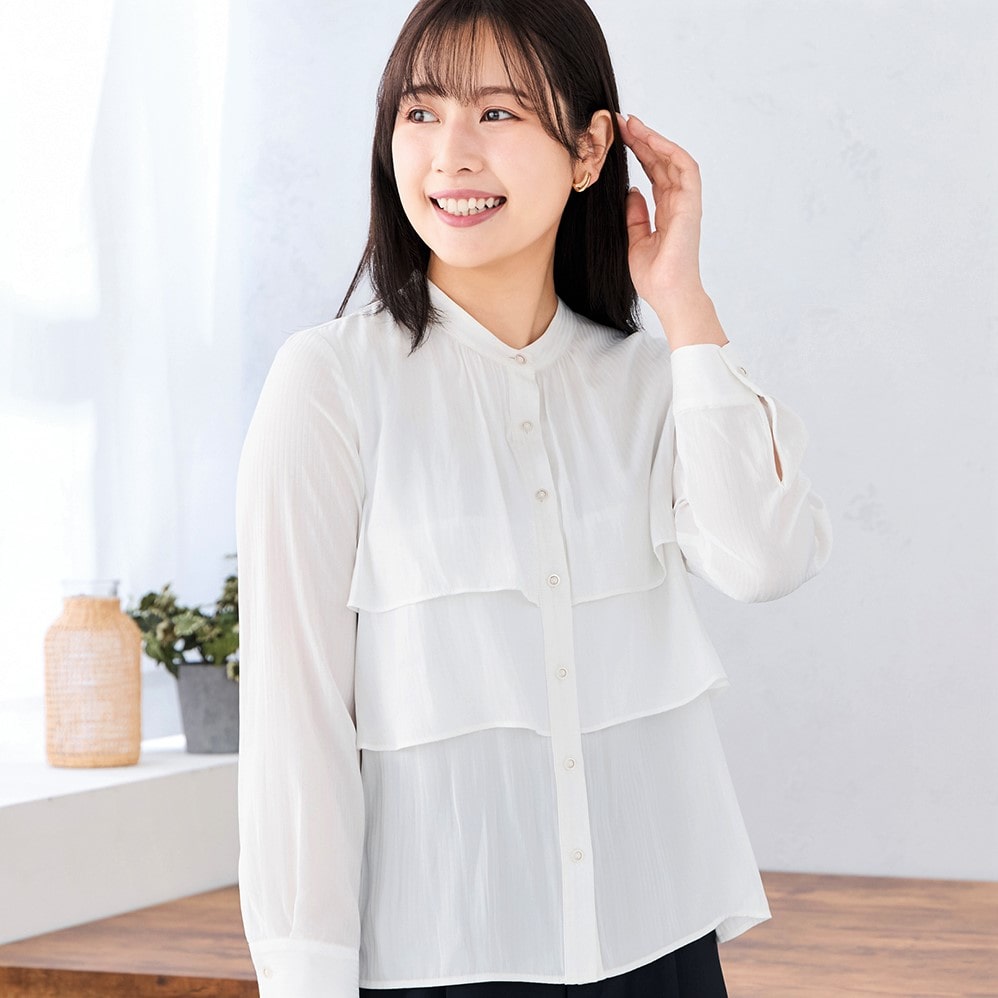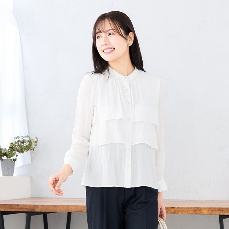 Two-tiered ruffle layering on the chest adds movement and gorgeousness to white blouses that tend to be monotonous. Soft and sheer material gives a light and cool impression.