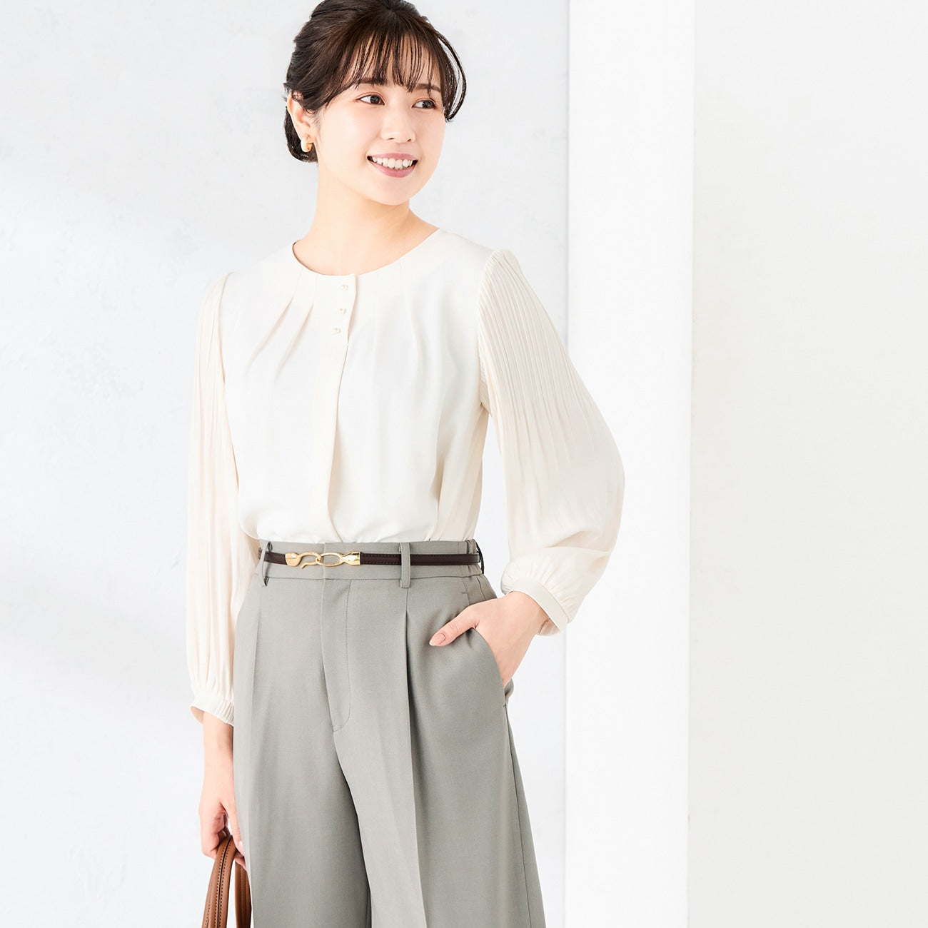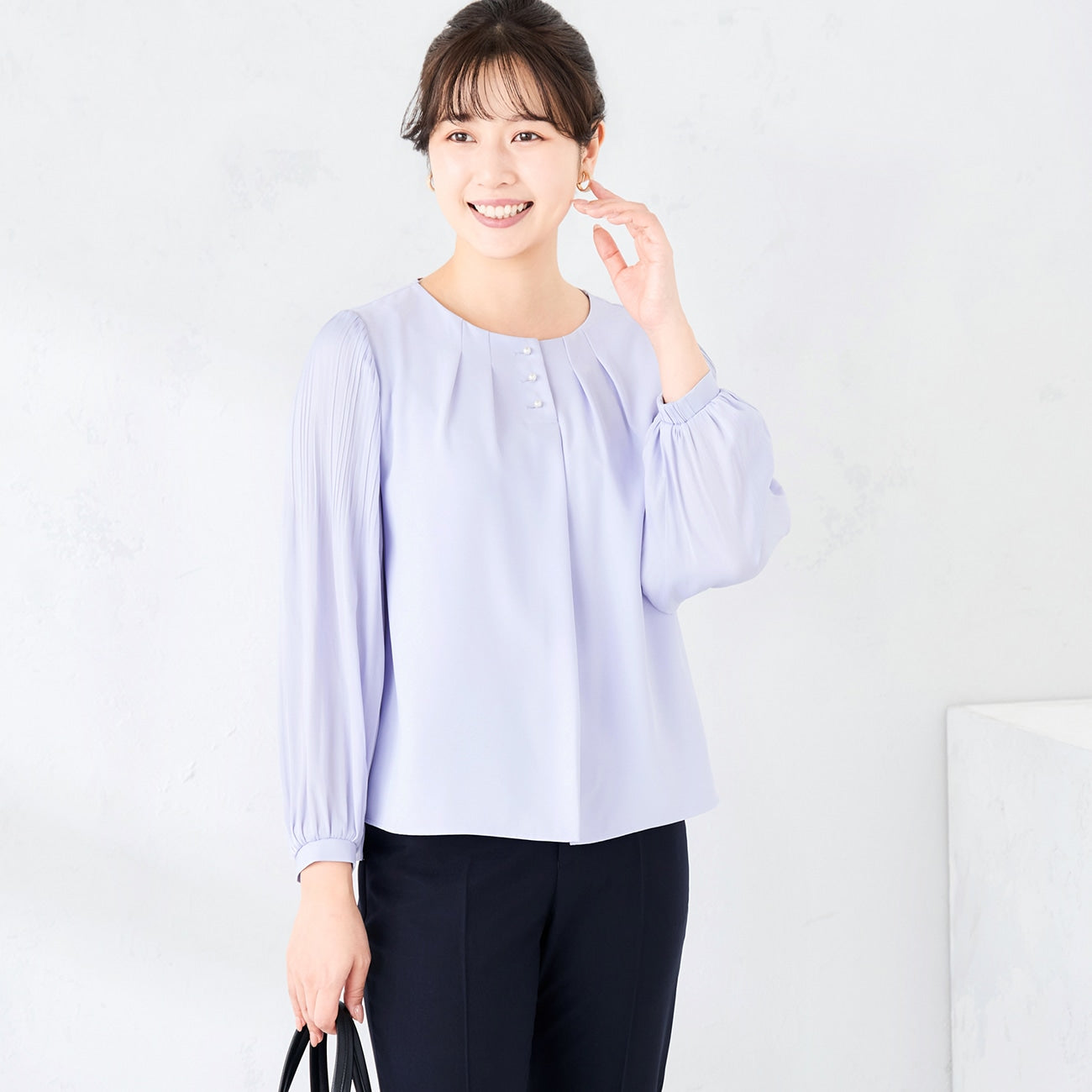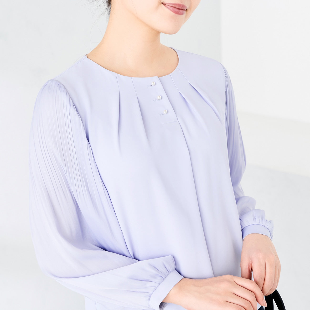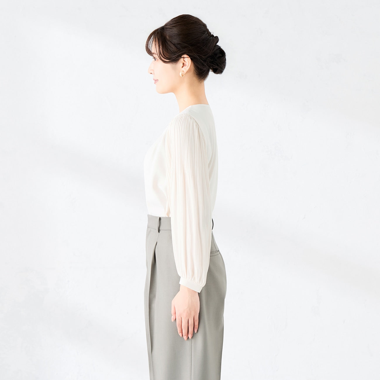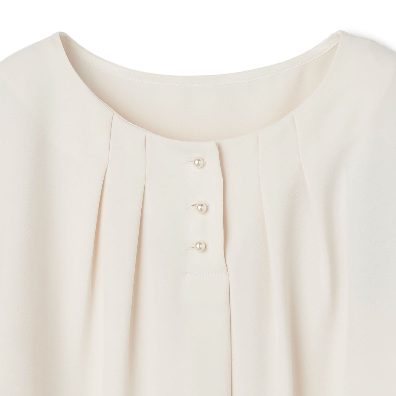 The neck is a round neck that shows the decollete beautifully. Modest tucks and pearl buttons placed on the front are classic accents. Side slits with front-back difference, easy to balance even when worn tucked out, casually covers around the hips.