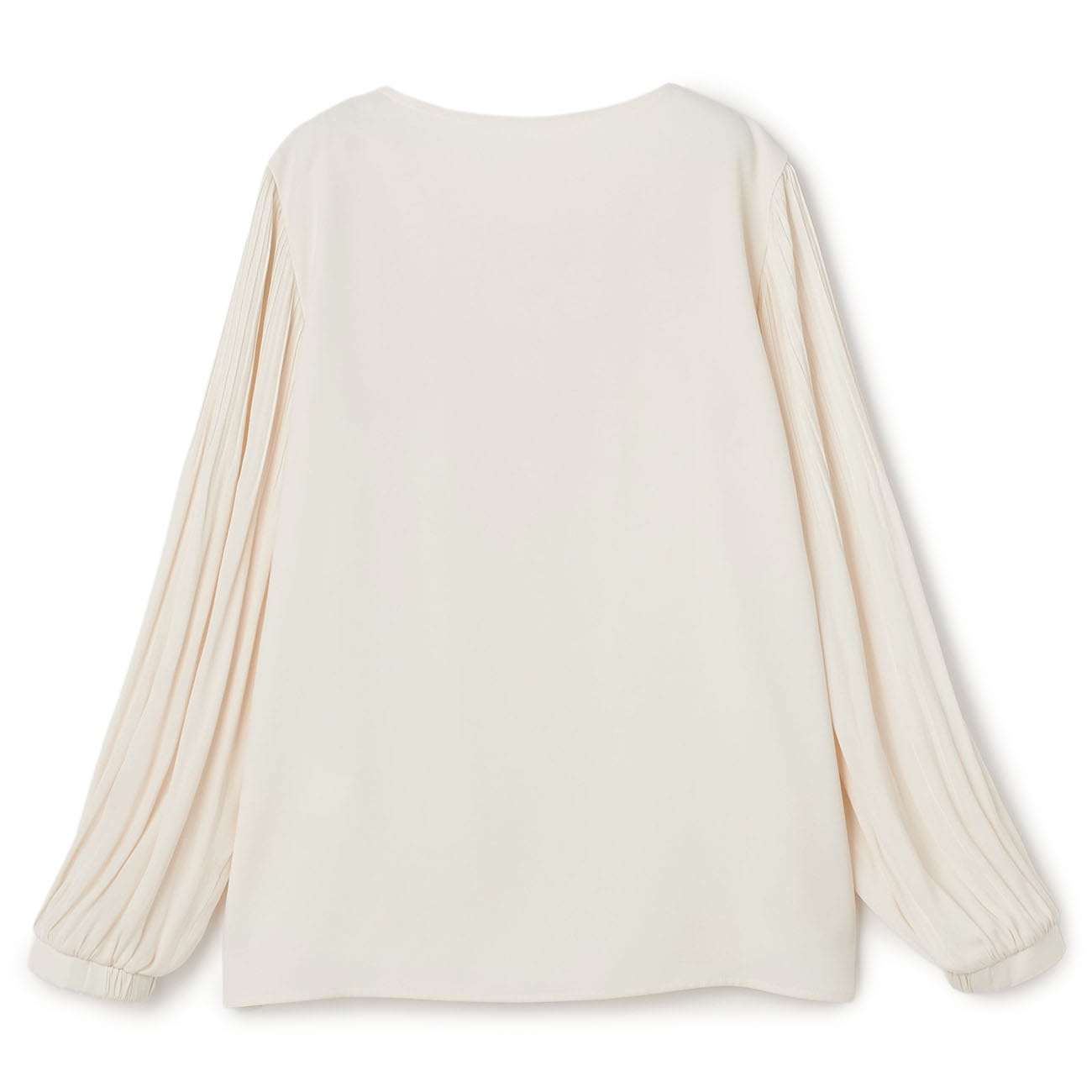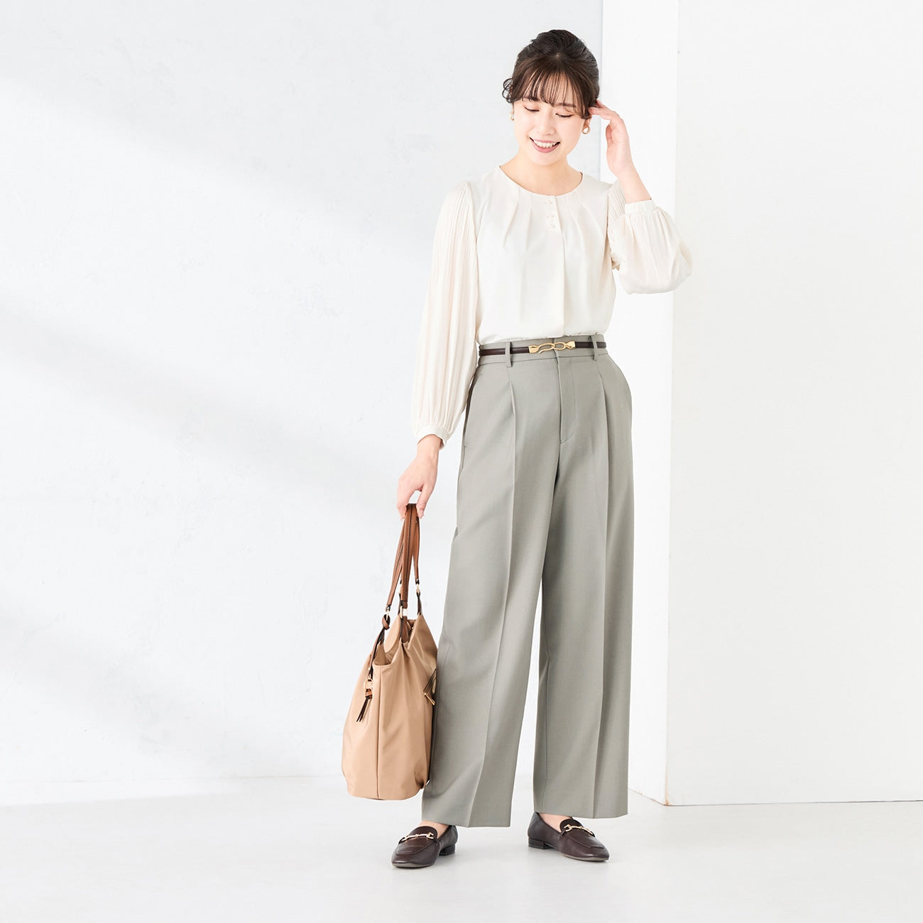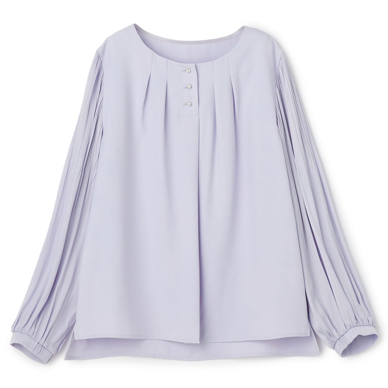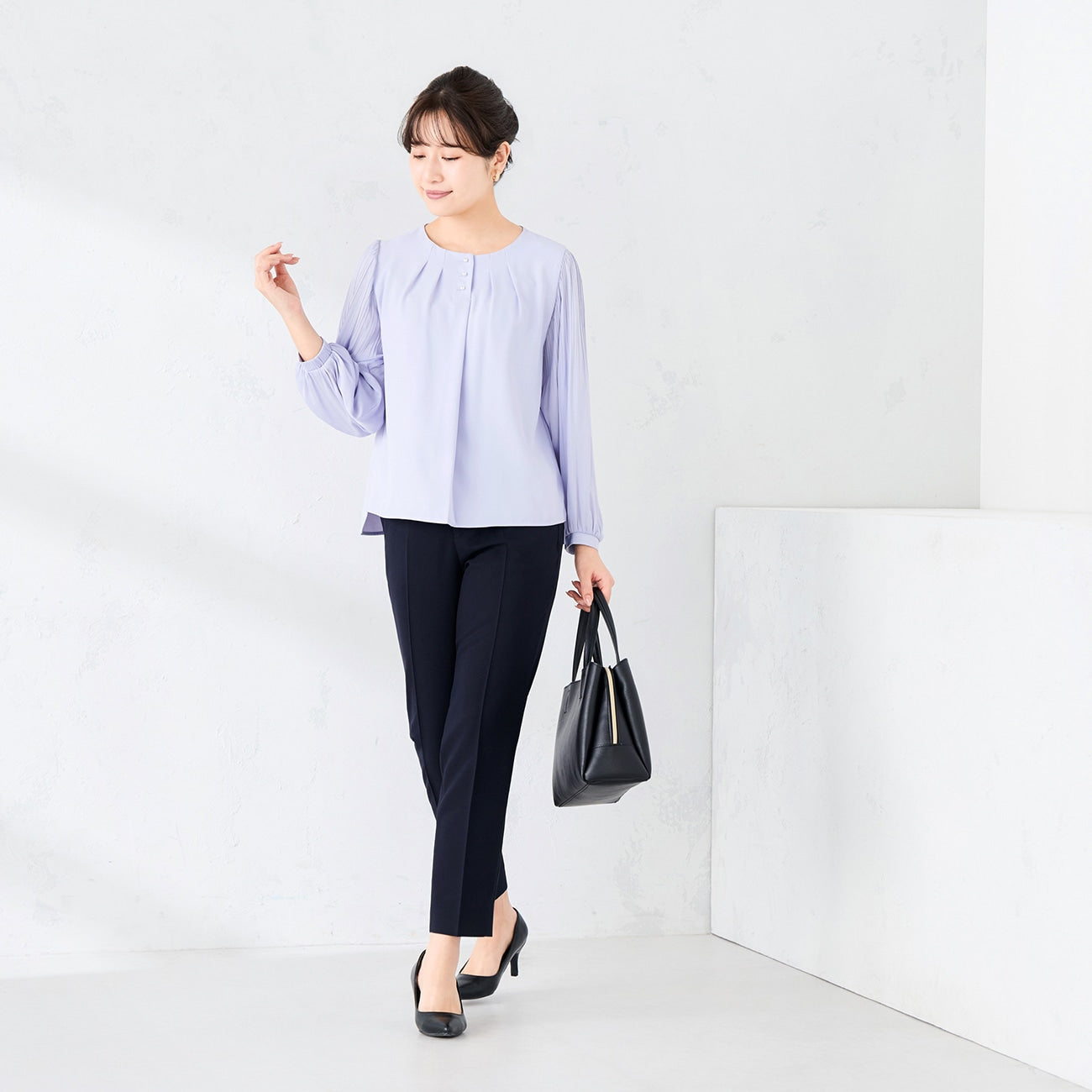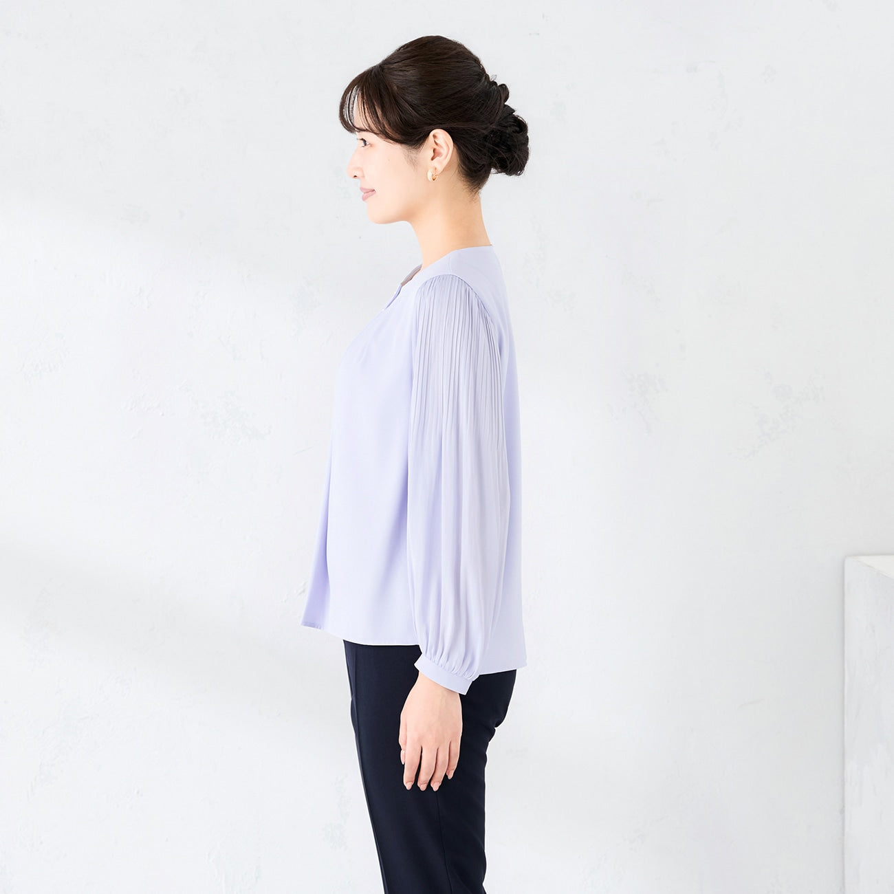 The neck is a round neck that shows the decollete beautifully. Modest tucks and pearl buttons placed on the front are classic accents. Side slits with front-back difference, easy to balance even when worn tucked out, casually covers around the hips.