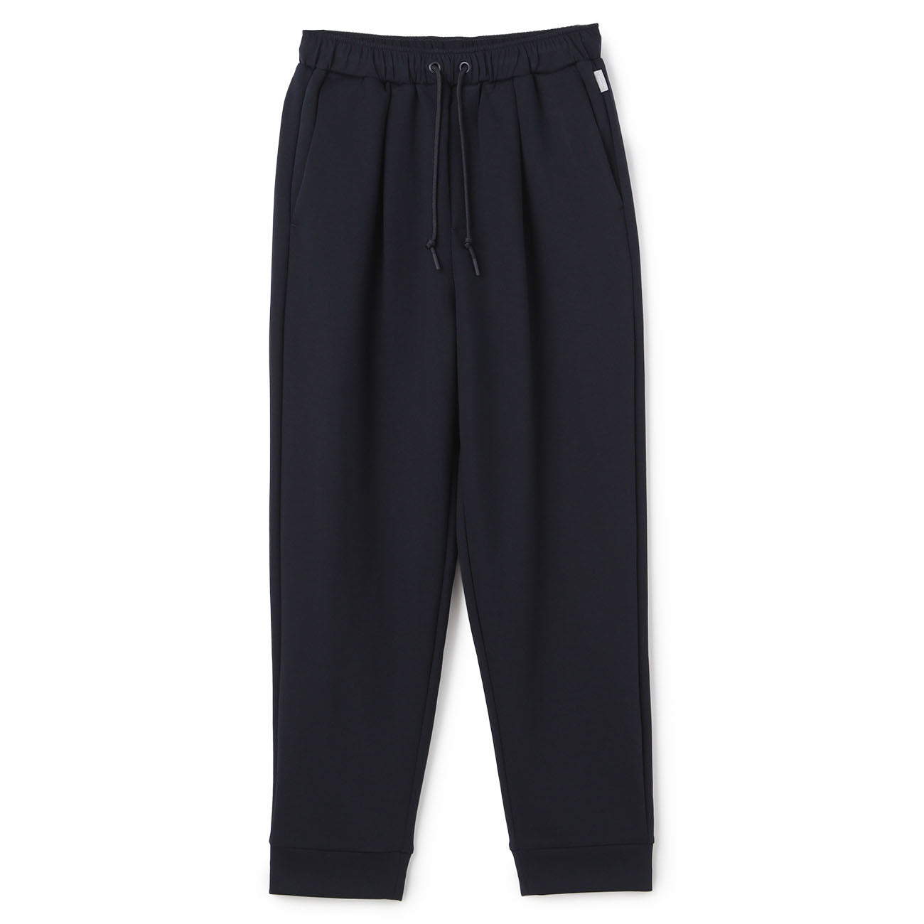 Deep rise with relaxed hips, outer drawstring, side pockets, single right back pocket, tapered hem with self-fabric panel
