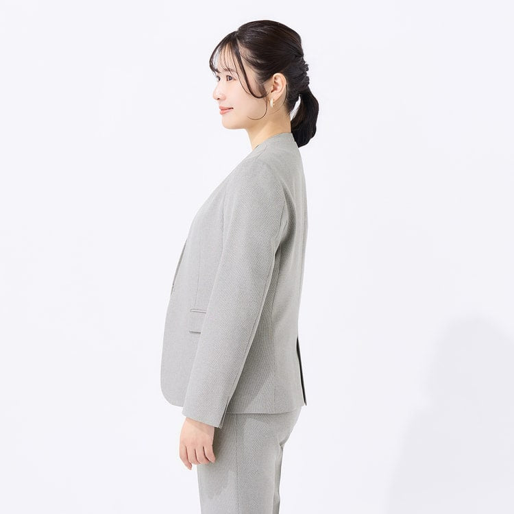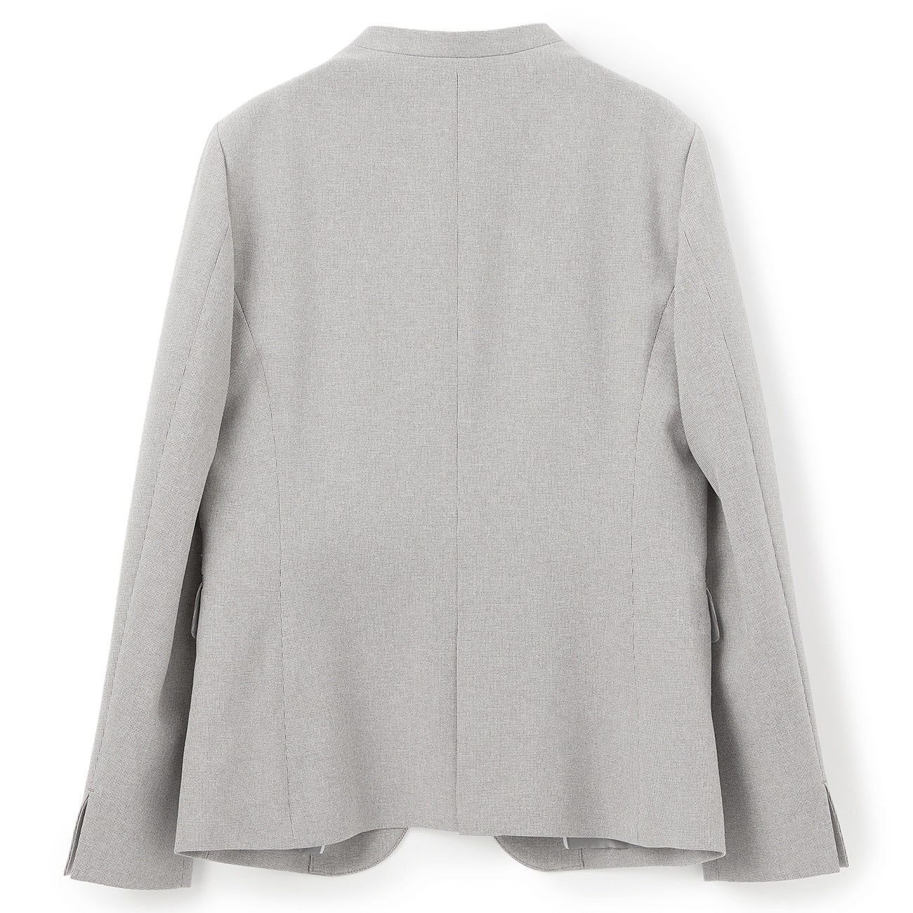 無領西裝外套、半內裏、前鉤扣、袖口可翻折、腰部、內側有口袋