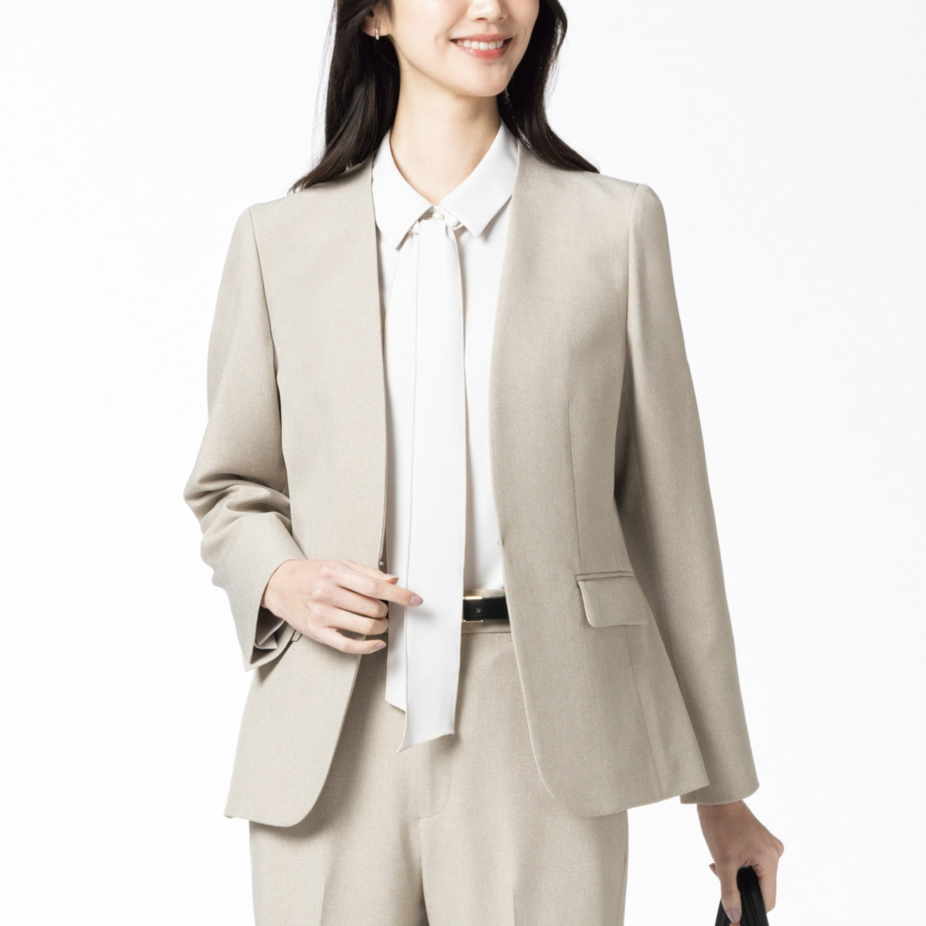 The clean-cut collarless neckline creates a sleek look that pairs perfectly with T-shirts for a refined office-casual style or with blouses for an elegant ceremony, offering endless styling options.