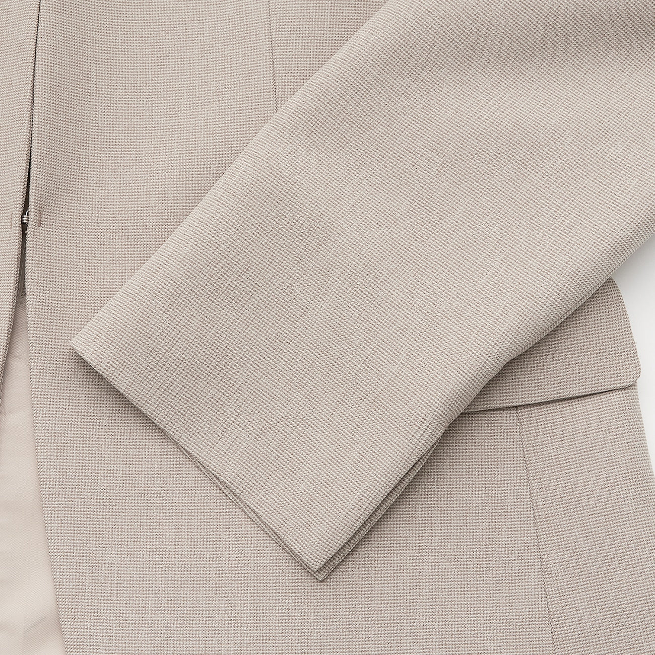 無領西裝外套、半內裏、前鉤扣、袖口可翻折、腰部、內側有口袋