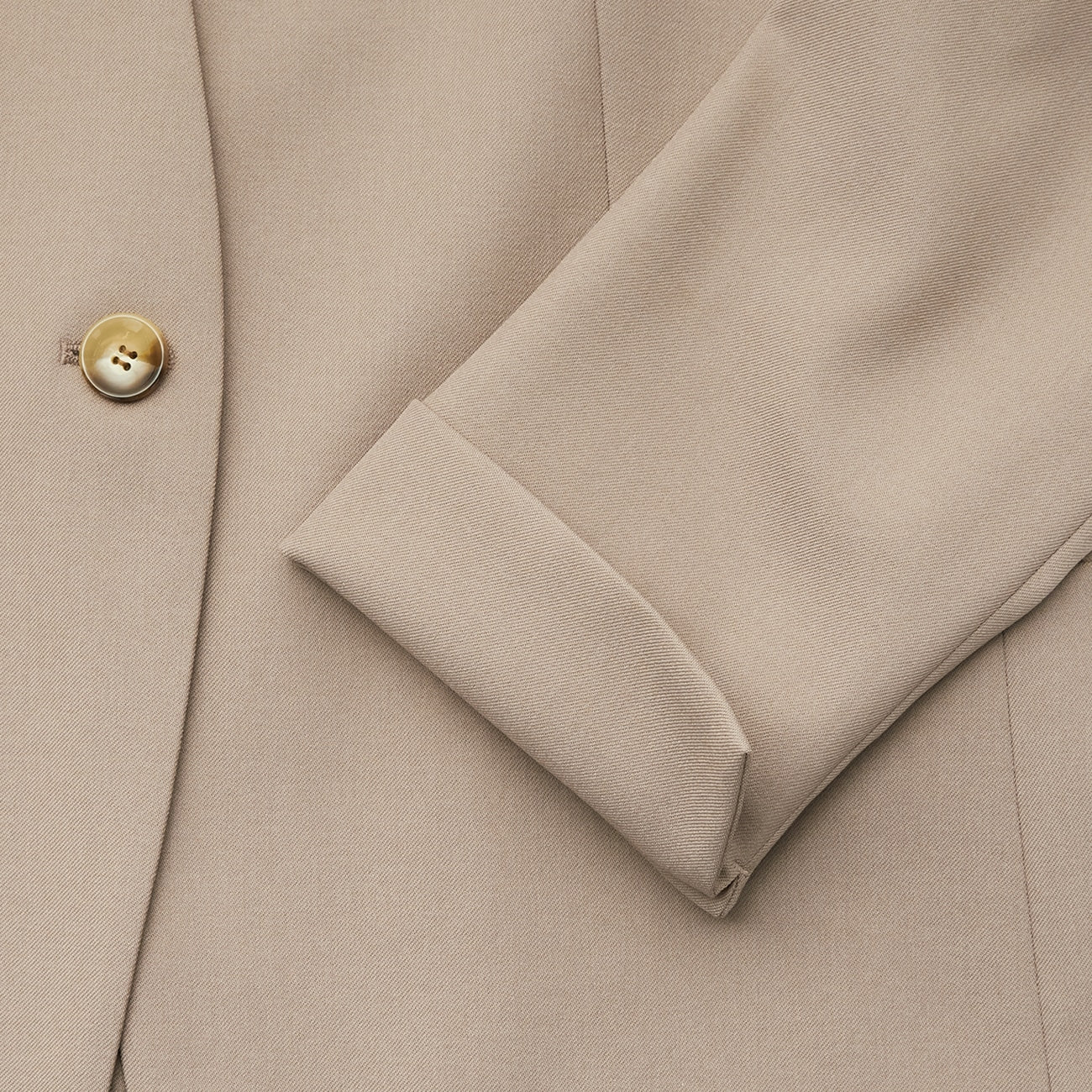 Collarless, half-lined, front 1 button, return cuffs, waist pockets, inner pockets